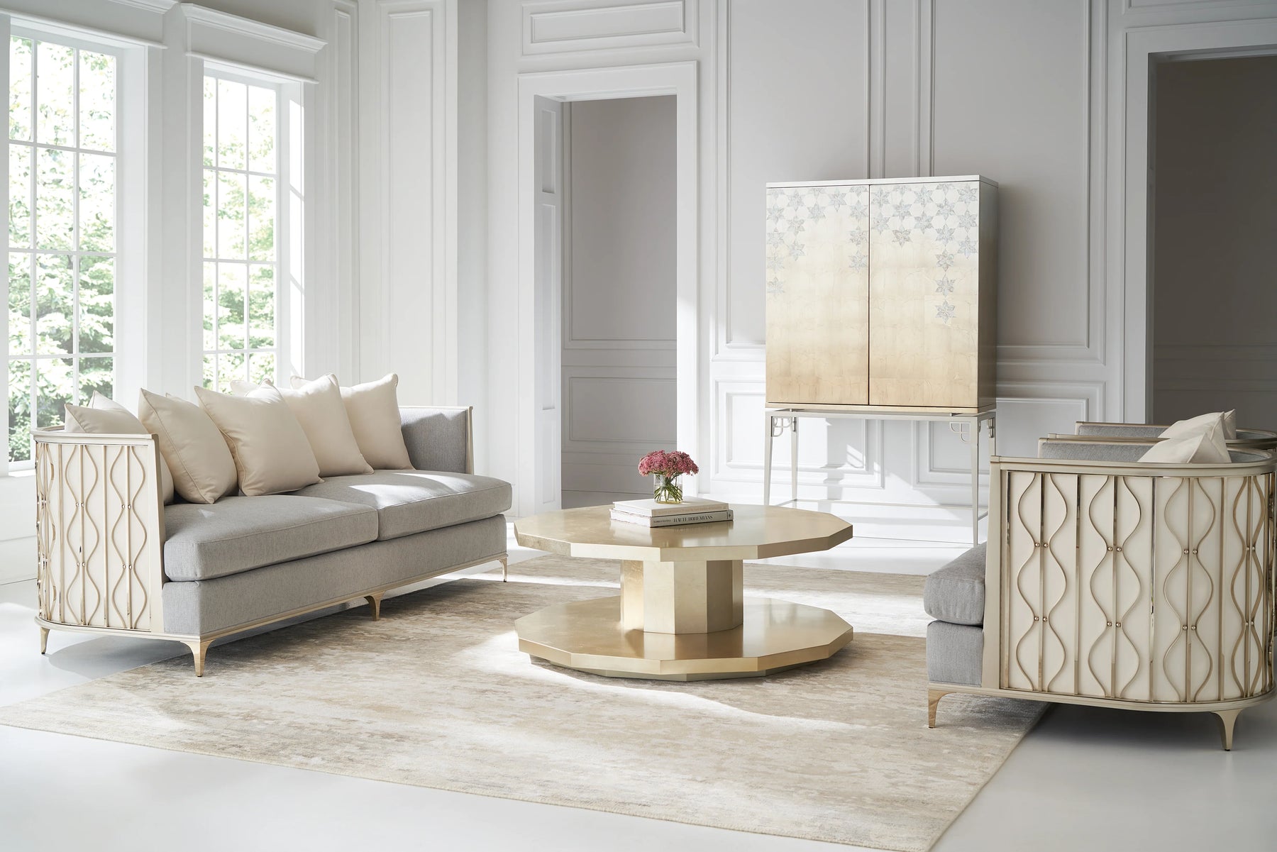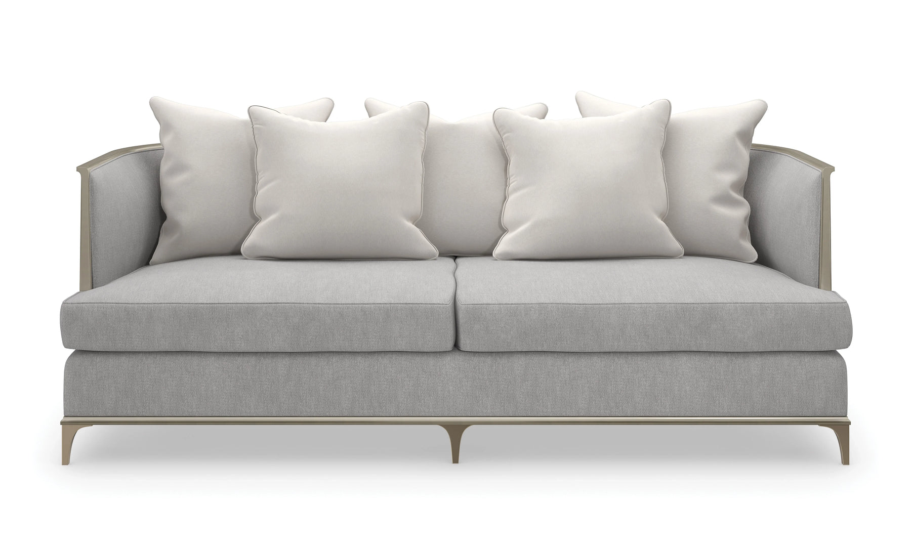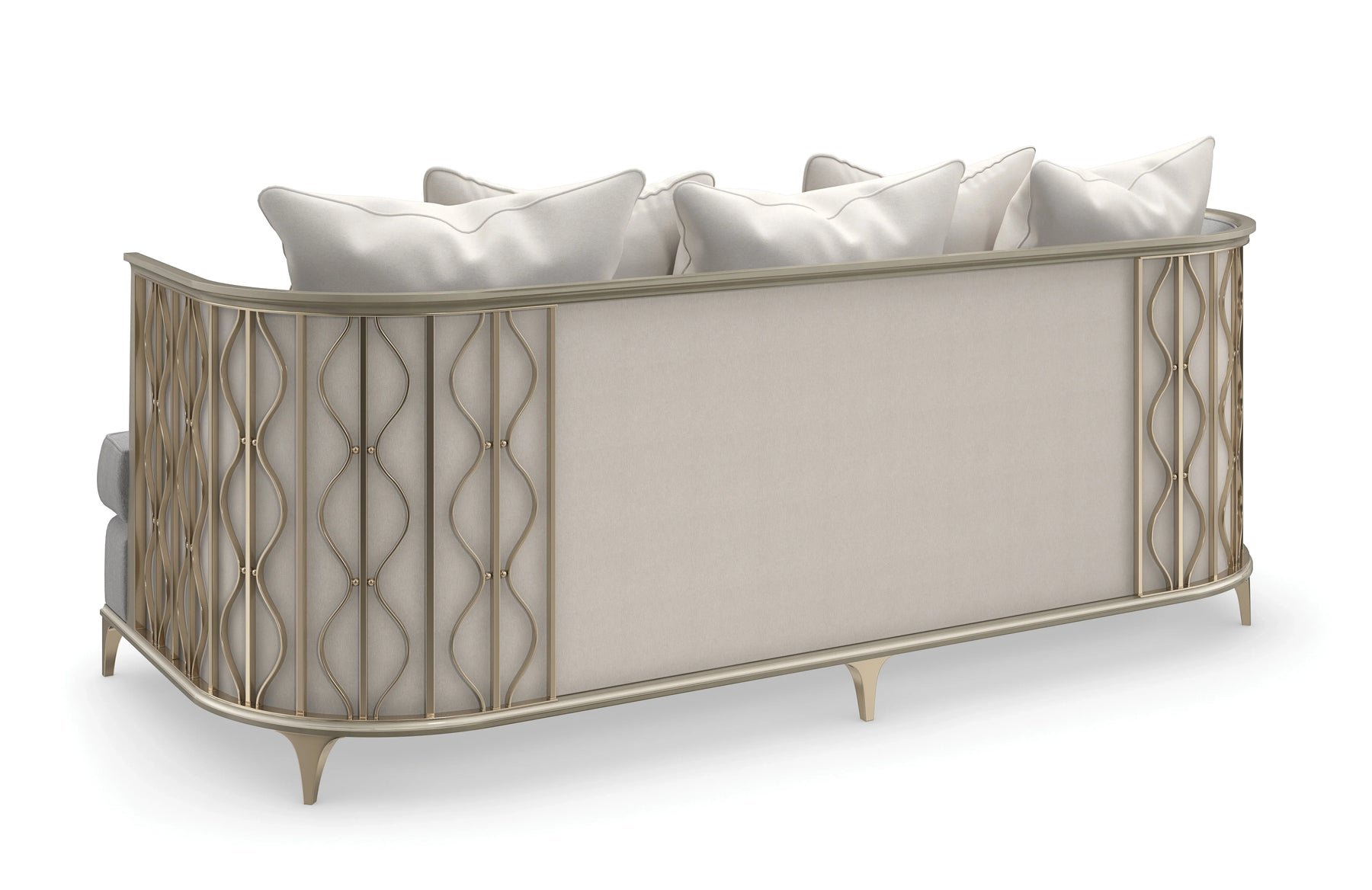 Artful and alluring in a luxe material mix, this sheltering sofa captures the tranquil beauty of gently swaying kelp ribbons beneath the waves in a coral reef. Wrapping the back: a shimmering layer of champagne faux silk framed beneath rippling metal bands and pearl-like beads in a Whisper of Gold for added dimension on either end. Finely tailored in a silver micro-chenille performance fabric with gold foil accent yarns for added glimmer.