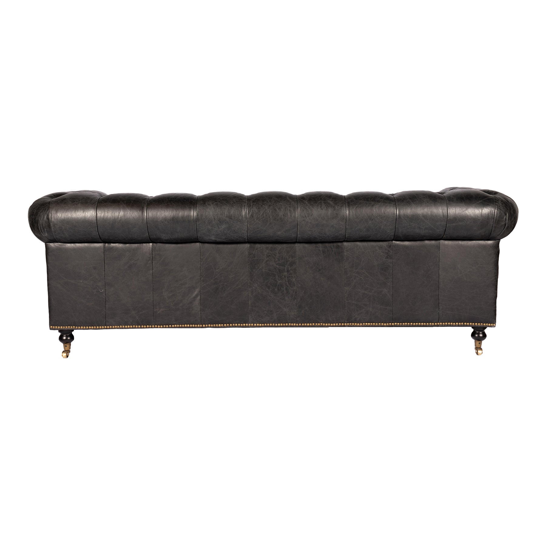 Crafted from leather, the Birmingham Sofa Onyx Black Leather reflects Moe's commitment to quality materials and considered construction. The black finish brings a modern warmth to the piece that pairs naturally with a variety of interior palettes. Sharp details are apparent in the chesterfield's tufted back, rolled arms, and meticulously placed brass detailing—pairs nicely with an Old Fashioned. The frame is built for long-term durability, with a construction that maintains its shape and comfort through years of daily use.