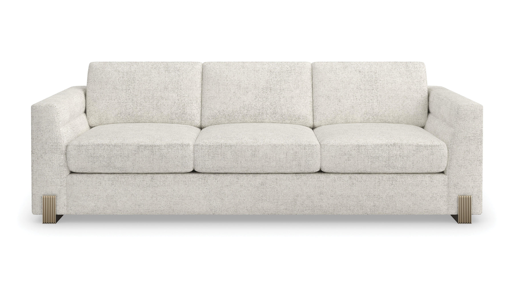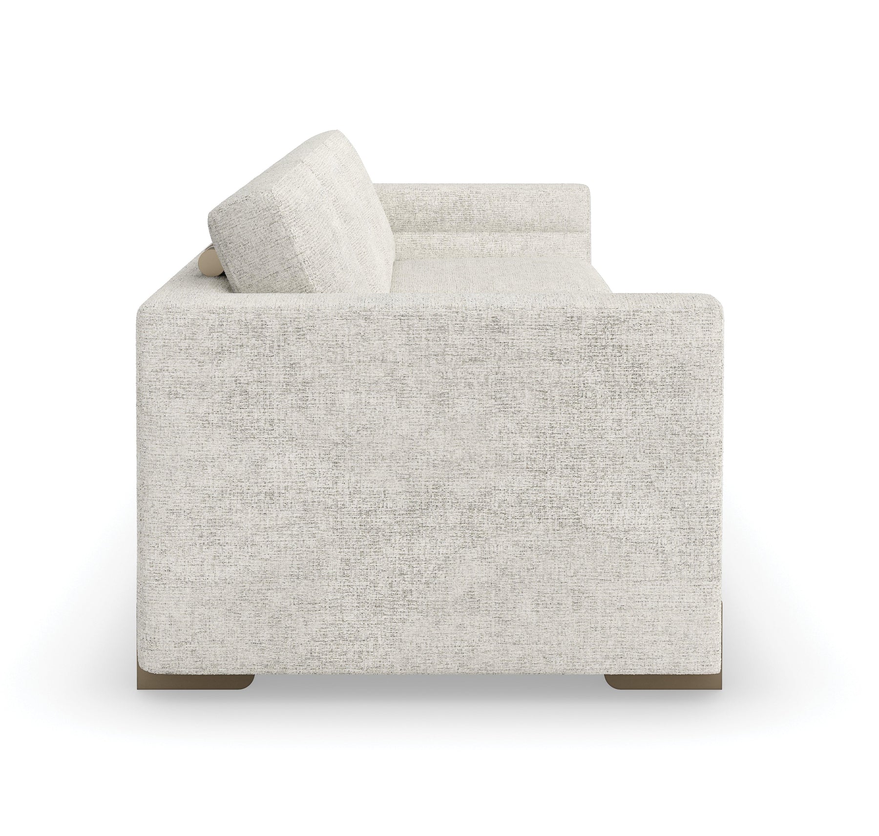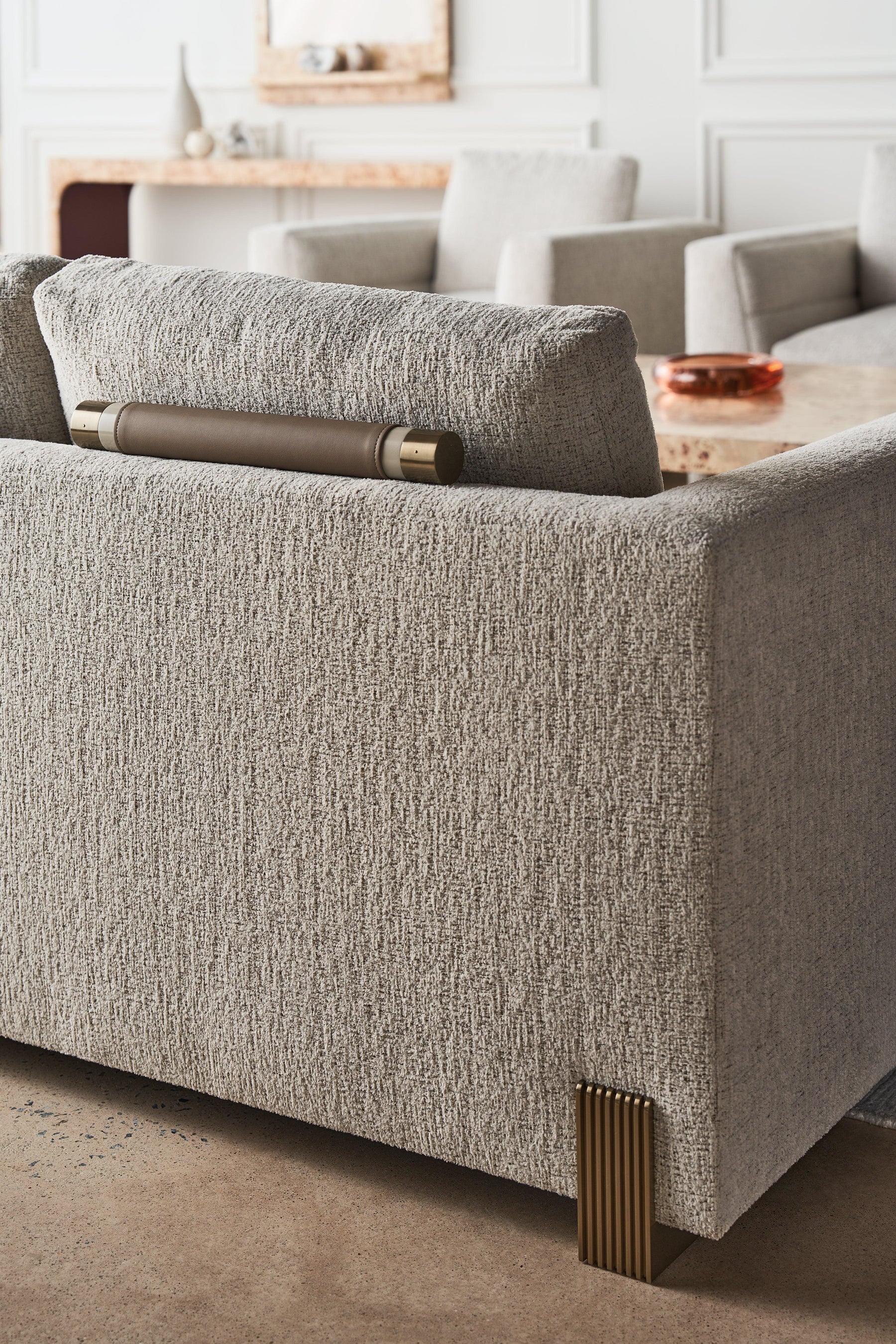 A refined mix of texture and material, the Counter Balance sofa is soft-lined yet sophisticated in an oatmeal melange woven fabric with subtle rust threading. Channel-tufted arms with a slightly angled taper comfortably enclose its loose seat back cushions, propped by a faux-leather-wrapped, counter balance capped in Champagne Gold. Reeded cast legs add tactile appeal and a note of distinction. The frame is built to the exacting tolerances Caracole maintains across its upholstered collection, with fabric applied to precise seam lines and cushion profiles engineered to maintain their shape and density over years of use.