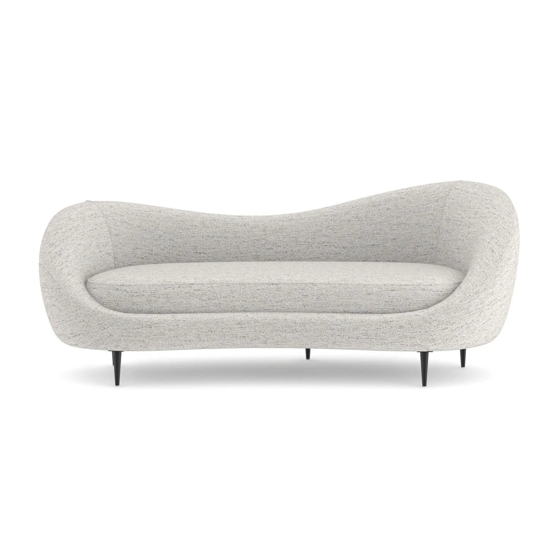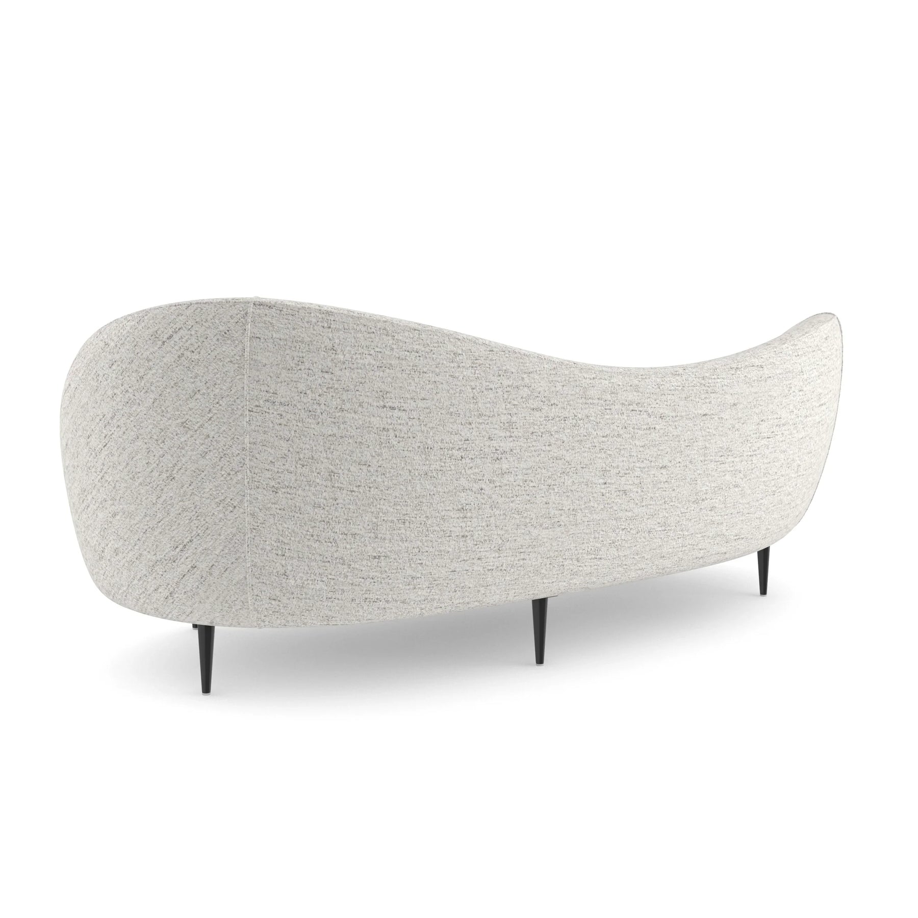 The curvy, wraparound comfort of this sofa is undeniable. Its plush, asymmetrical traveling back produces a highly sinuous shape. Fully-upholstered in lustrous woven chenille with a mélange of steel blue/grey flecks, this bean-shaped piece rests on delicate conical metal legs in Piano Black. The frame is built to the exacting tolerances Caracole maintains across its upholstered collection, with fabric applied to precise seam lines and cushion profiles engineered to maintain their shape and density over years of use.