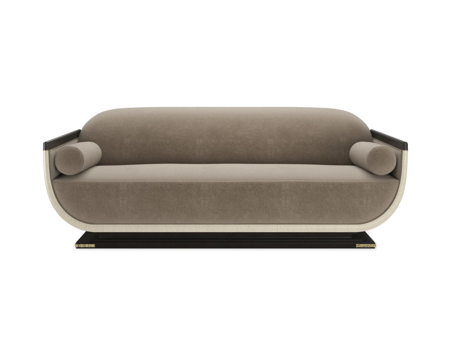 A modern interpretation of classic Roman shapes, this sofa is remarkable for its length and deep-scooped wood frame with an Ivory Craze crackled finish that is trimmed with Brushed Gold paint. The frame is perched on a wood-tiered base in Charred Bark with Brushed Gold metal corner appliques. This regal chairs inside frame and plush cushion showcase a faux mohair velvet fabric in Mushroom. The frame is built to the exacting tolerances Caracole maintains across its upholstered collection, with fabric applied to precise seam lines and cushion profiles engineered to maintain their shape and density over years of use.