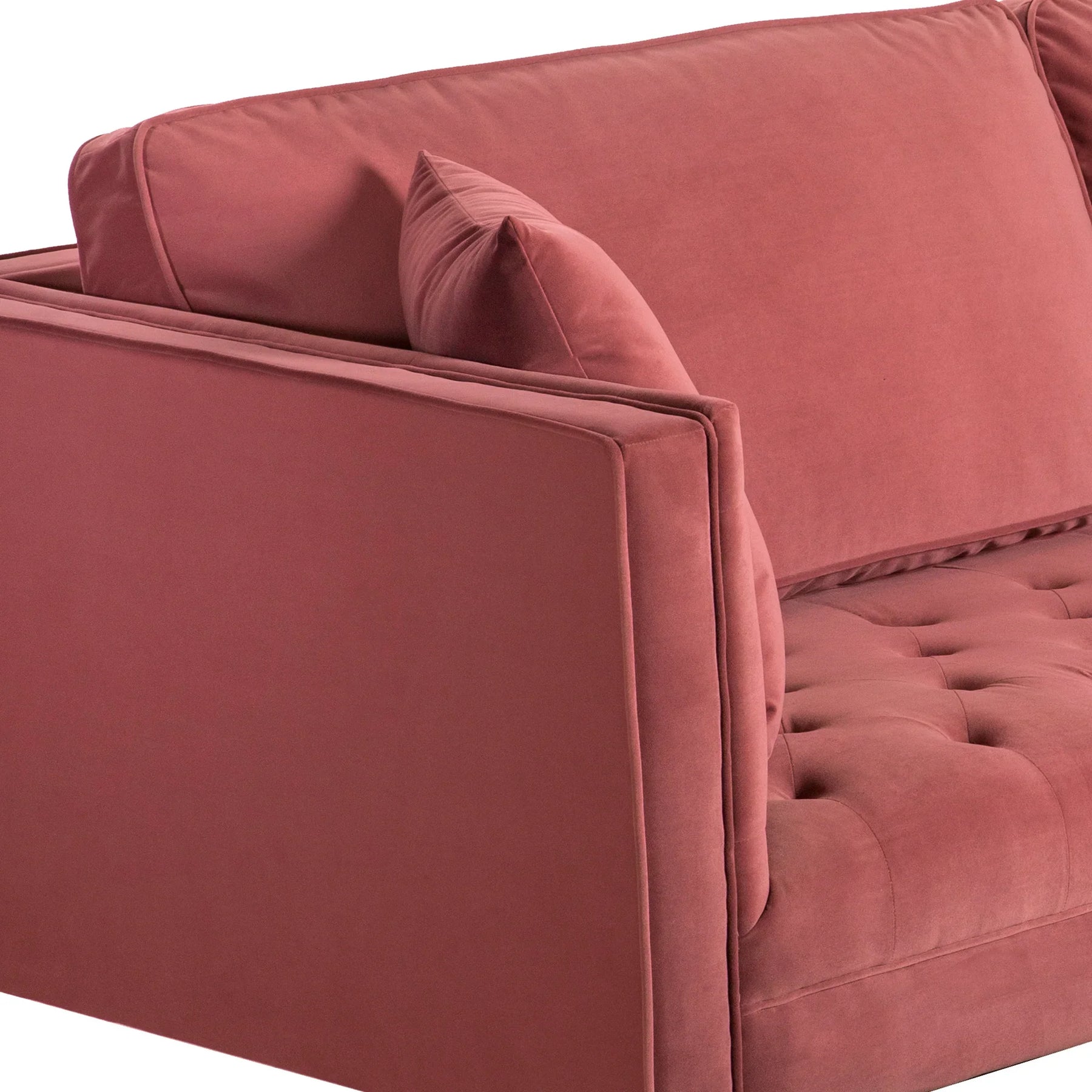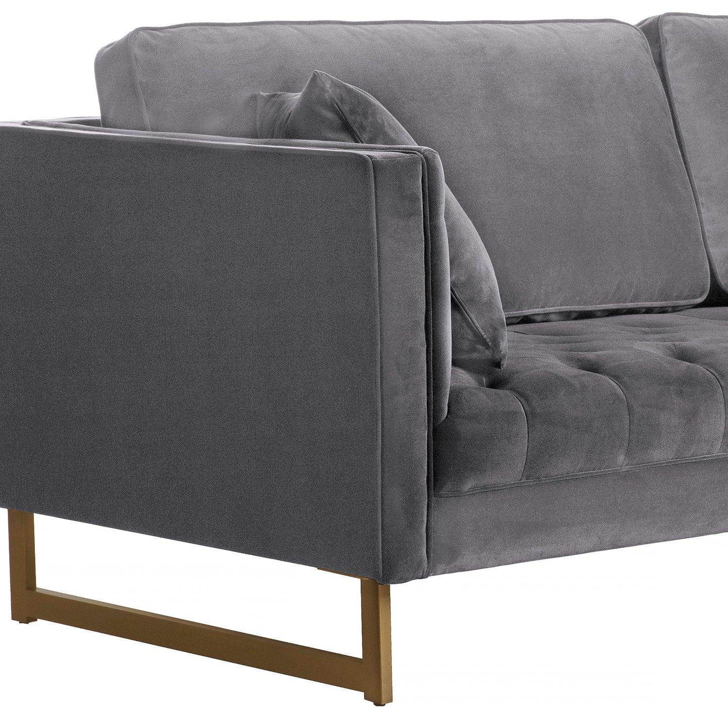 Make a chic statement in your living room with The Armen Living Lenox Velvet Modern Sofa with Brass Legs. Featuring a glam and modern silhouette, the Lenox is upholstered in a rich velvet fabric that feels exceptionally soft to the touch. Channel tufting highlights the stunning sheen in the velvet, while the striking antique brass finished metal base anchors the glamorous look of this sofa. Accompanied with pillows and diamond stitch cushion seats, the Lenox Sofa will be the most comfortable seat in the house. The Armen Living Lenox Sofa is available in your choice of Gray, Pink or Blue.