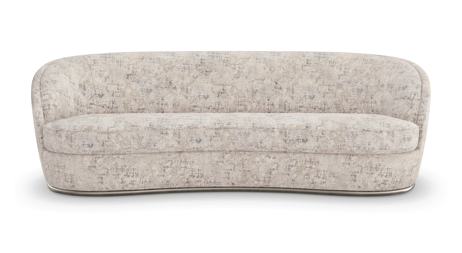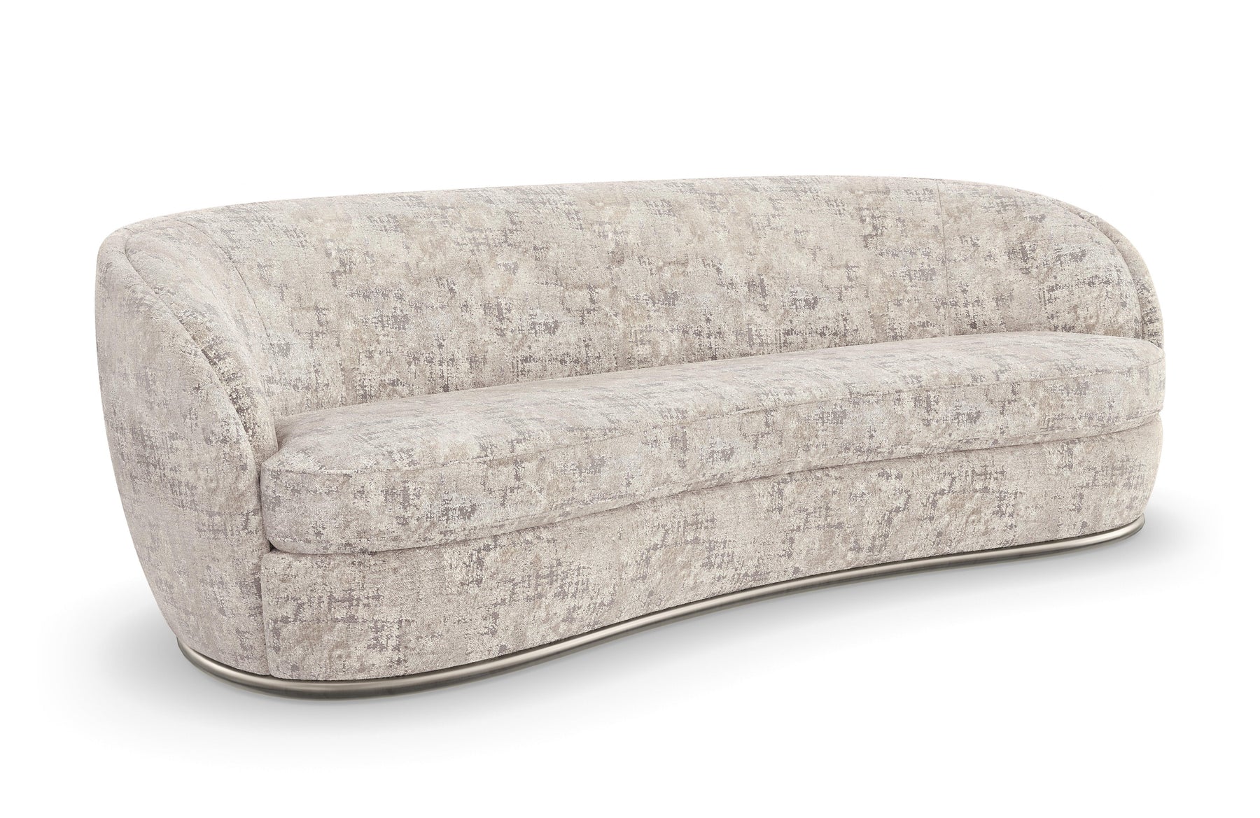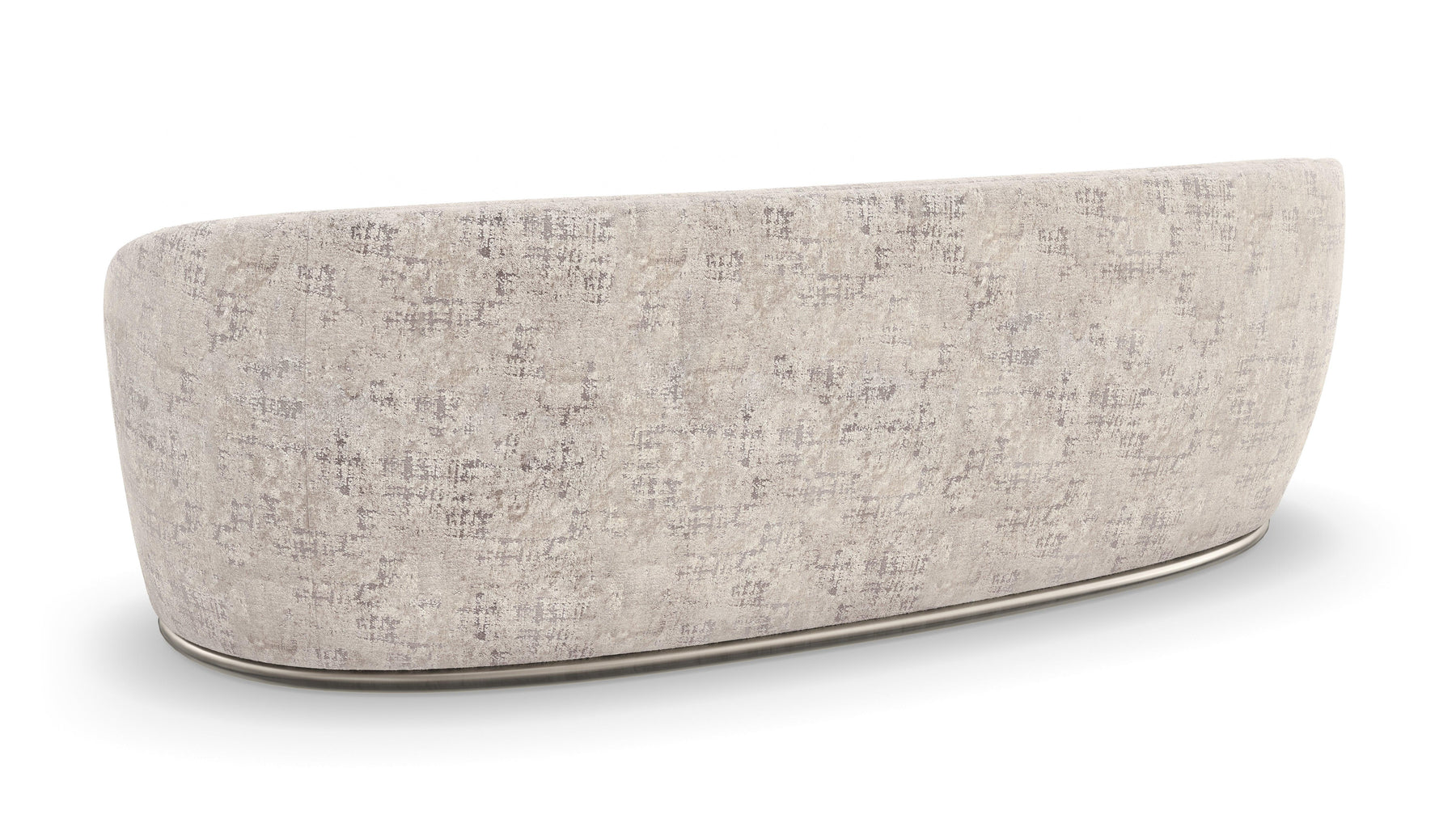 Soft and sculptural with a hint of shimmer, this biomorphic-style sofa evokes the senses and introduces an effortless elegance. Balanced on a rounded Charcoal Leaf wood base, its enveloping silhouette is defined by a double-roll detail along the top for a continuous curving line that guides the eye. Tailored in a tactile chenille fabric for a look that invites comfort and luxury. Available in 101W x 42.25D x 32H.