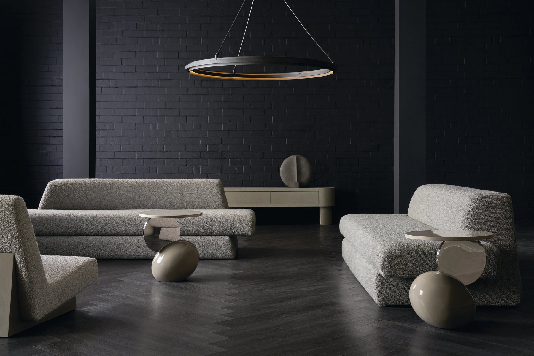The Nova Sofa is the living room's defining moment — a refined 94.5W x 33.5D x 27.5H finish that anchors its identity.