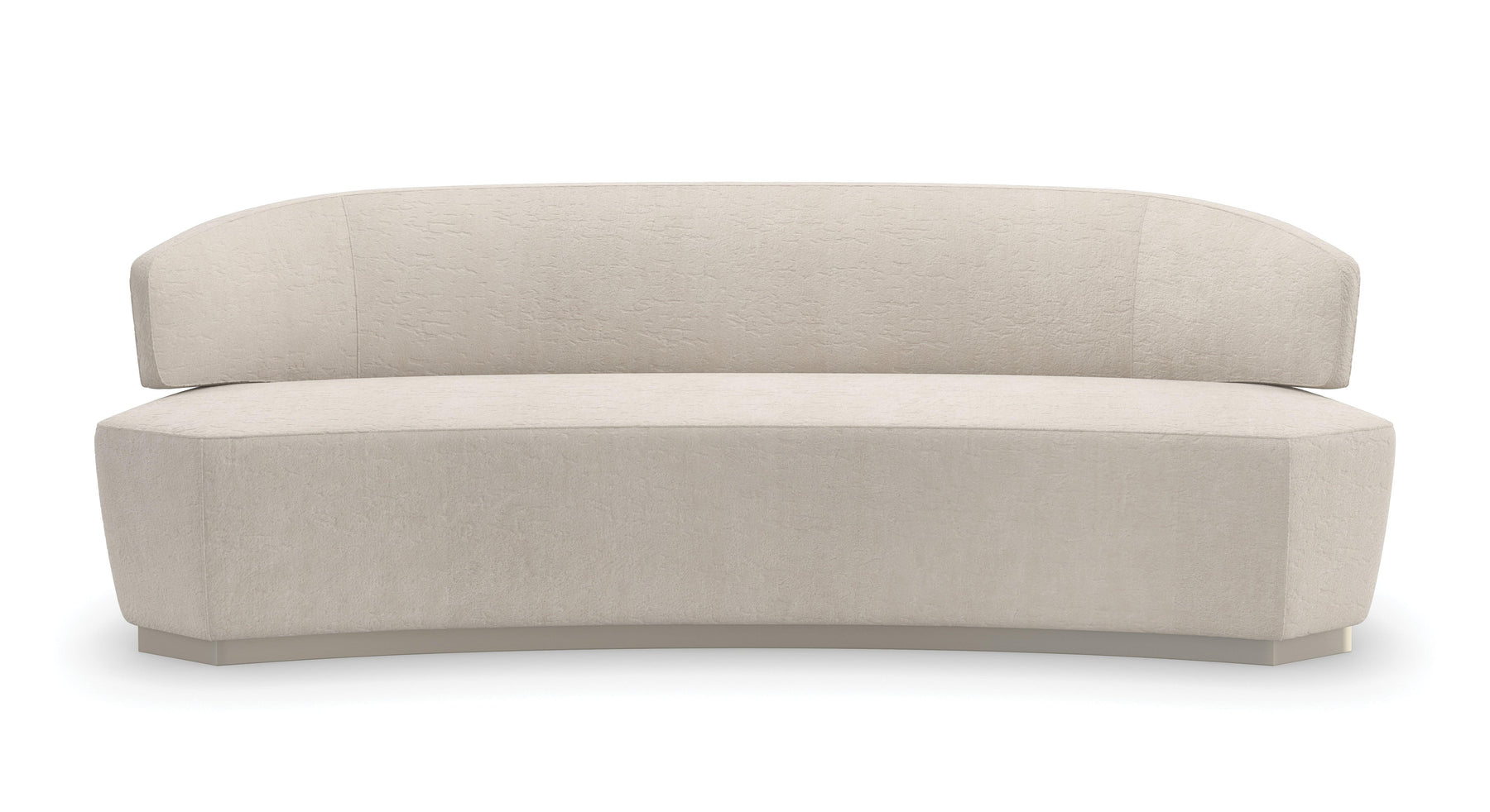 With a Klismos-inspired shape, this simple yet striking sofa is defined by a long and low, curving back atop a tight bench seat with clean, clipped edges. Elevated by a Sparkling Argent-finished, wood plinth base, its smooth silhouette in a distressed ivory velvet almost seems as if it’s carved from stone. Available in 93.5W x 37.5D x 32.5H.