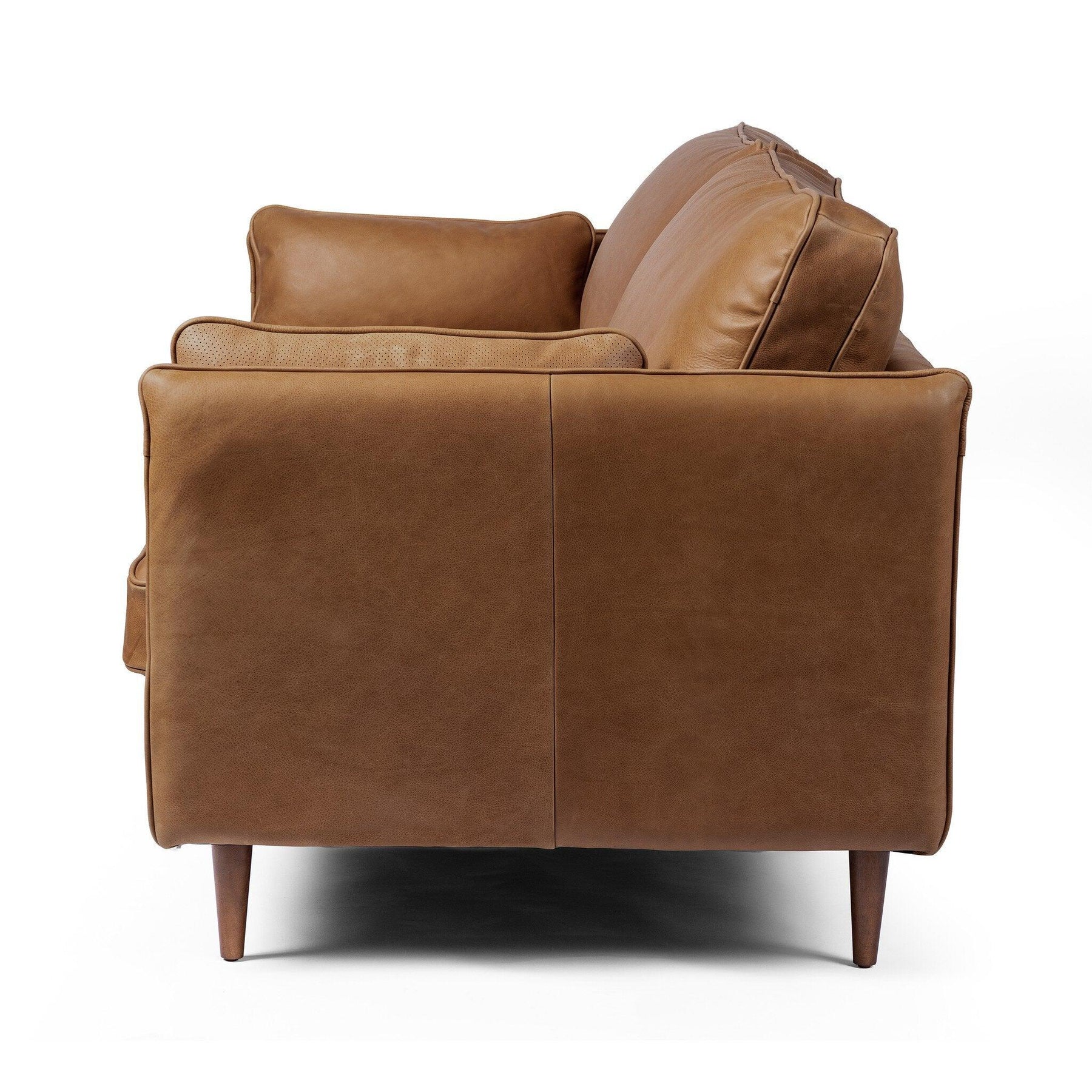 The top-grain leather upholstery across the Reese Sofa's two-cushion seat and welted track arms delivers a surface that is both visually precise and develops beautiful character with use. Knife-edge pillows add a polished, architectural detail to the back, while almond-finished legs taper gently downward — a nod to mid-century form that keeps the overall silhouette light and elevated above the floor. The combination of leather, welting, and tapered legs reads as complete and considered from every angle.