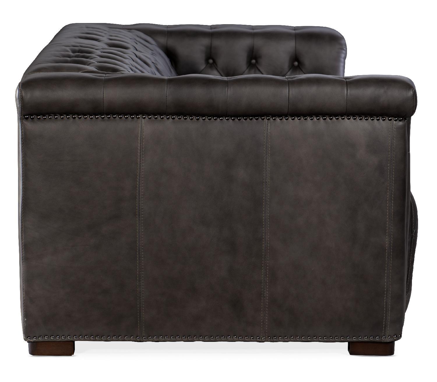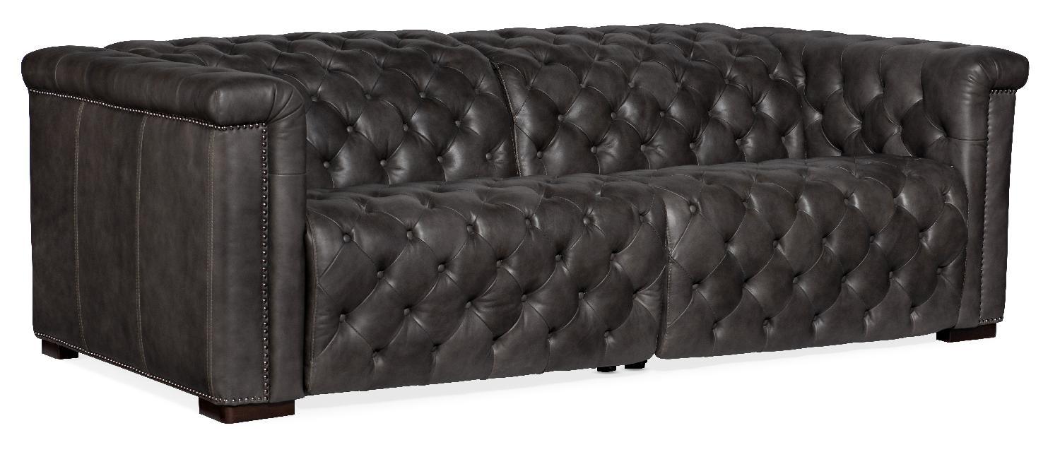 Classic elegance meets modern flair with the Savion 2 over 2 Power Reclining Sofa, combining traditional button tufted tailoring with a sleek low profile back. Whether you sit on the left or right end of the sofa, there’s an adjustable headrest, inviting you to lean back and relax your upper body while you watch TV, read or converse. The stunning sofa also reclines on both the left and the right side, smoothly and quietly transforming to recliners via power control buttons. The luxurious leather cover in a smokey color is a finished top grain called Bellagio Gravel.