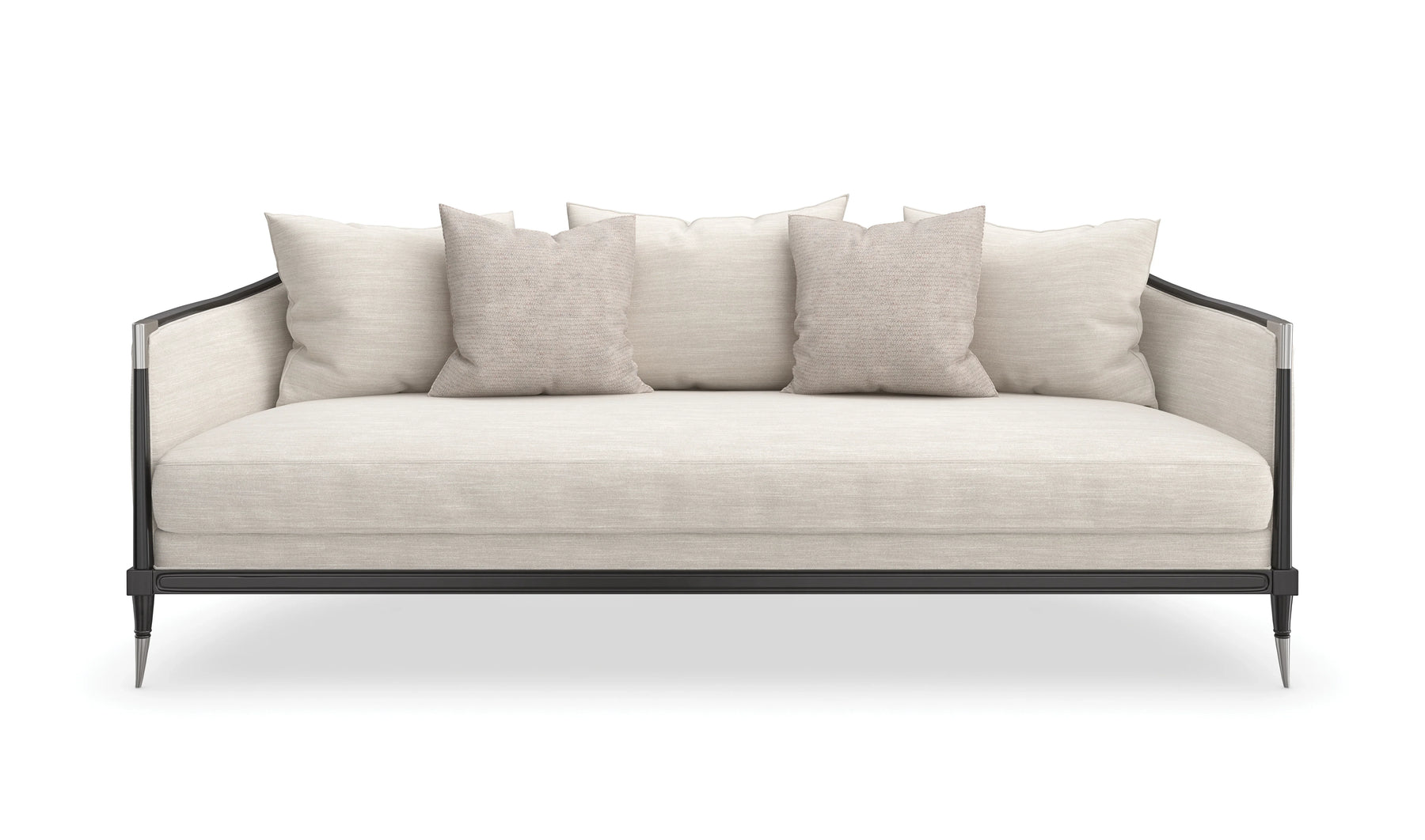 Tailored to perfection in an ivory linen woven fabric, this fresh take on a classic Caracole design features a softly curved silhouette dramatically defined by an Almost Black finish. Delicate metal ferrules and knuckles on the front arms draw their inspiration from an antique Italian parlor chair. Sumptuous pillows in coordinating ivory and silver tones add comfort and fashion to the overall design of this sophisticated sofa.