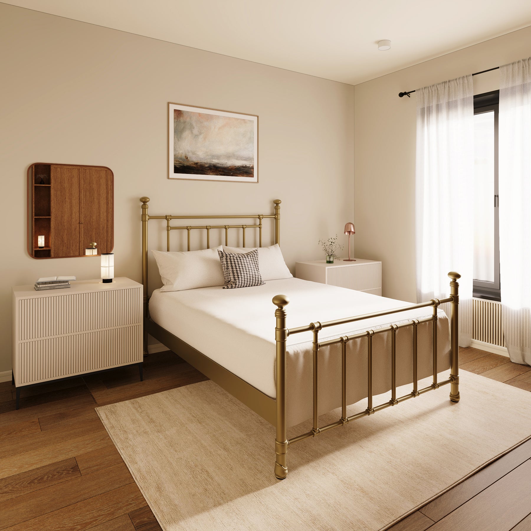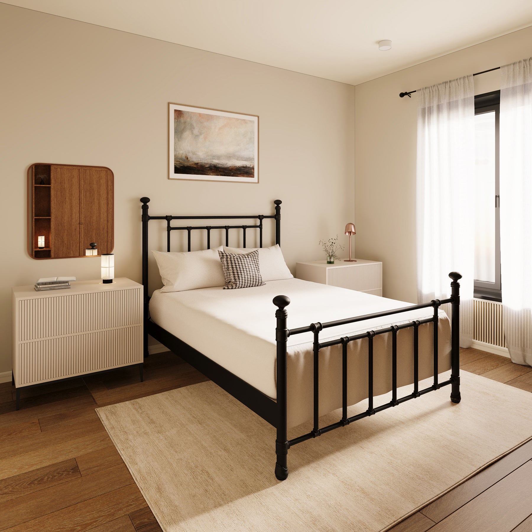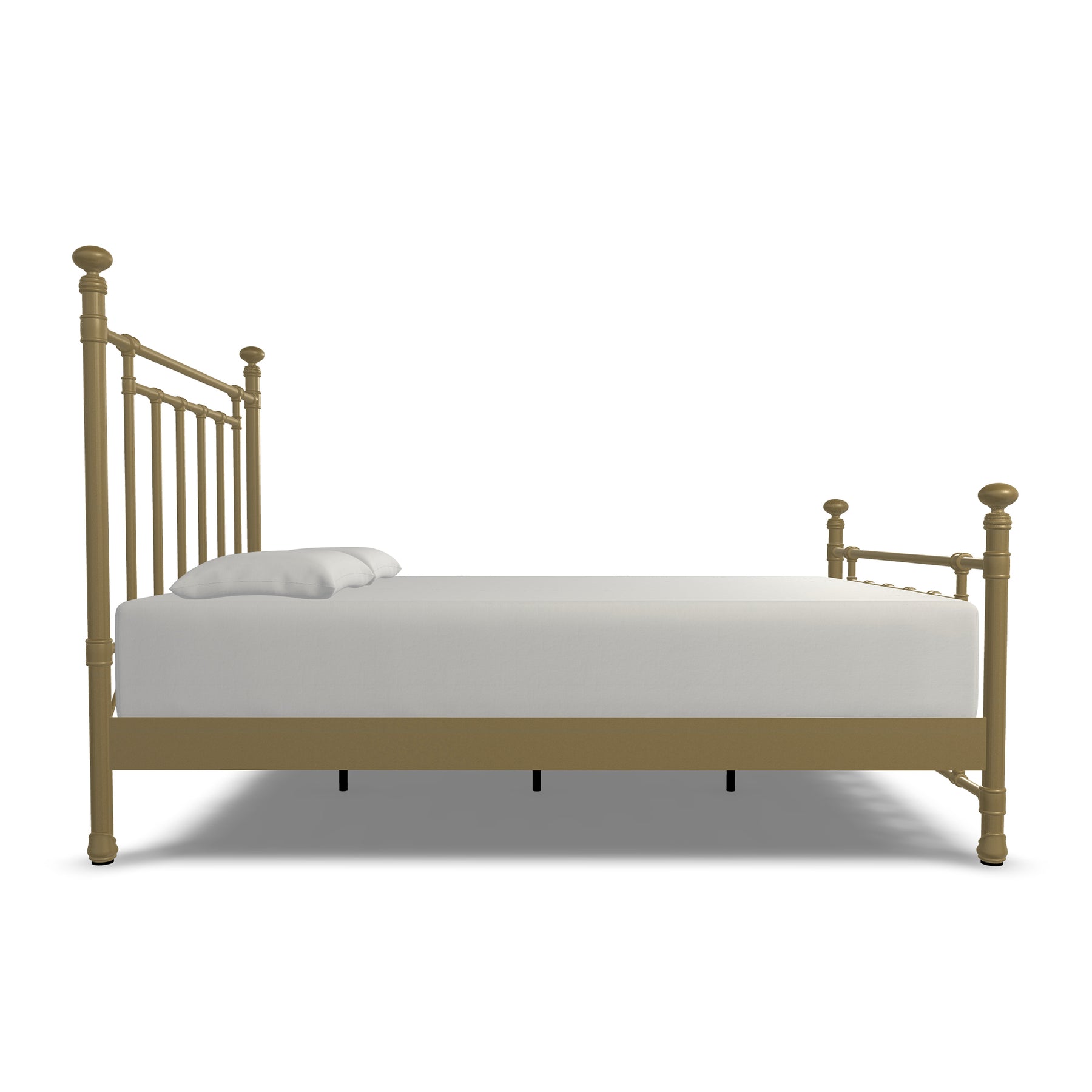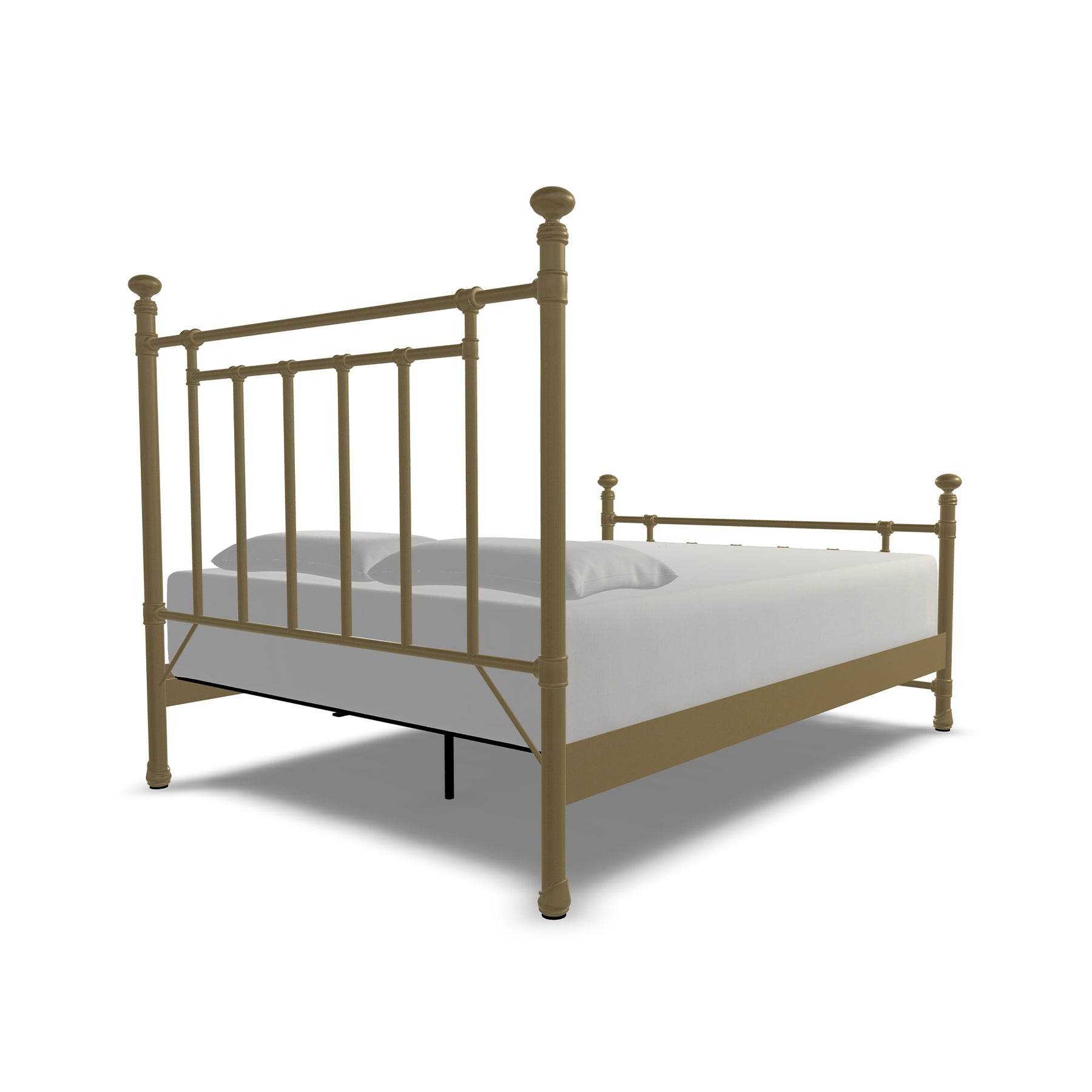 Inventive, fun-loving and simplistic, the Edin iron bed personifies classic ingenuity. Built with unsurpassed craftsmanship by true artisans it showcases sturdy style top rails with slim, strong angular bars in the headboard & footboard. Handcrafted with premium wrought iron by skilled artisans, it is a sturdy, high-end bed with its one-piece fully welded headboard, footboard and custom heavy duty steel frame. Decorative hand-poured castings at each joint add to its luxurious style and the sleek profile side panels provide a finished look. The finish is a blend of hand-applied powder paint baked on at extremely high temperatures resulting in a durable, rich finish for exceptional lasting color. It fits standard mattress boxspring not required; the headboard height is 51 inches and the footboard height is 36 inches. This exceptional Edin Iron Bed won't disappoint with its unsurpassed strength, beauty and vintage style you will enjoy for years.