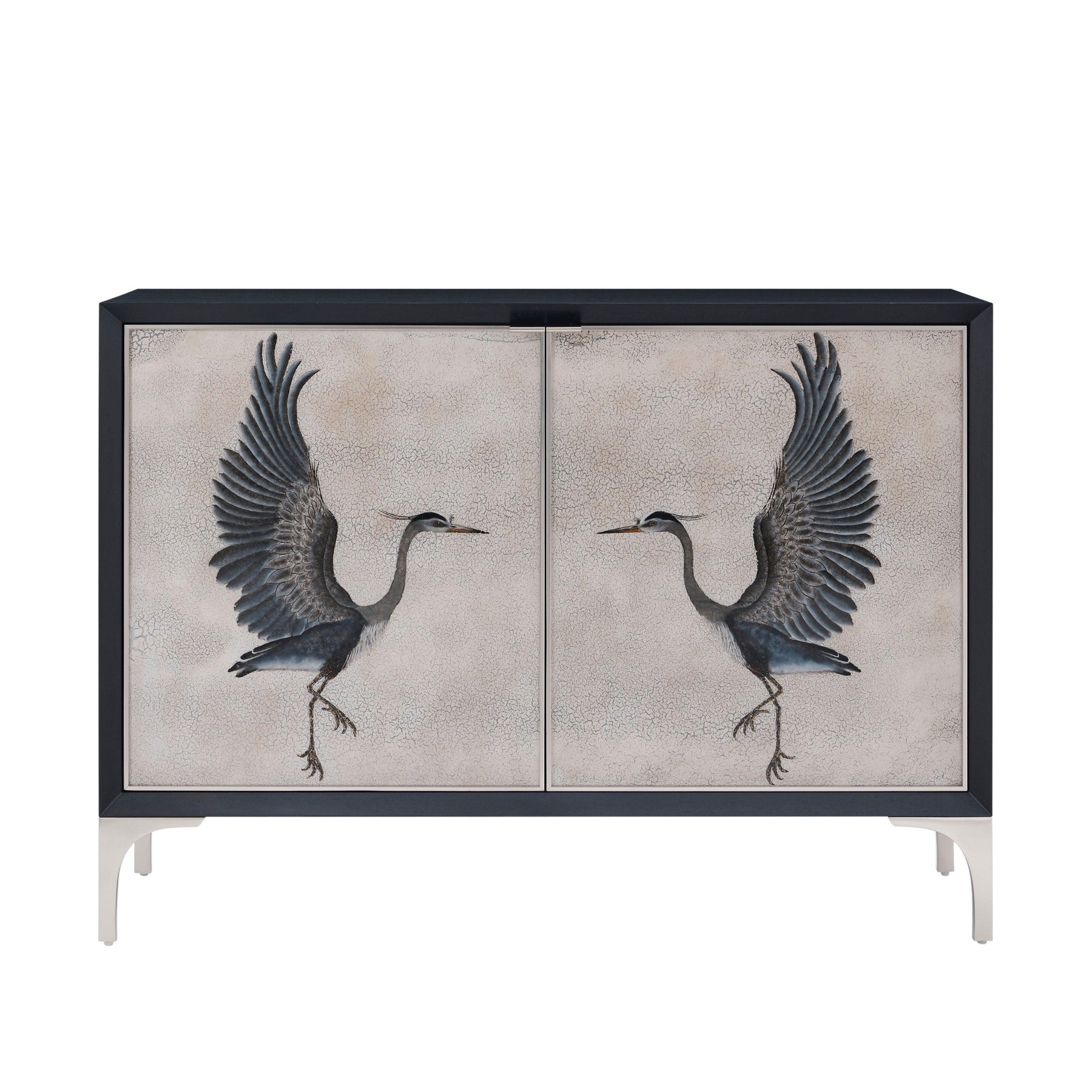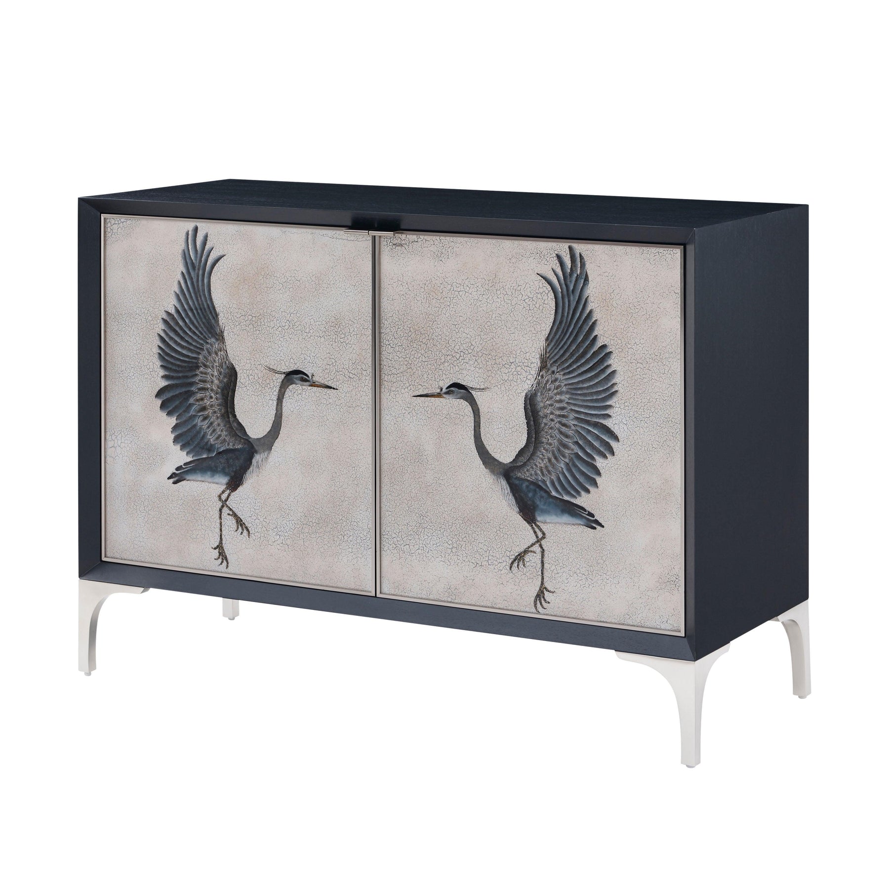 The Heron Dresser uses a centuries-old technique to draw attention to two antiqued metal leaf doors. Finely composed of a black-stained mahogany. Brass frame finished in Starlight.
