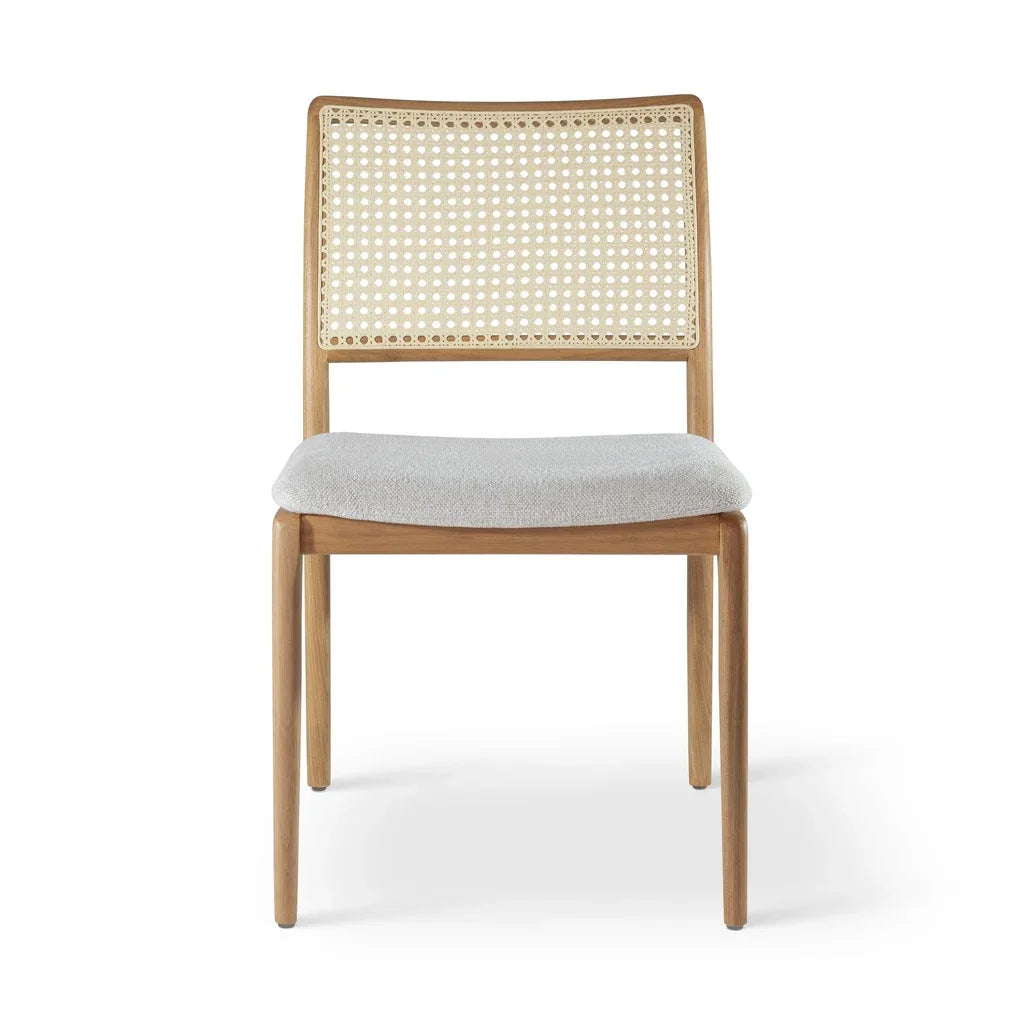 Meticulously crafted in Brazil, the Charlotte Side Chair presents a modern design that beautifully combines solid Tauari wood frame with natural caning and upholstery. The mixed materials come together harmoniously, creating a modern aesthetic with a touch of organic elements. The generous upholstered seat, slightly curved for enhanced comfort, makes it ideal for dining or various occasional needs. The solid wood legs, elegantly rounded at the corners, not only provide stability but also add a touch of sophistication. Completing the design, the attractive stretcher reinforces durability while adding visual appeal.