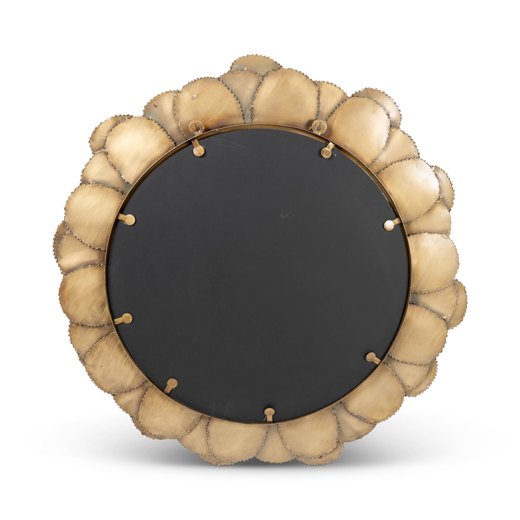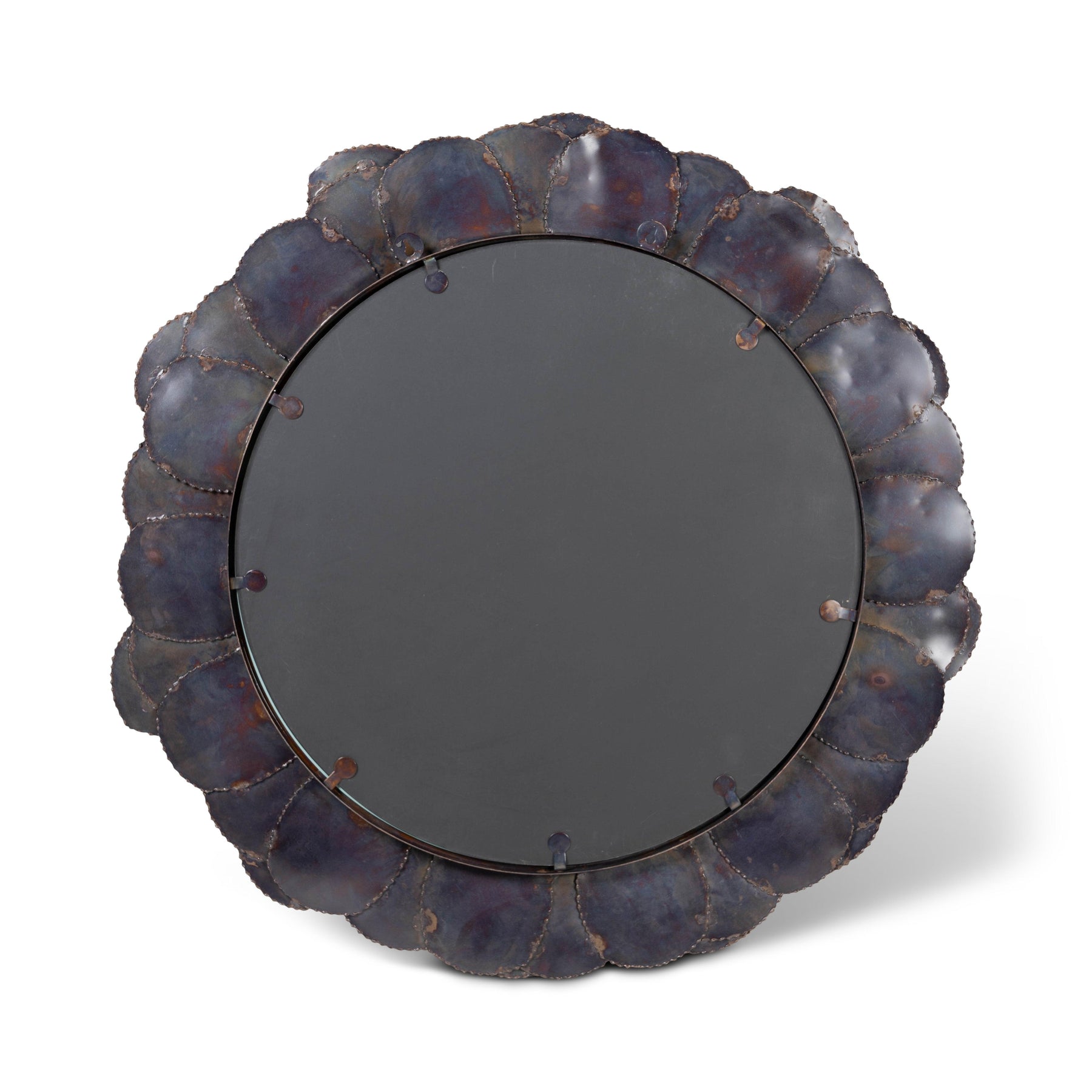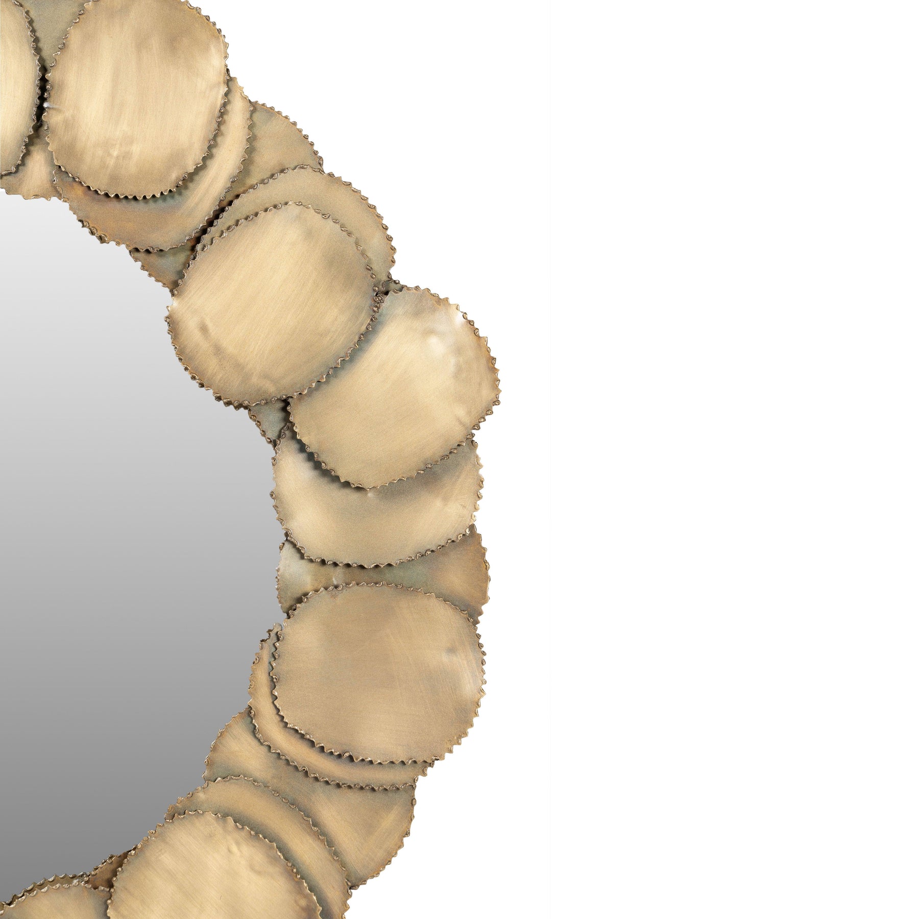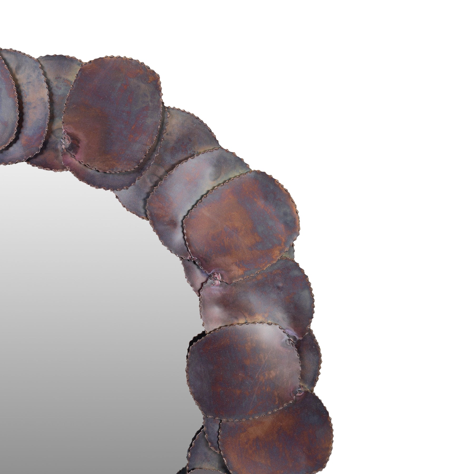 The Urbia Suri Mirror showcases a handcrafted circular design featuring intricately arranged freeform iron shapes with rippled edges. Crafted entirely from iron, this decorative metal wall mirror highlights exceptional artisan metalwork and meticulous craftsmanship. Its unique circular frame creates a bold, eye-catching focal point that adds distinctive charm and texture to any modern or industrial-inspired space.