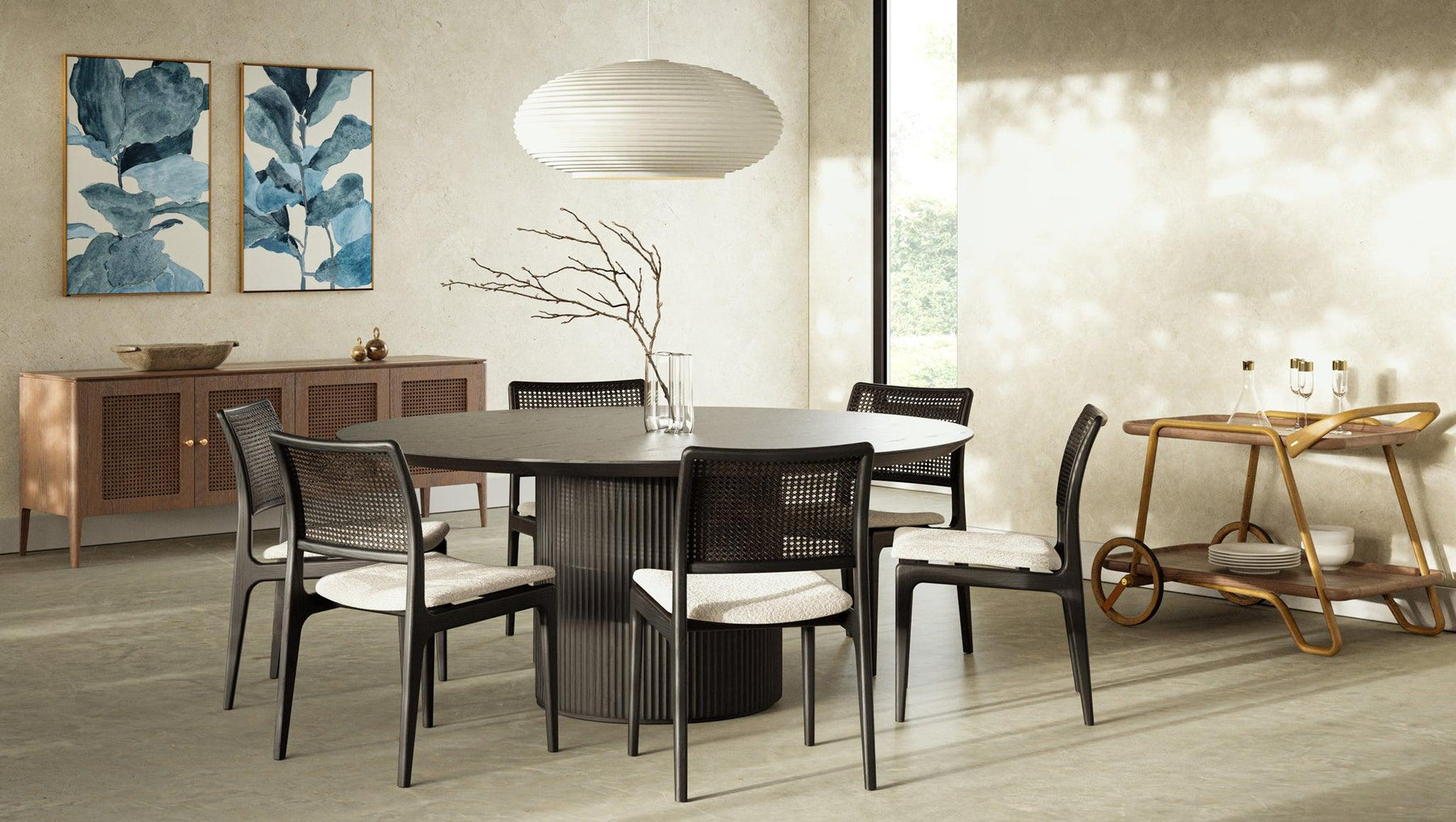 The Atenas Dining Table, made in Brazil, embodies a clean and contemporary aesthetic. This round dining table features a sturdy fluted solid Tauari wood pedestal base and a veneer top, creating an elegant and refined look. Its graceful form and pleasing design make it a captivating centerpiece for any dining space. Elevate your dining experience with the Atenas Dining Table, crafted with meticulous attention to detail and designed to seamlessly blend style and functionality.