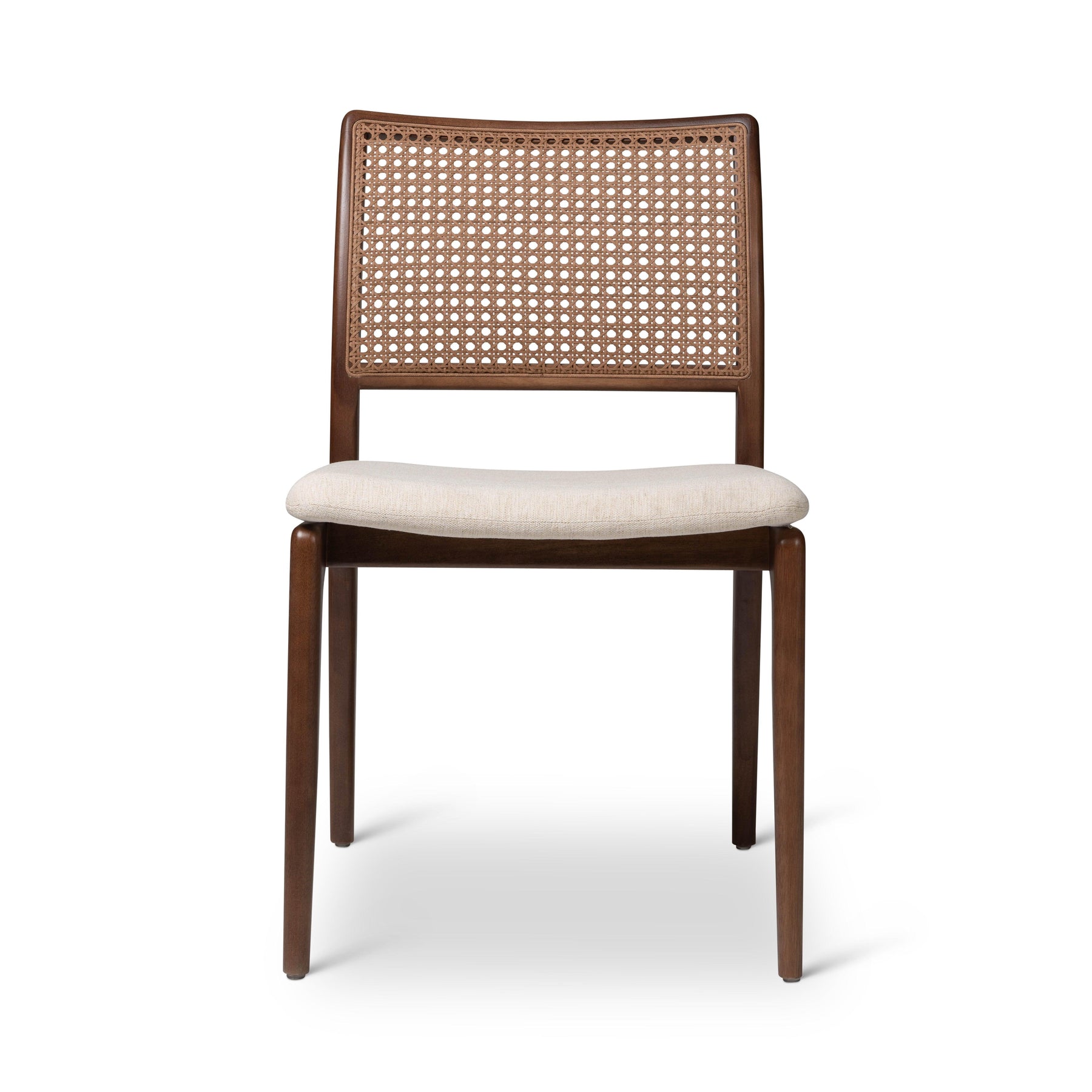 Meticulously crafted in Brazil, the Charlotte Side Chair presents a modern design that beautifully combines solid Tauari wood frame with natural caning and upholstery. The mixed materials come together harmoniously, creating a modern aesthetic with a touch of organic elements. The generous upholstered seat, slightly curved for enhanced comfort, makes it ideal for dining or various occasional needs. The solid wood legs, elegantly rounded at the corners, not only provide stability but also add a touch of sophistication. Completing the design, the attractive stretcher reinforces durability while adding visual appeal.