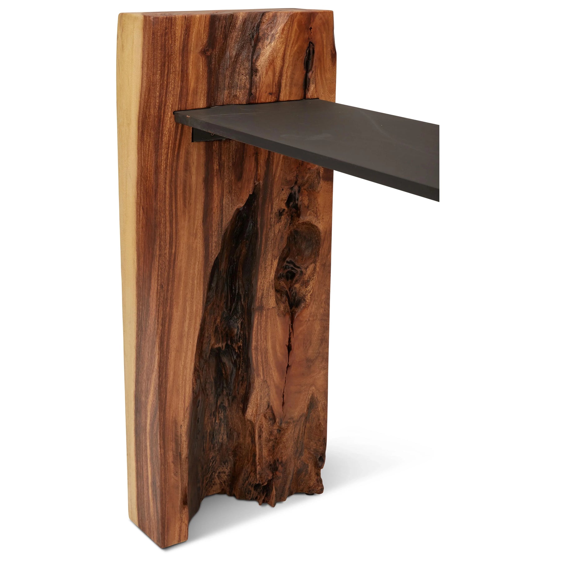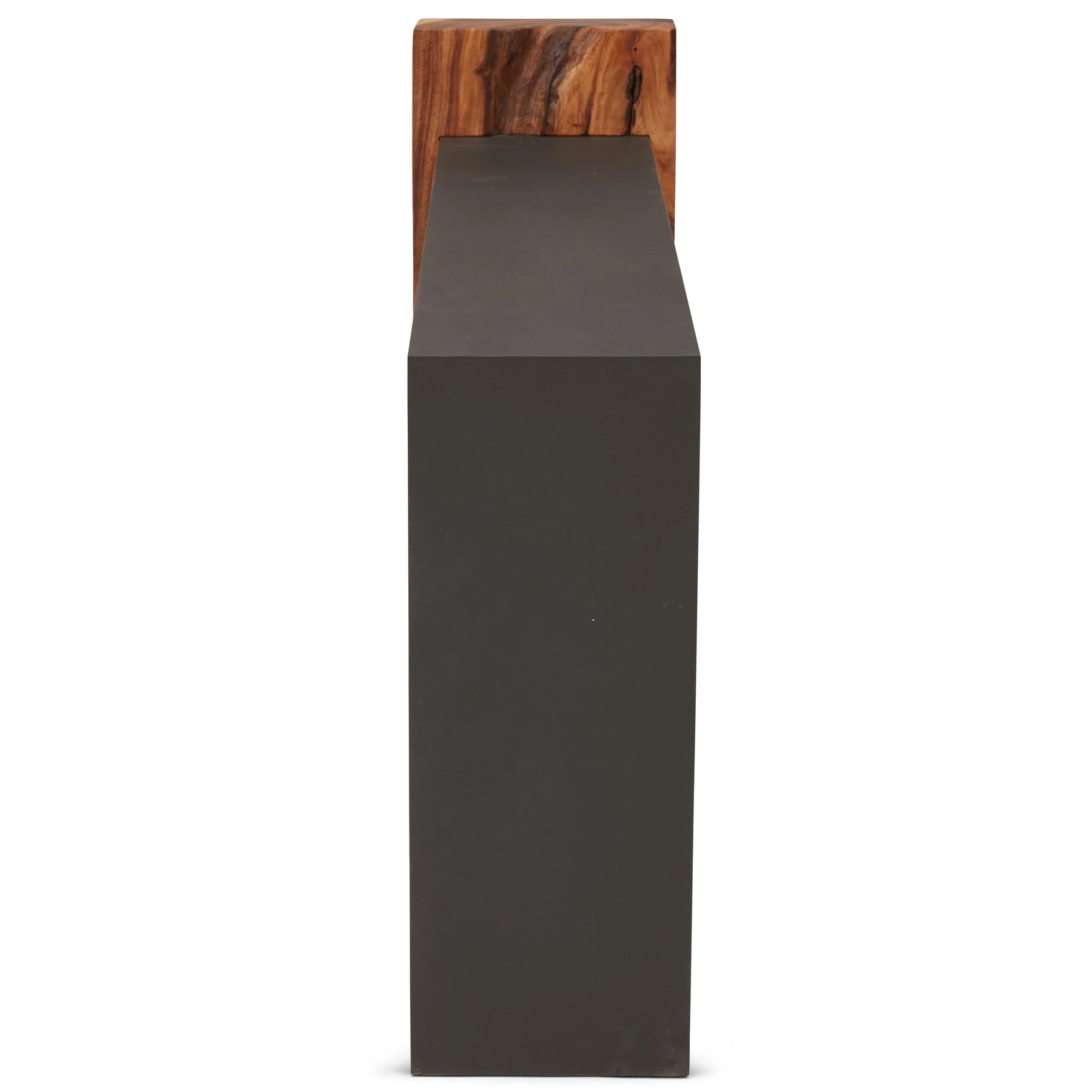 The Fortis Console is where minimalism meets bold, artistic design. This striking piece features a solid block of natural Chamcha wood as one base, showcasing the rich grain, organic textures, and natural imperfections that make each console truly one-of-a-kind. The contrasting element—a sleek, black powder-coated iron slab—forms the tabletop and secondary leg, creating a visually compelling fusion of organic and industrial materials. Perfect for modern entryways, living rooms, or office interiors, the Fortis Console delivers functional surface space with a sculptural edge. Its minimalist profile and artisanal construction make it an ideal statement piece for contemporary and rustic-modern decor.