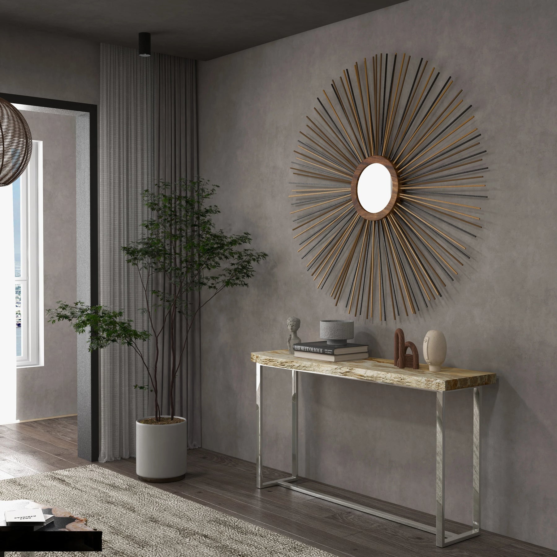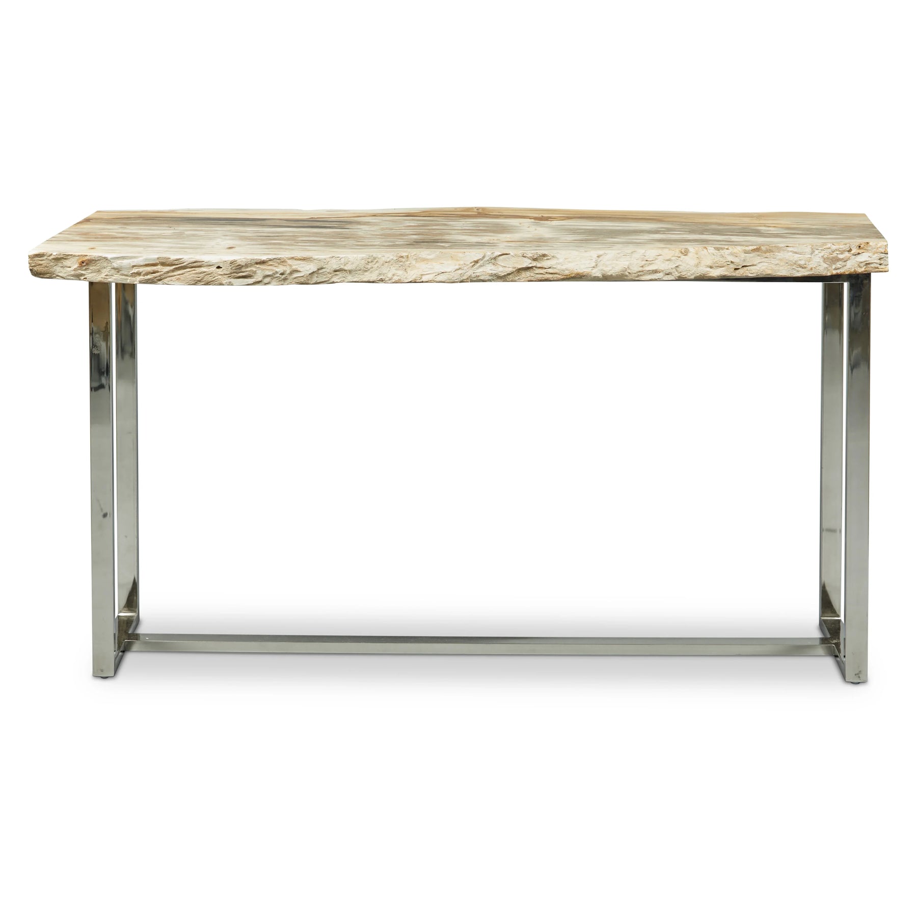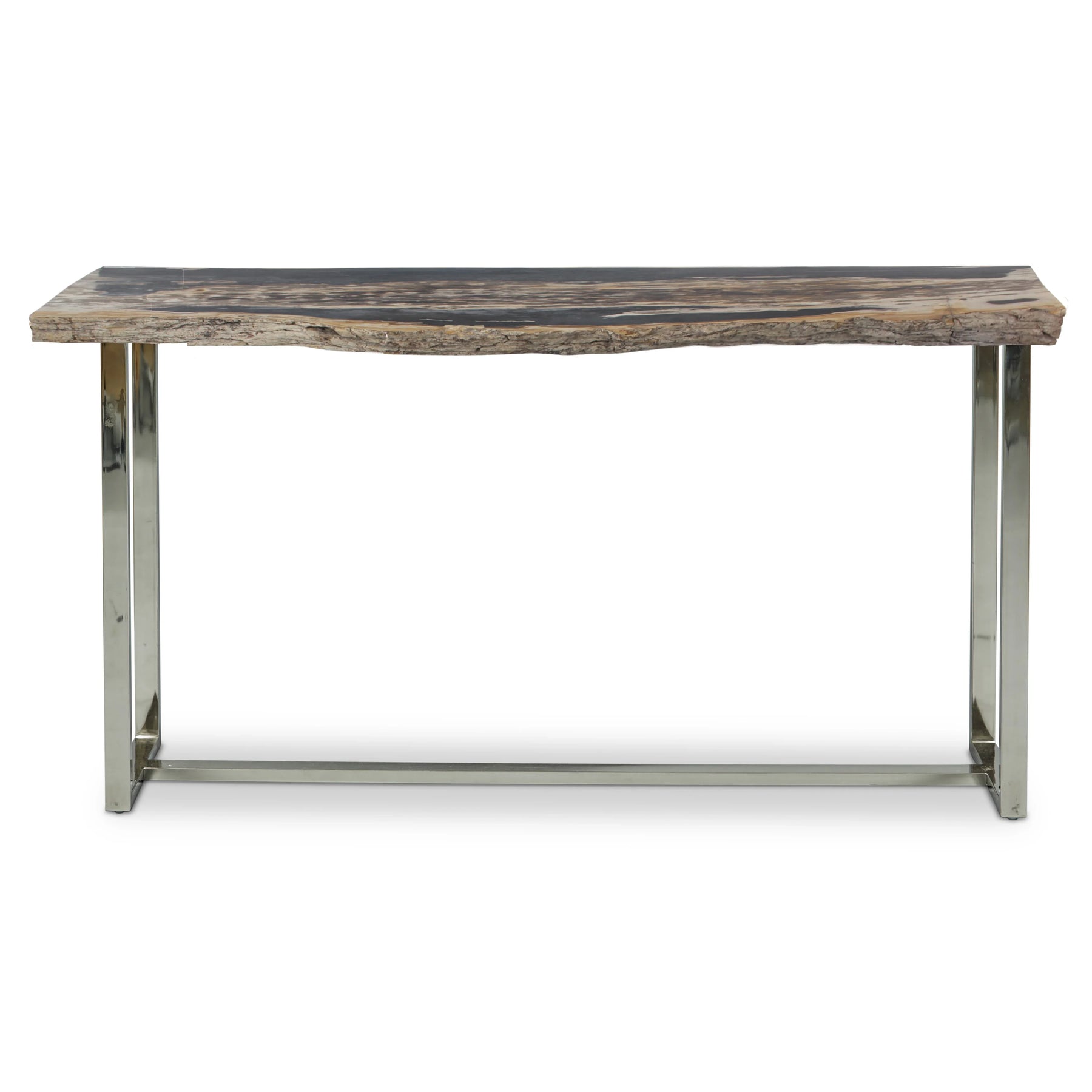 A petrified wood slab top and plated stainless steel base make The Raw Console a sculptural, minimalist statement piece for any entryway or living room. Its smooth, polished top is complimented by its raw, natural edges. This console is available in Dark and Light petrified wood.