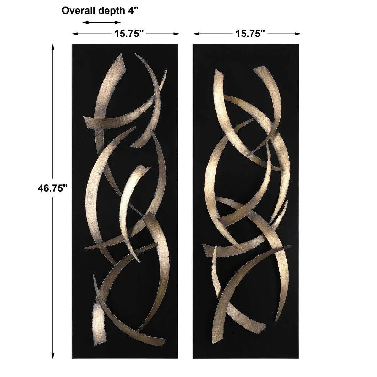 Individually rough cut sheet metal strips finished in a brushed gold with moderate antiquing, layered to create a 3-dimensional effect, mounted on a metal plaque in a matte black finish. May be hung horizontal or vertical.