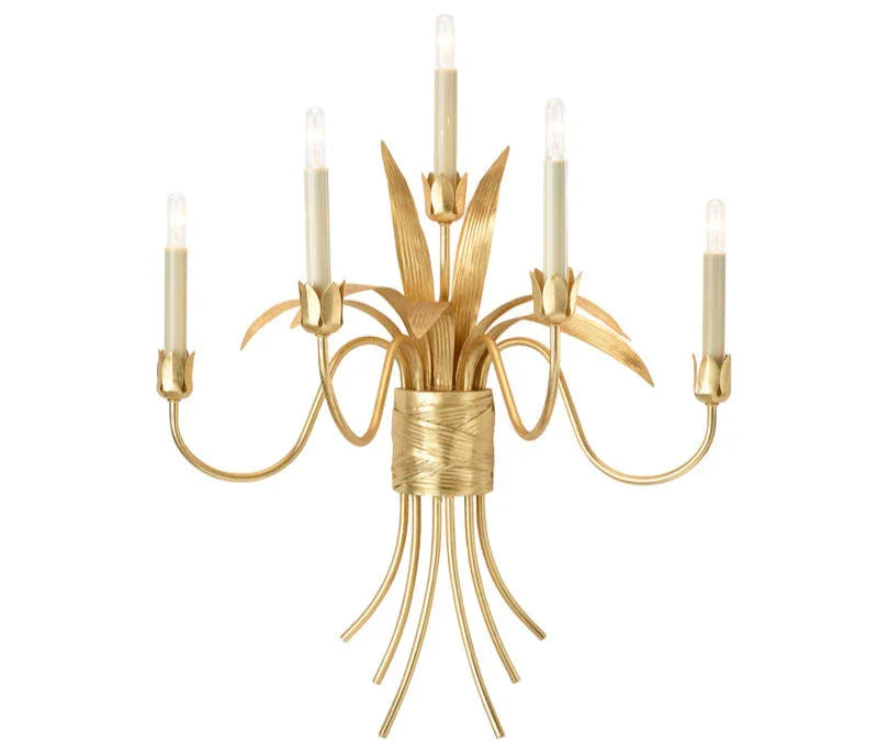 Gold leaf over iron with wrapped metal accents and electrified candles.