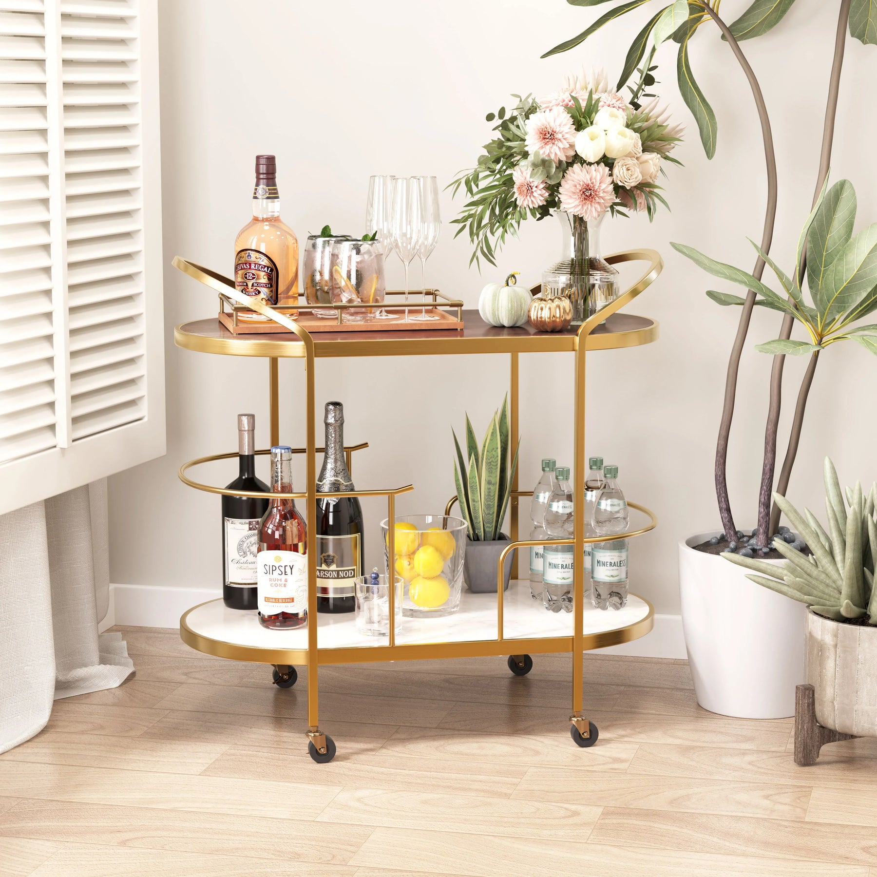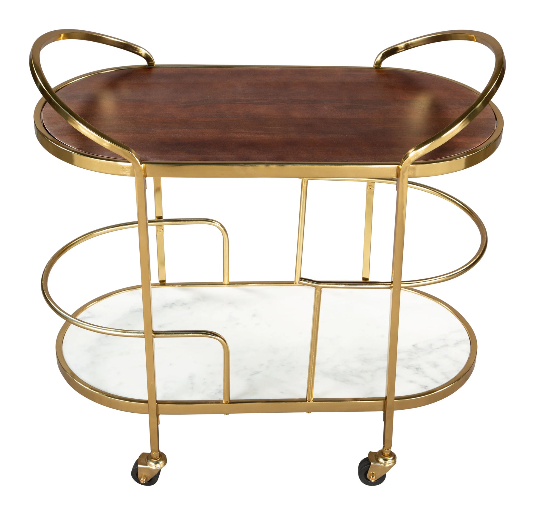 Introducing the Antalya Bar Cart, a stunning and modern piece of furniture that will add a touch of elegance and functionality to any living room or dining area. The bar cart features a deco-inspired design with a combination of brown lacquered acacia wood and brushed steel.