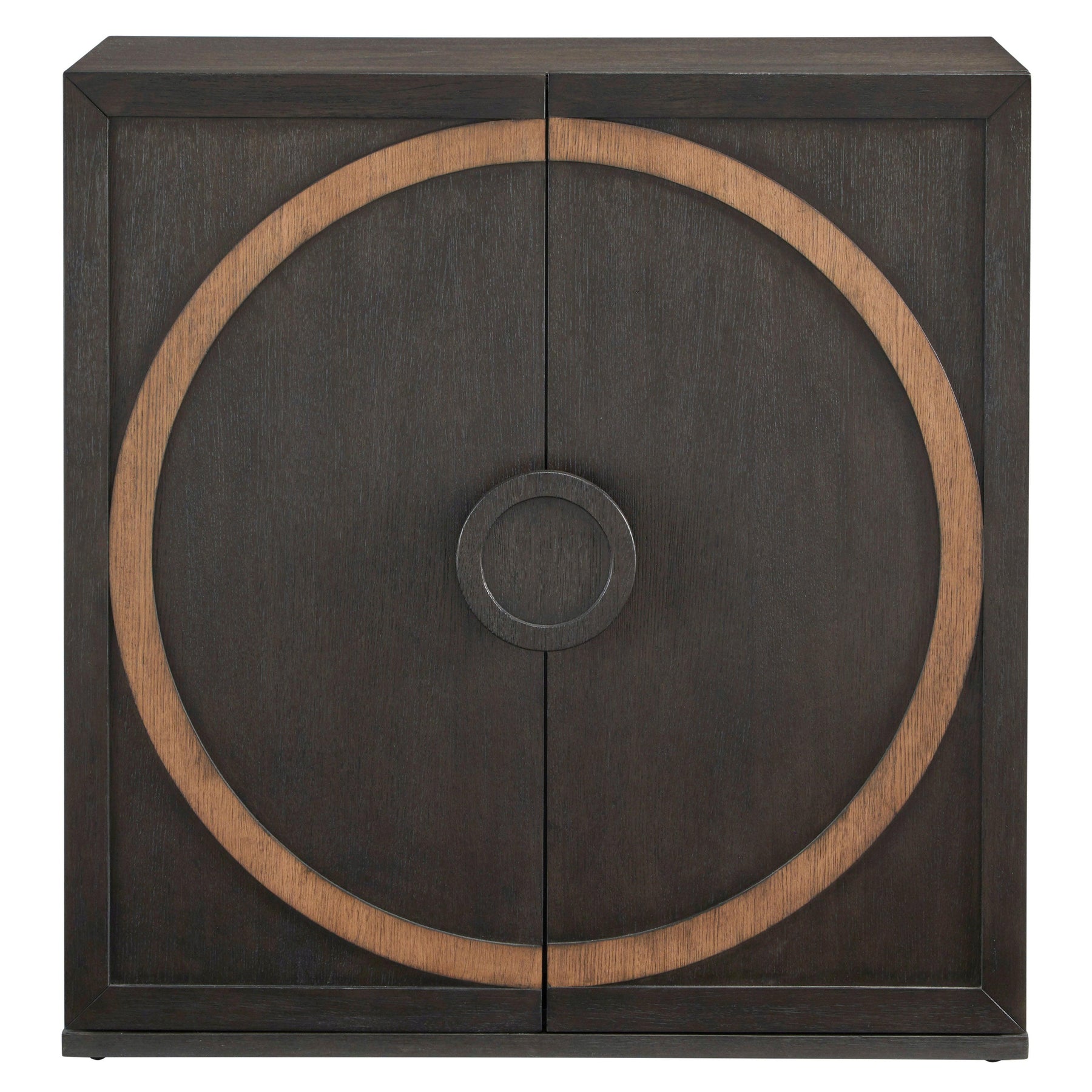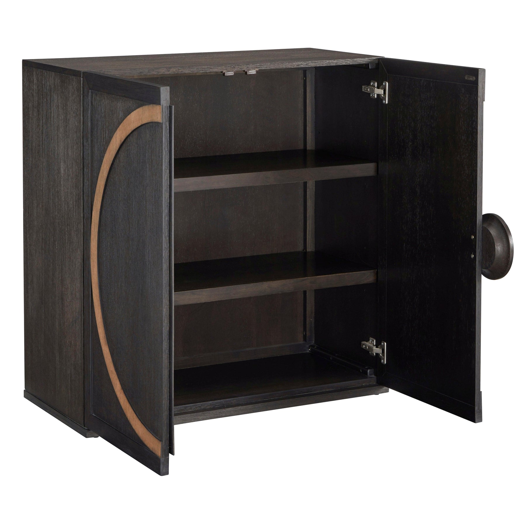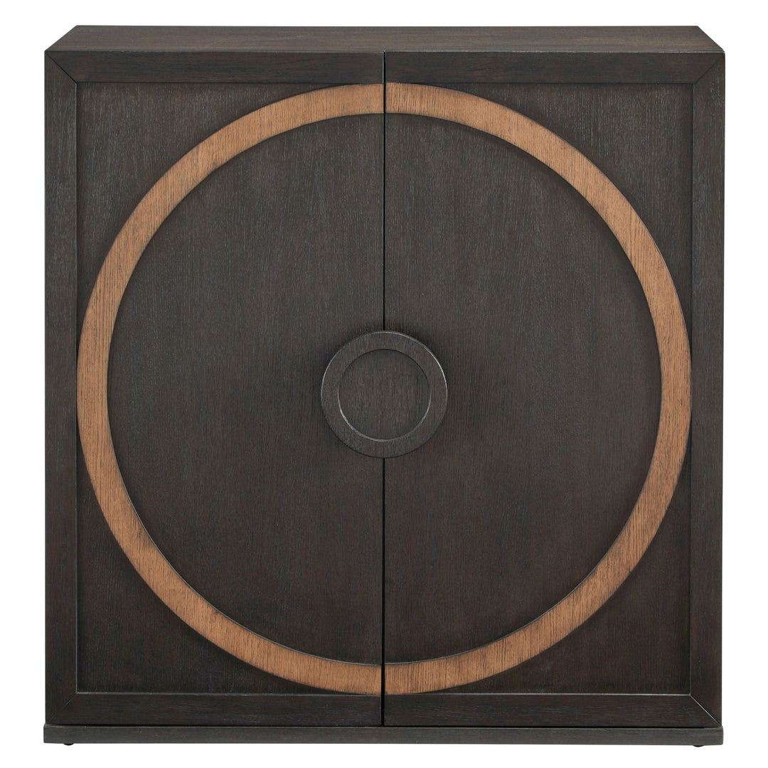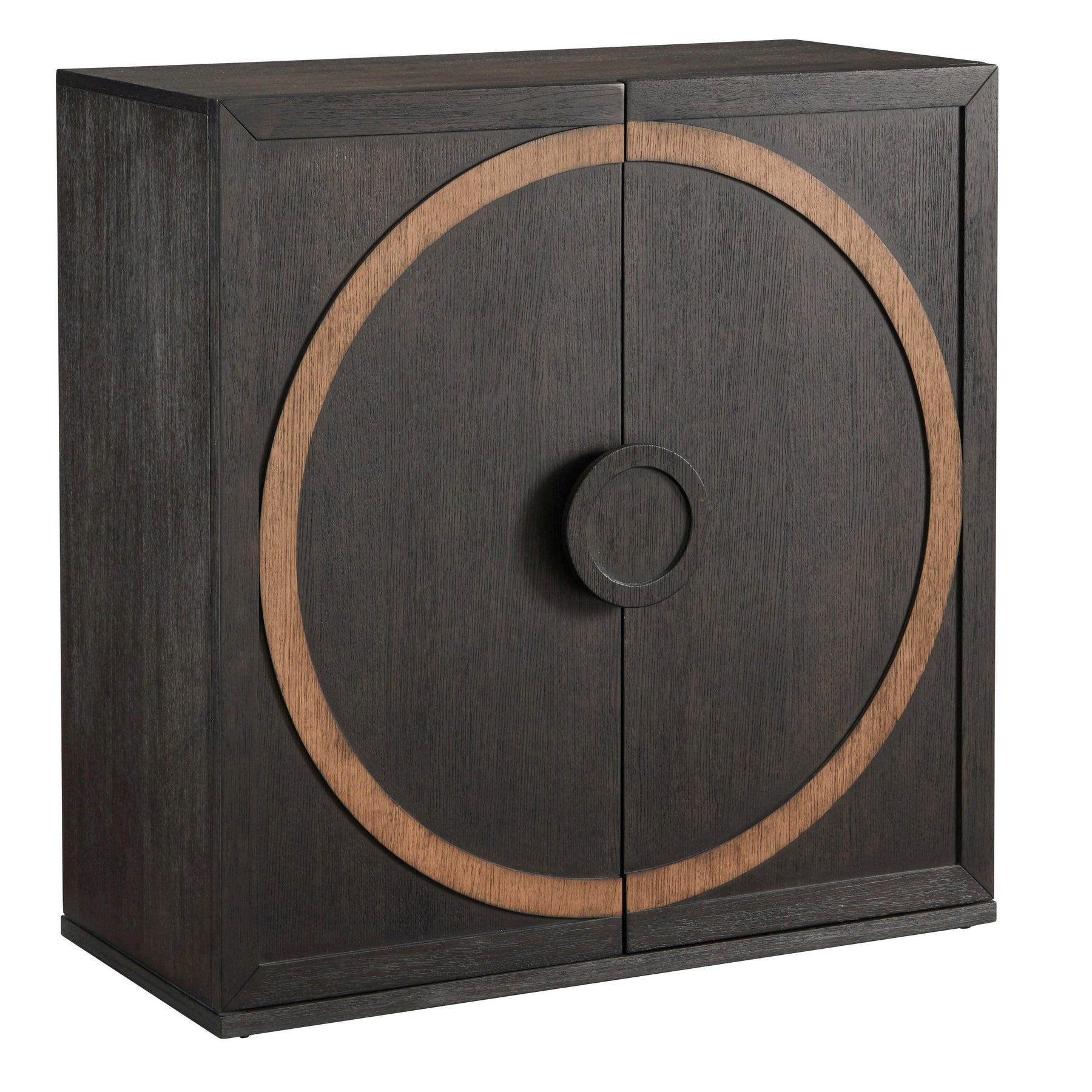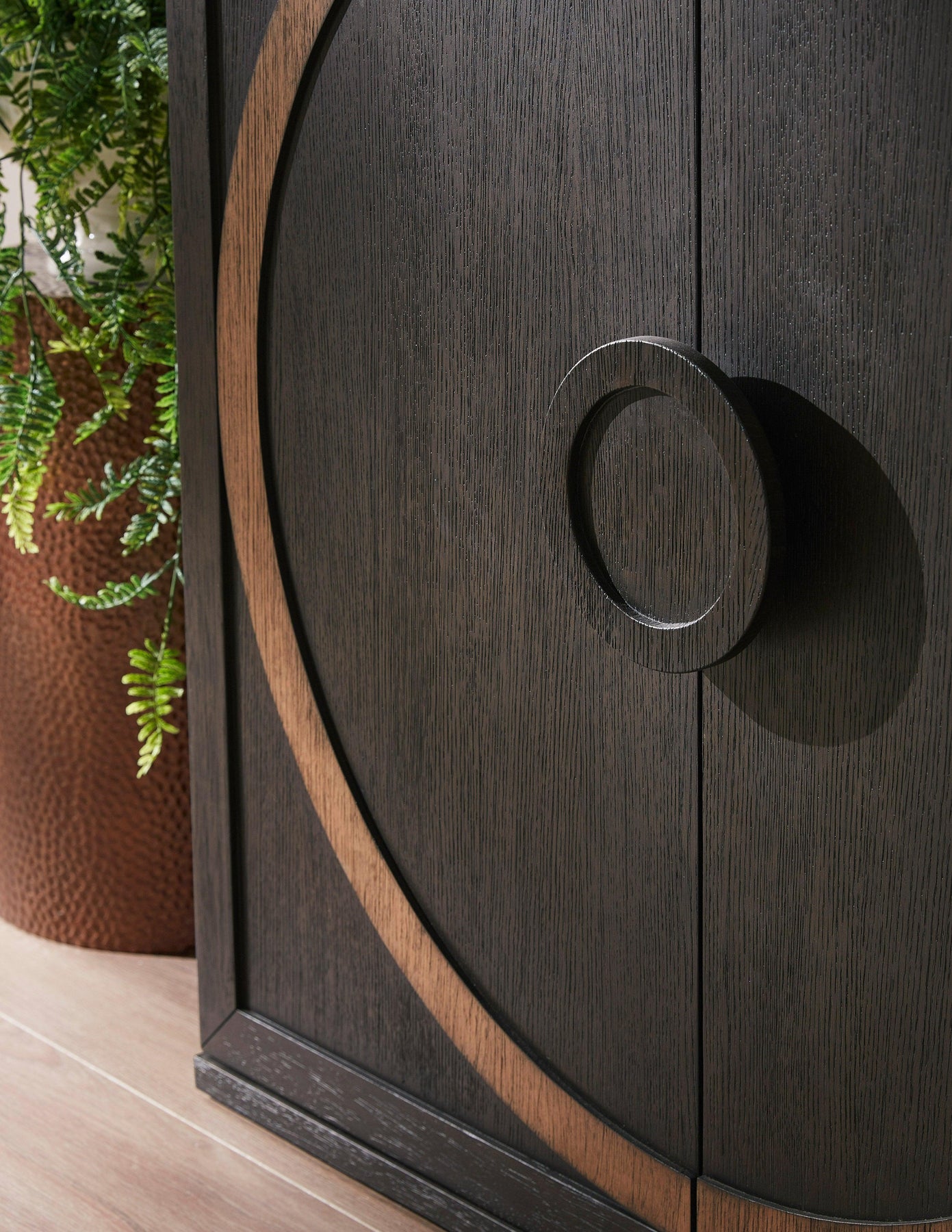 Bring sophistication to your space with our 2-Door Accent Chest, featuring a streamlined silhouette perfect for contemporary spaces. Behind two doors are two spacious shelves that can be adjusted or removed to customize the storage according to your needs. The black finish with a deep, espresso-like undertone highlights the wood’s natural texture, giving it an elegant, timeless appeal. A contrasting light brown circle design on the door fronts and a circular design handle pull adds modern flair, creating a striking focal point and a distinctive design element. This piece is crafted from oak veneers and solid hardwood, making it a durable and stylish addition to living rooms, bedrooms, or entryways.
