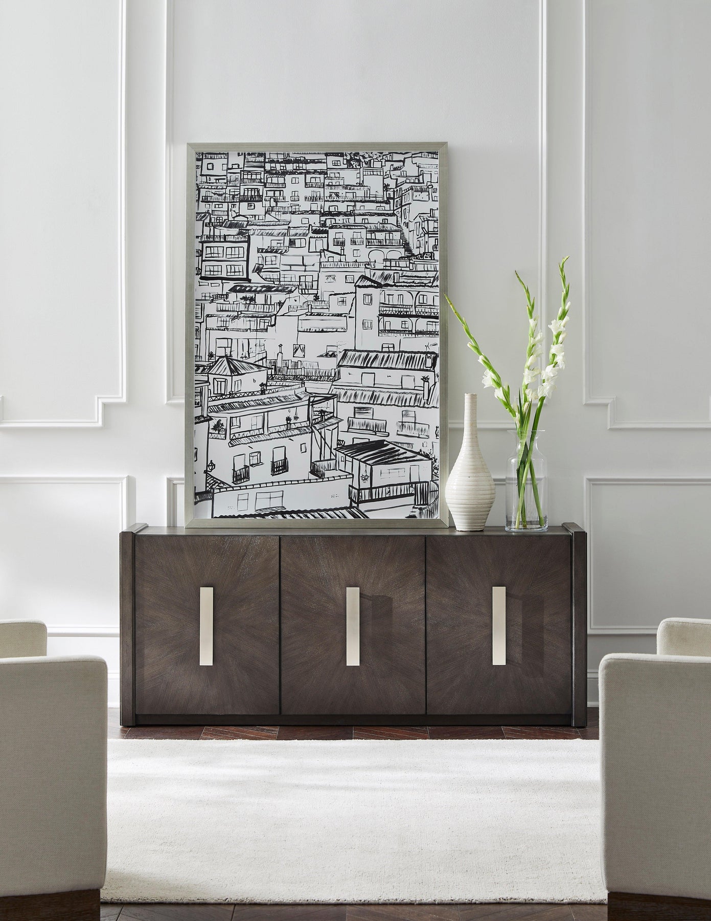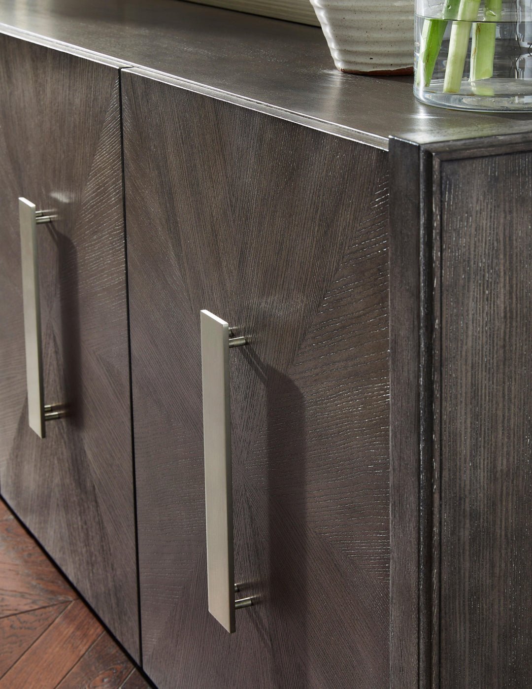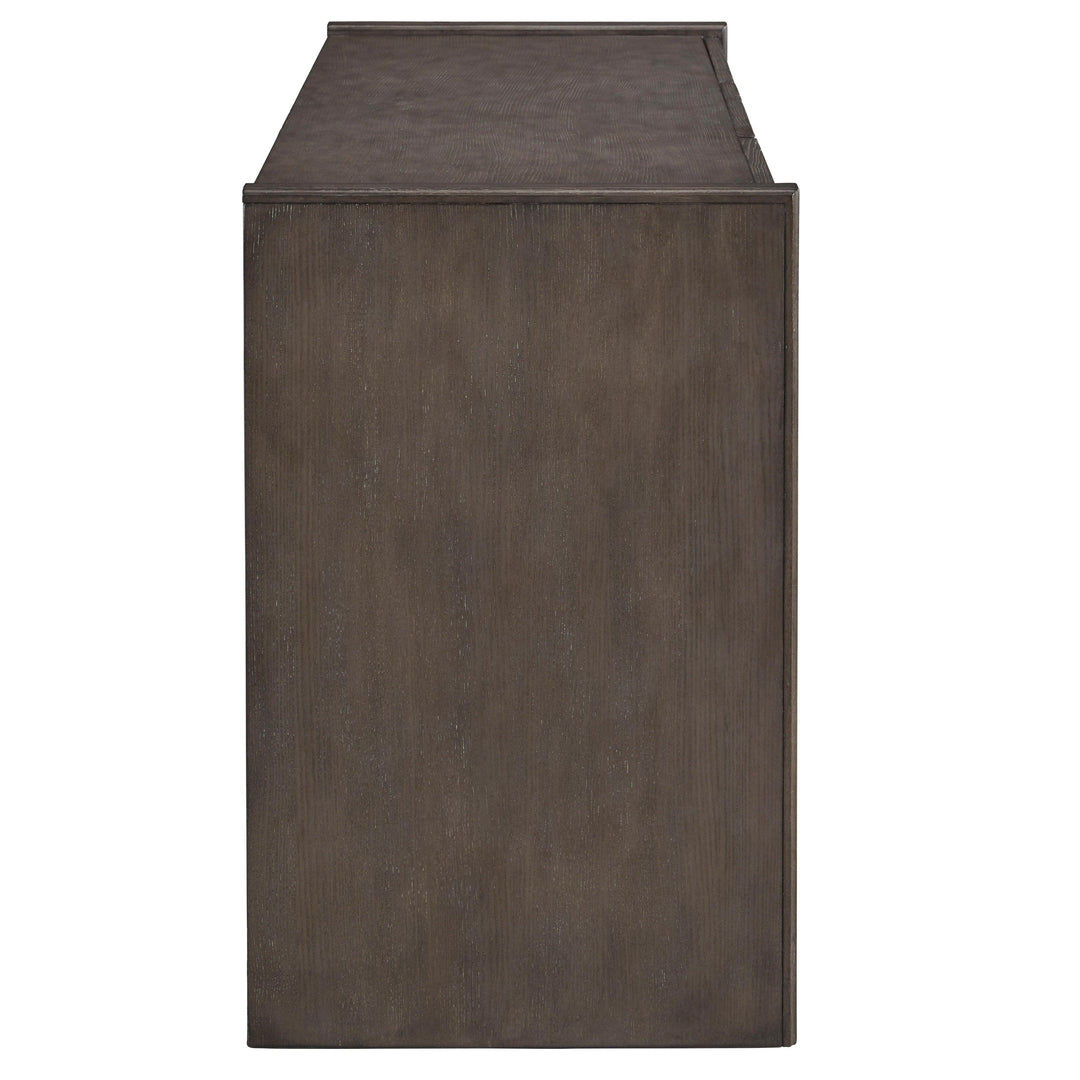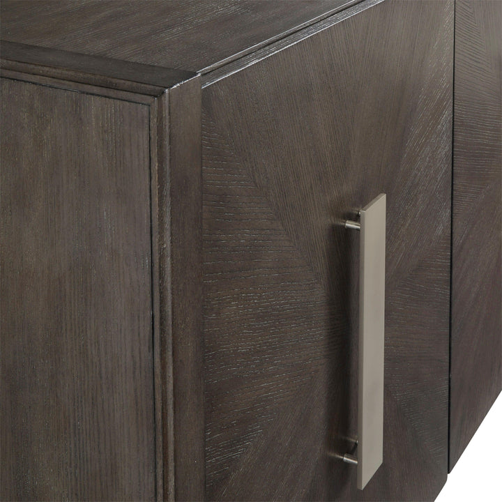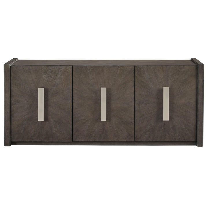 Add a touch of modern sophistication to your space with this stunning 3-door Credenza. Featuring a striking starburst wood design in a chic gray finish, this piece effortlessly blends contemporary style with timeless elegance. Made from premium quartered ash veneer and hardwood solids, it offers both durability and beauty. Behind each door, you'll find an adjustable/removable shelf for customizable storage, while cord access cutouts keep your media devices neatly organized. The custom hardware in a sleek satin nickel finish completes the look with a refined touch. This credenza combines functional storage with an eye-catching design, making it a centerpiece for any modern home.