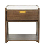 Transform any bedroom into a 5-star suite with this contemporary 1-drawer nightstand. Its quality craftsmanship highlights the beauty of its authentic white marble top, antique brass handles, and solid rubber wood in a dark finish.