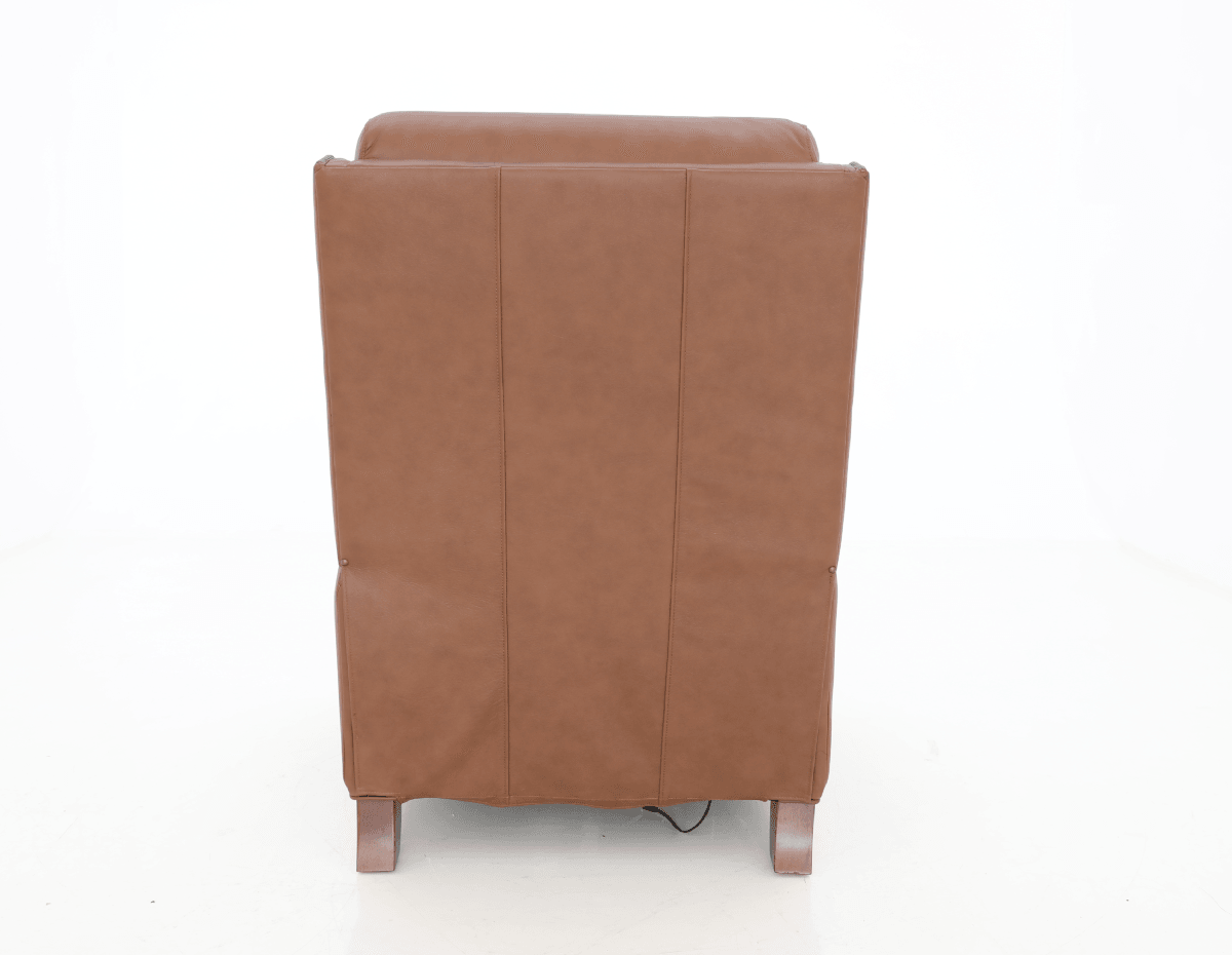 Triple power low leg recliner with power recline, power headrest and power lumbar. 44.9” high pub back design, loose welted box seat cushion with pocketed coil springs encased in foam, wrapped in Dacron with a feather blend topper, footrest extension, nail head trim accents, and tapered wood legs ?nished in a warm mahogany ?nish. This chair was designed for people over 6’