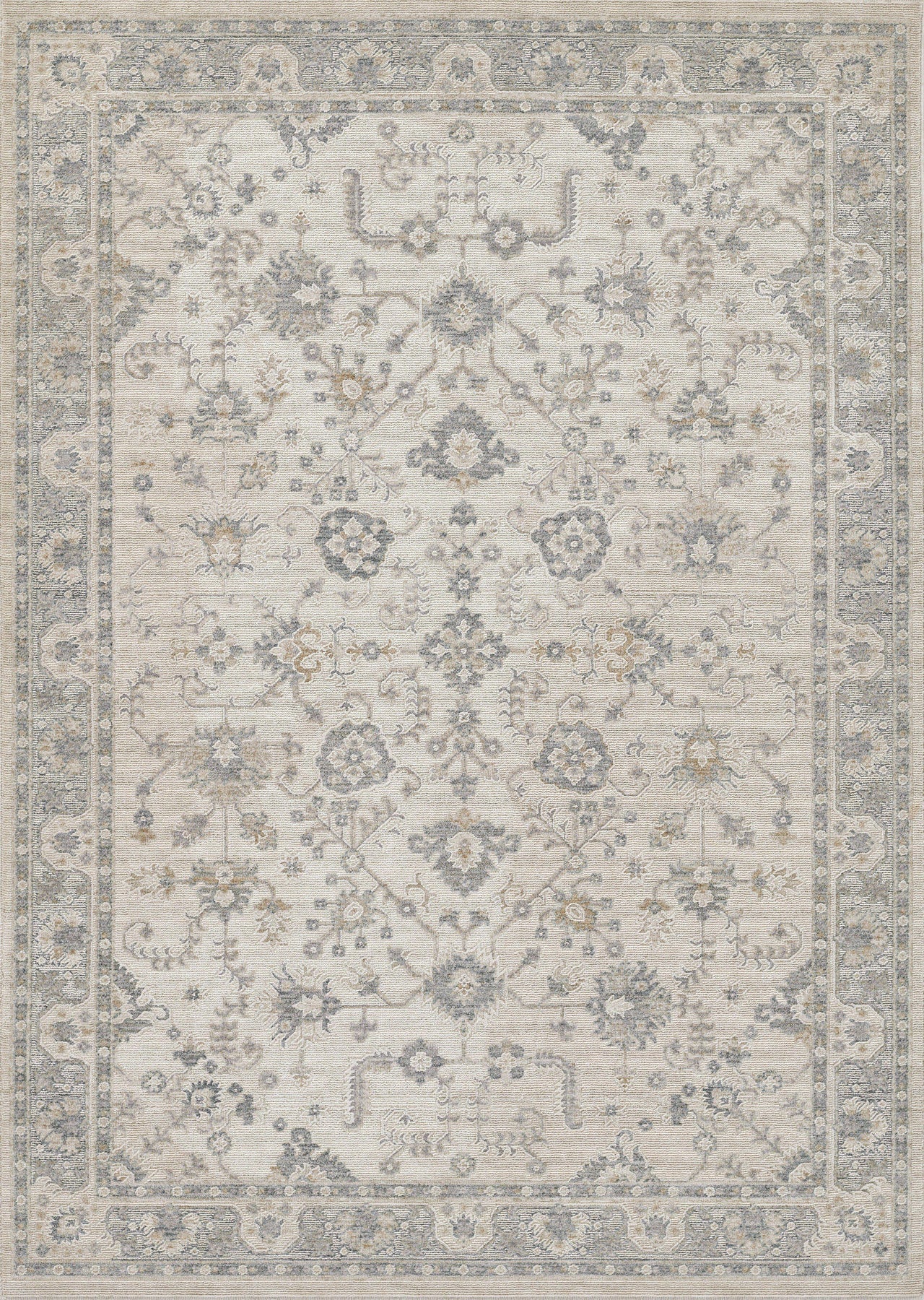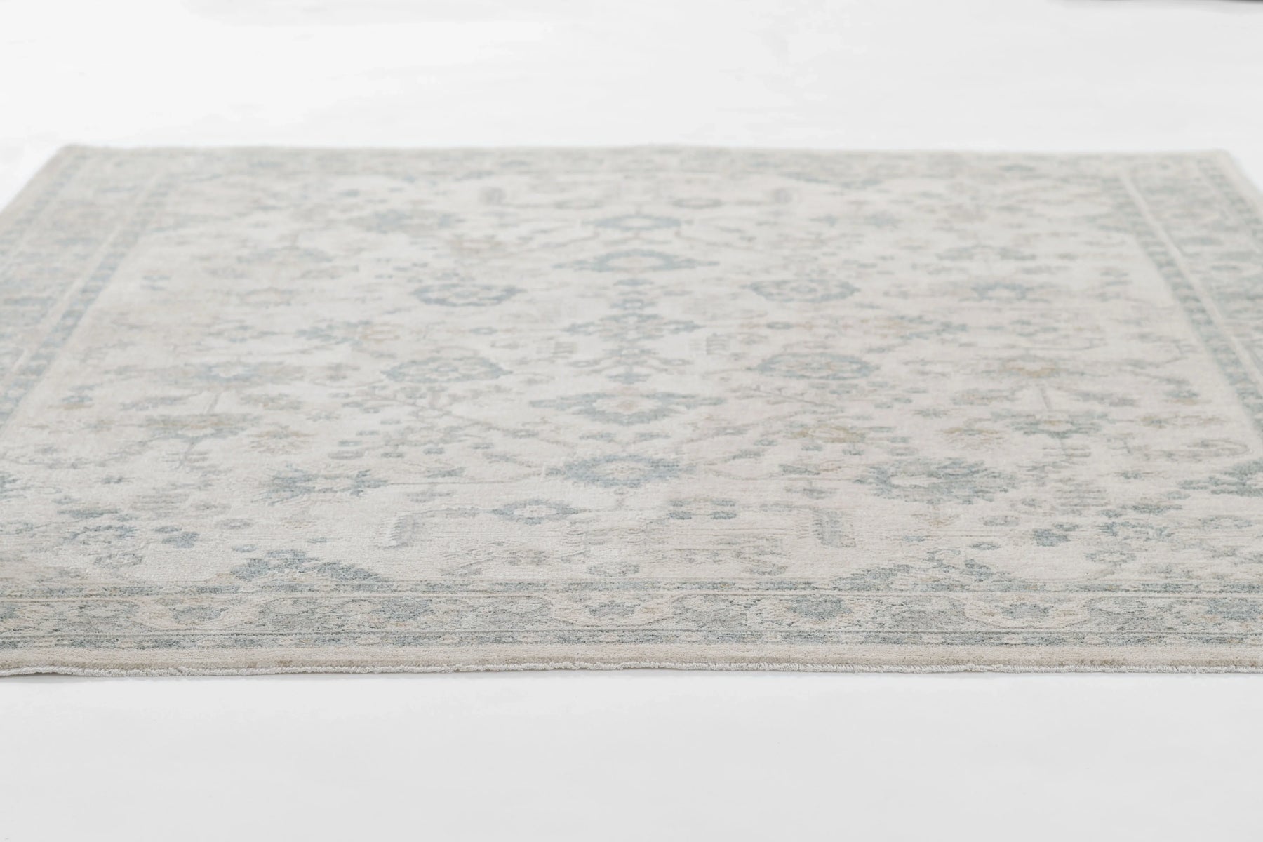 Inspired by classic Persian designs, this rug features an intricate floral pattern in soft shades of cream, gray, and pale blue. The delicate detailing and muted color palette creates a sophisticated, vintage-inspired look that adds warmth and character to any room. The carefully distressed finish gives the rug an authentic aged appearance, enhancing its old-world charm while maintaining a soft, modern touch. The detailed border frames the central design beautifully, adding structure and balance to the overall pattern. Transform your home with this stylish and practical solution— where quality meets design!