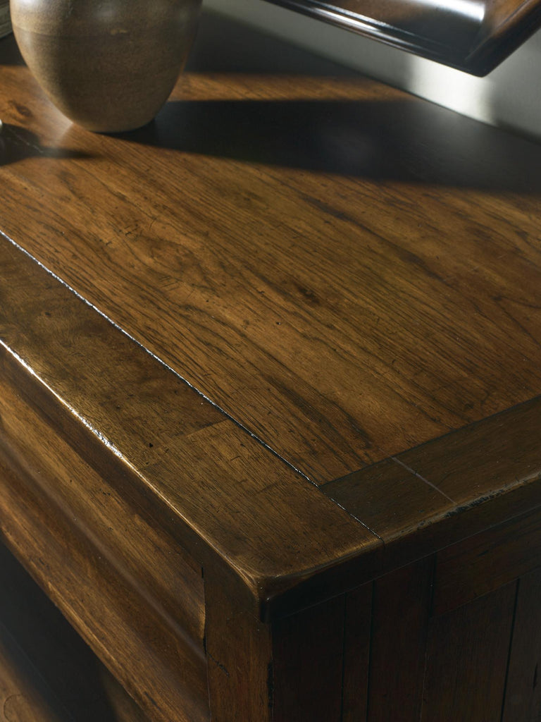 Make your bedroom a cozy retreat for movies at midnight with the TV and media-ready Archivist Bureau featuring a drop-down drawer to accommodate wire management and component storage. Inspired by epic European and American style elements, the bureau is comfortable and inviting with a world-traveled pedigree. Five drawers with the top left drawer offering a ventilated back and a front that flips back for component usage. The top right drawer is felt lined with a jewelry tray, and the bottom 3 drawers have 2 removable dividers. The bottom drawer is cedar lined. Featured in a soft casual finish over Pecky Pecan Veneers for a rustic, authentic look.
