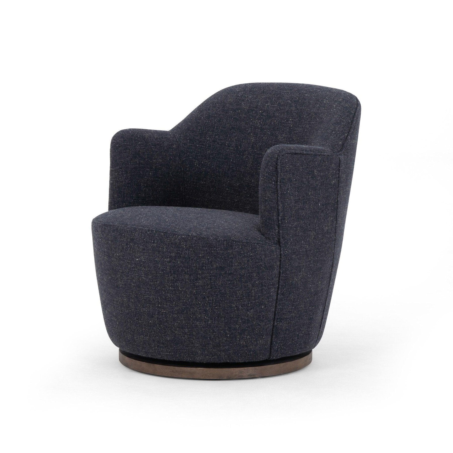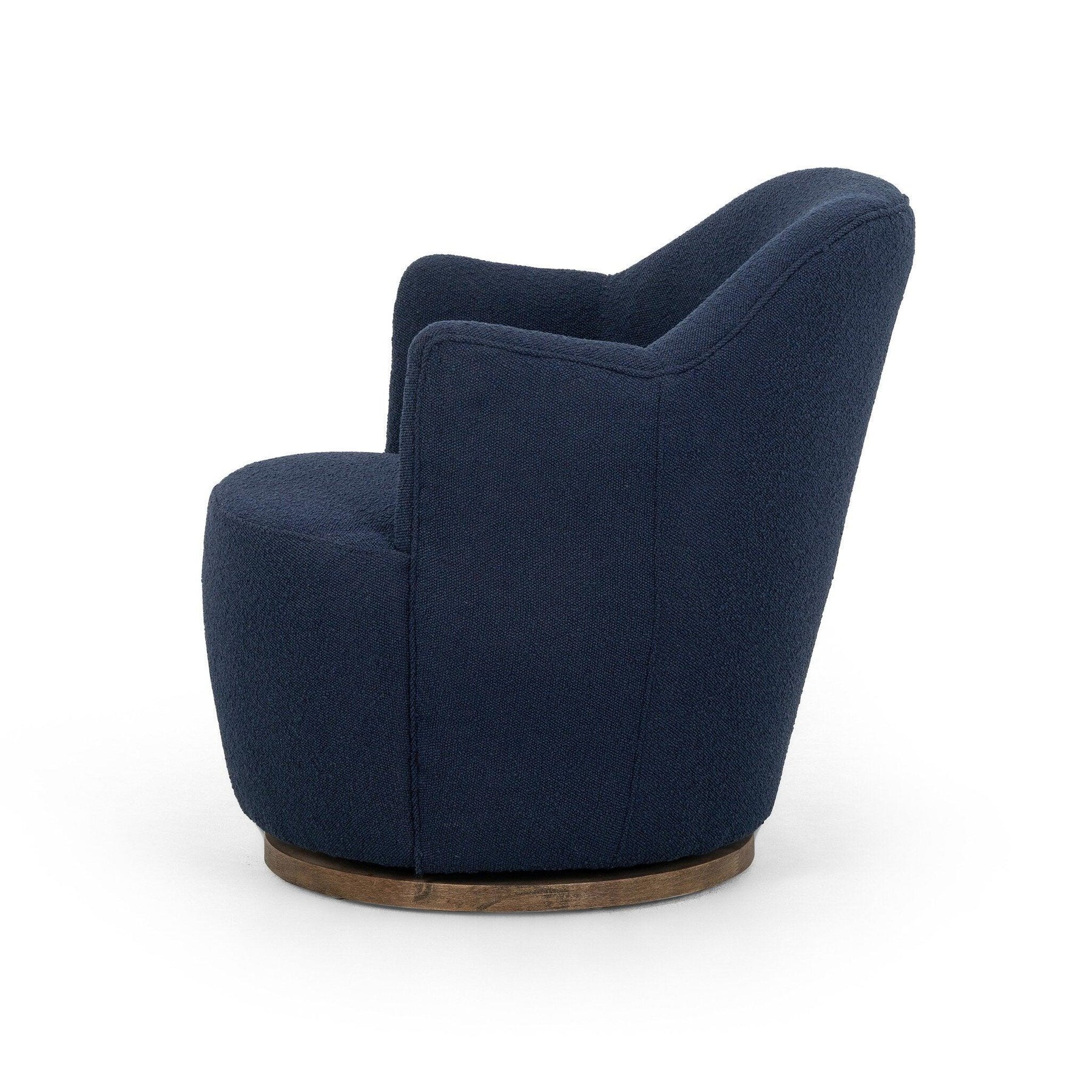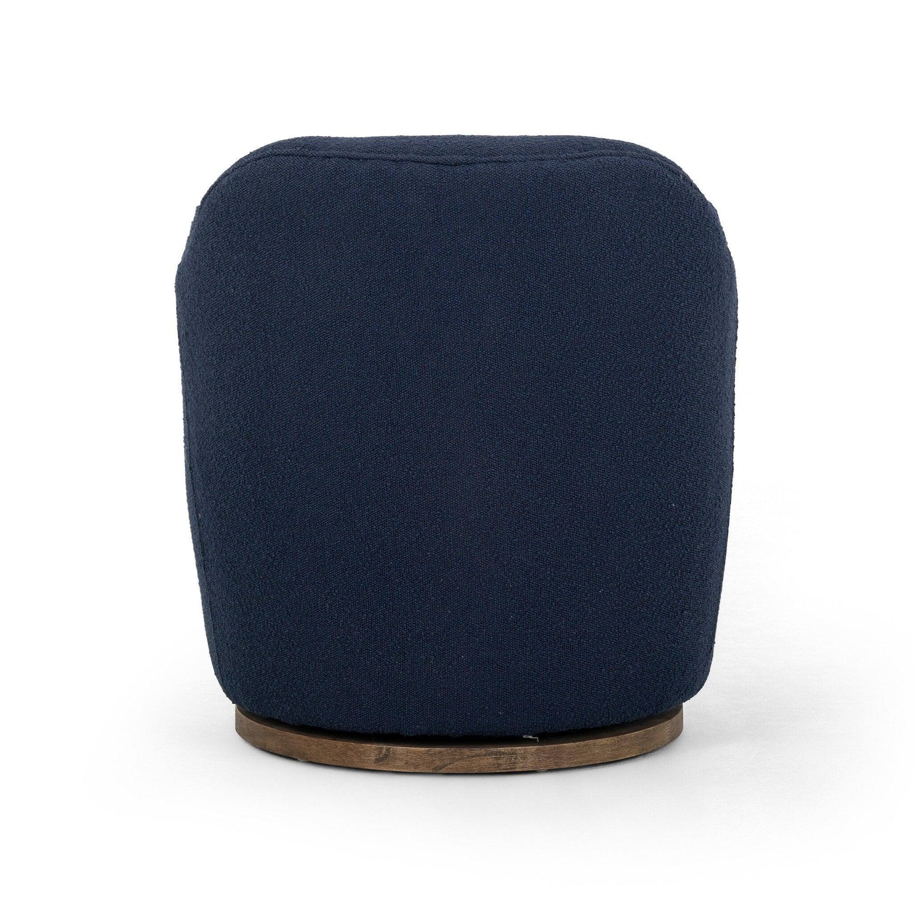 Intriguing and inviting. Drum-style seating is upholstered in a soothing and textural indigo bouclé. A 360-degree swivel base of solid parawood places a fresh spin on a feminine form.