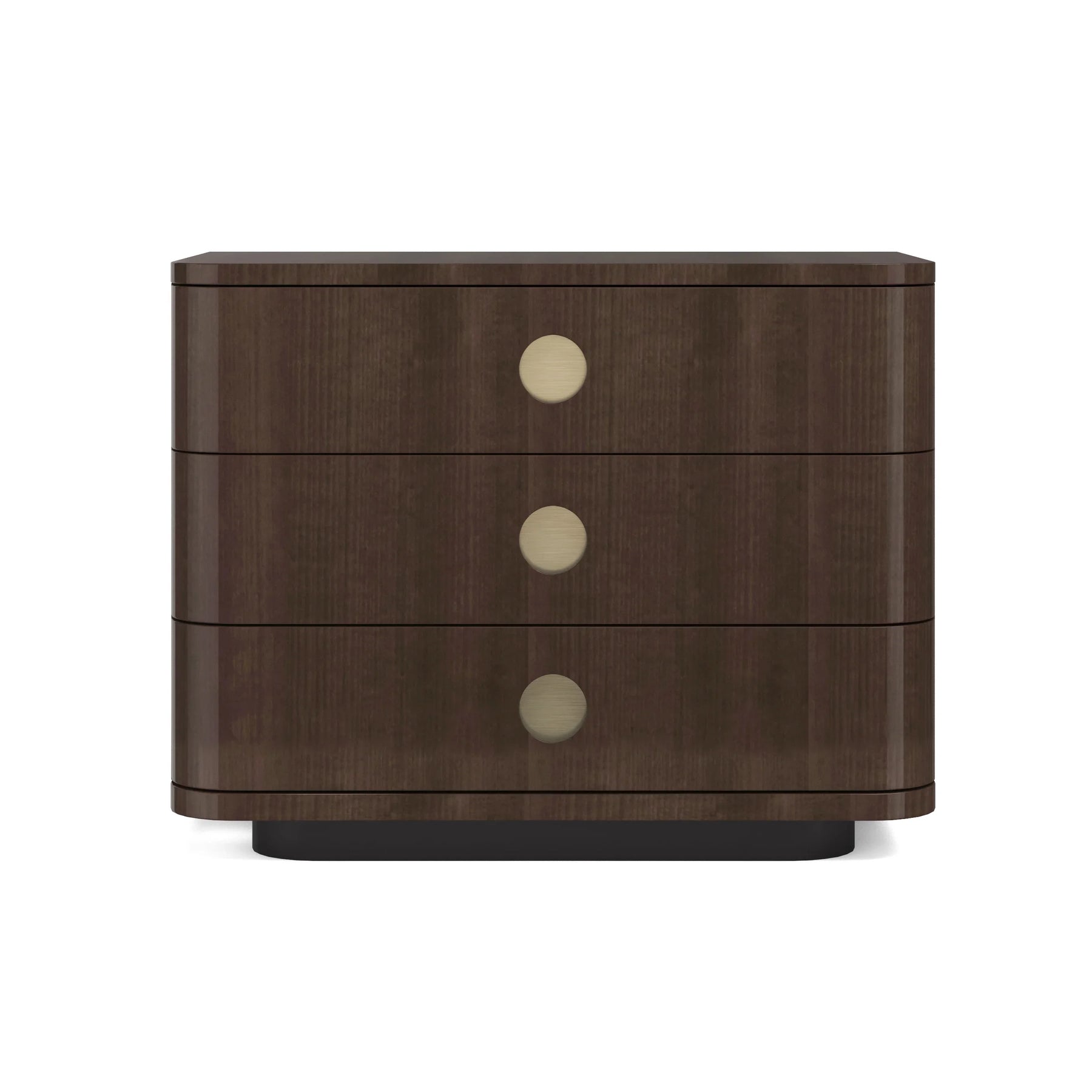 This large, masculine nightstand uses hand-applied Tupelo veneers with a high-gloss Otter finish to achieve its handsome demeanor. The three drawers have rounded front edges and are punctuated by three recessed porthole pulls in Champagne Gold. The soft-closing drawers open to deep cases finished in UV Noir. The Dark Chocolate base is reset as a finishing touch.
