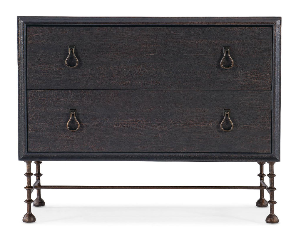 Warm and rustic, the Big Sky Bachelor’s Chest has a vintage design pairing a case crafted of rustic Pecky Hickory Veneers in the dark Charred Timber finish with turned metal legs and stretchers. Featuring two drawers, the top drawer has a removable felt liner and the bottom drawer is cedar-lined. There’s an FC707 power bar with 3 electrical outlets and one live USB port and a cord clip on the back.