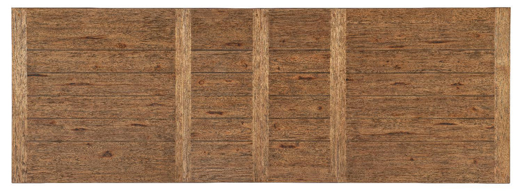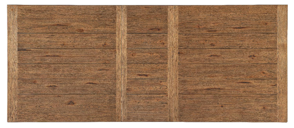 Create a dining experience as large as the landscapes in America’s wilderness with the Big Sky Trestle Dining Table. Crafted of Pecky Hickory Veneers with an authentic solid-wood edged top, the tabletop is finished in the warm Vintage Natural finish, contrasting with an X-style base in the Charred Timber finish. The table has two 20-inch leaves, extending to 132 inches long with both leaves in place. Without the leaf, the table accommodates 2 coordinating arm chairs and 4 side chairs; with one leaf, it accommodates 8 chairs and with both leaves, it accommodates 10 chairs.