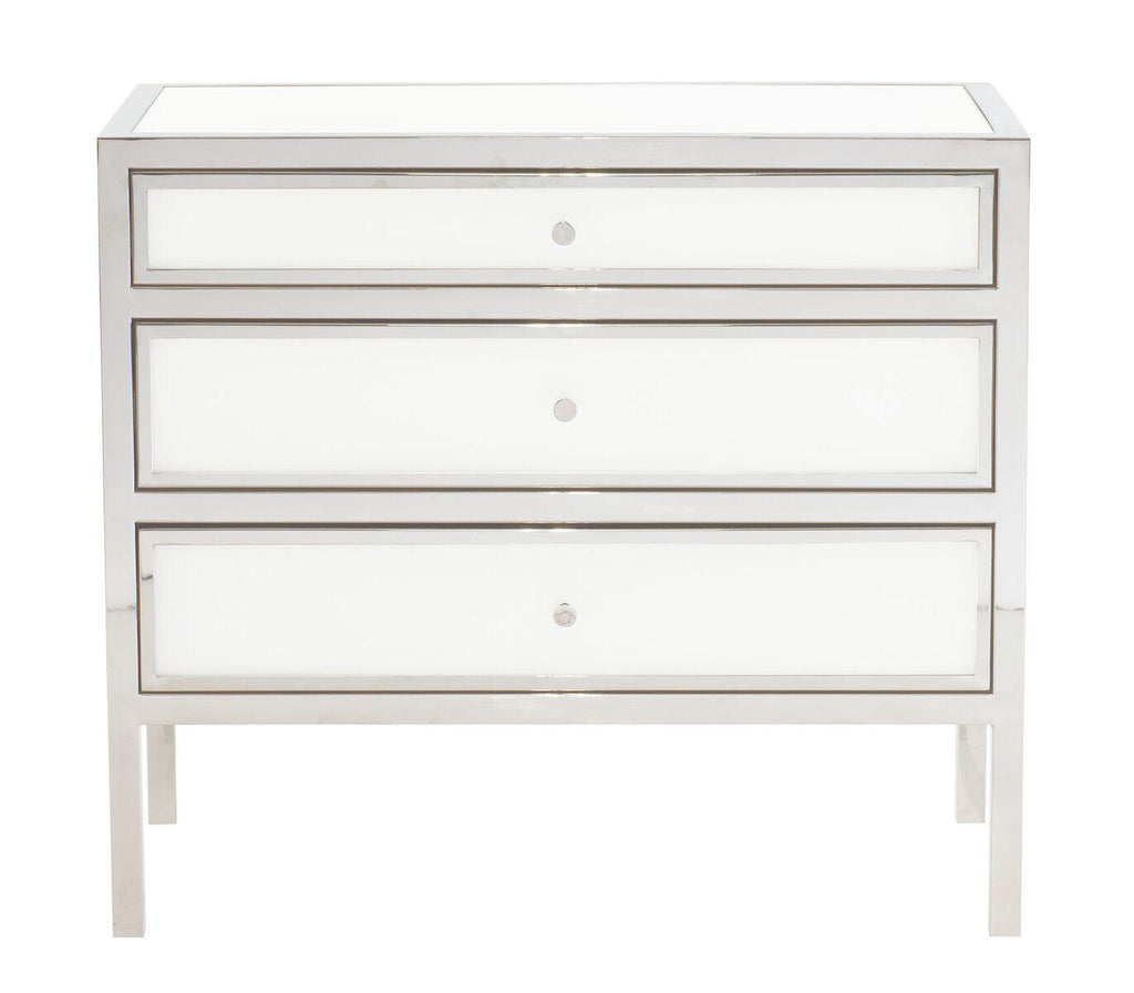 Nightstand Solid And Tubular Polished Stainless Steel Frame/ Inset Snow Glass On Top/ End Panels And Drawer Fronts/ Three Drawers W/ White Painted Interior/ Adjustable Glides