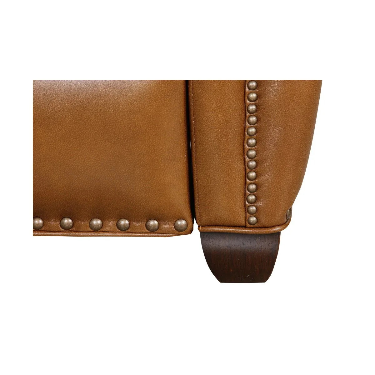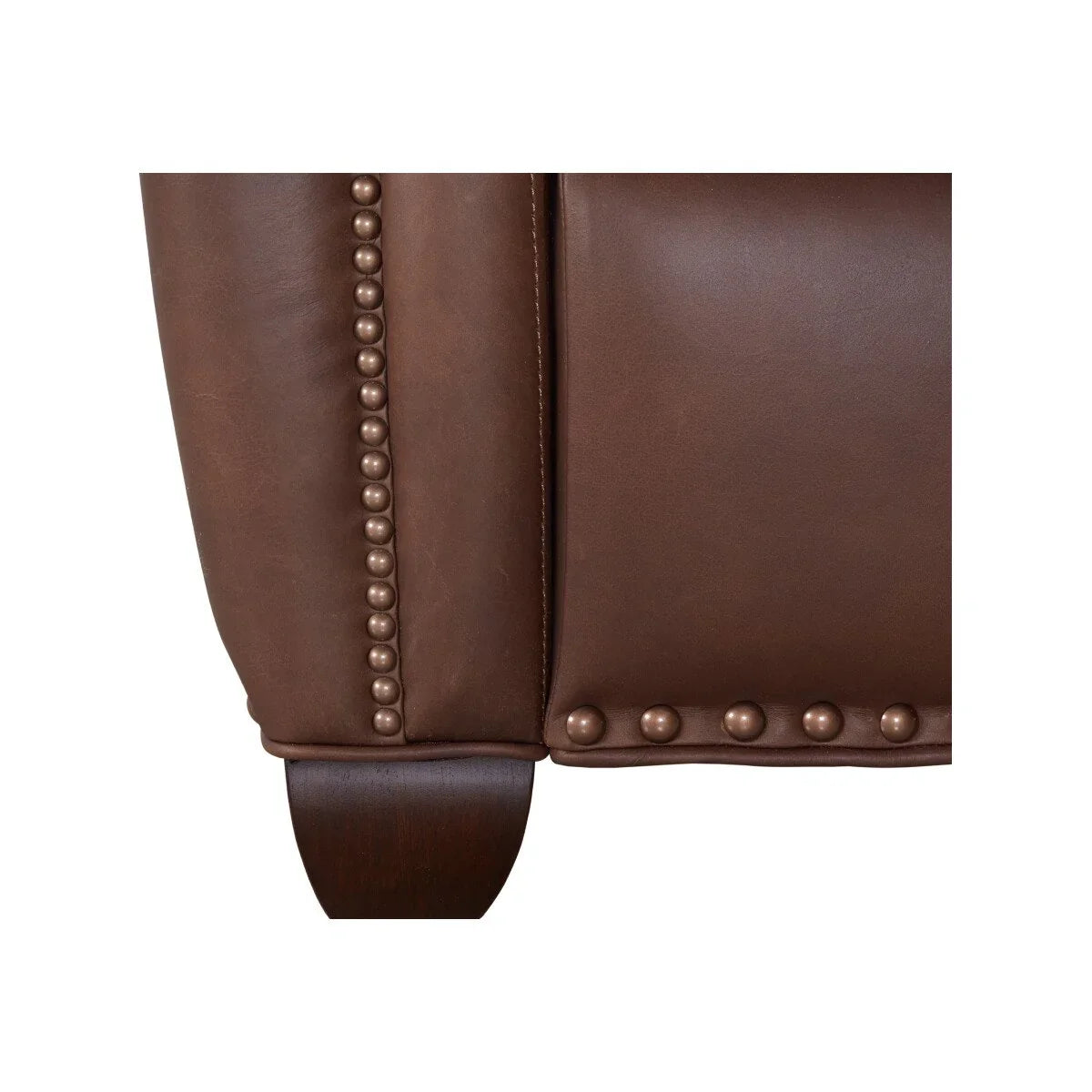 Transitional banded pillow back sofa with power headrests, power recline, ergonomically shaped hockey stick padded arms, and boxed style pad over chaise seating with pocketed coil springs encased in foam, wrapped in Dacron, with a down blend topper. Nail head trim accents the wings, arm fronts, and bottom of the footrest/ottoman. Hand carved tapered wood legs. Inside arm controls with USB ports.