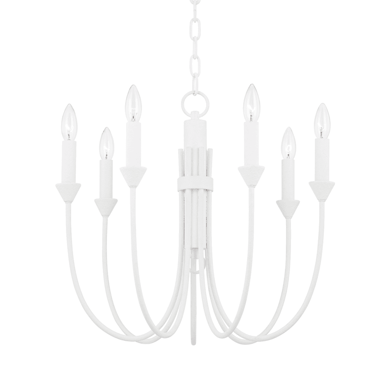 Cate's large swooping arms give the piece a presence while still feeling open and airy at the same time. Whether as a simple single sconce or a breathtaking18-light chandelier, each smooth arm holds a solitary bulb that emits a warm glow. Make a bold statement in Forged Iron or keep things beautifully clean in White Gesso.