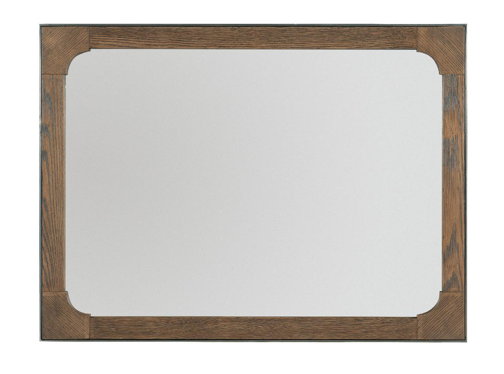 In an updated Craftsman style, the Chapman rectangle-shaped mirror has a casual warm brown finish over White Oak with a hand-hammered forged pewter metal insert around the frame.