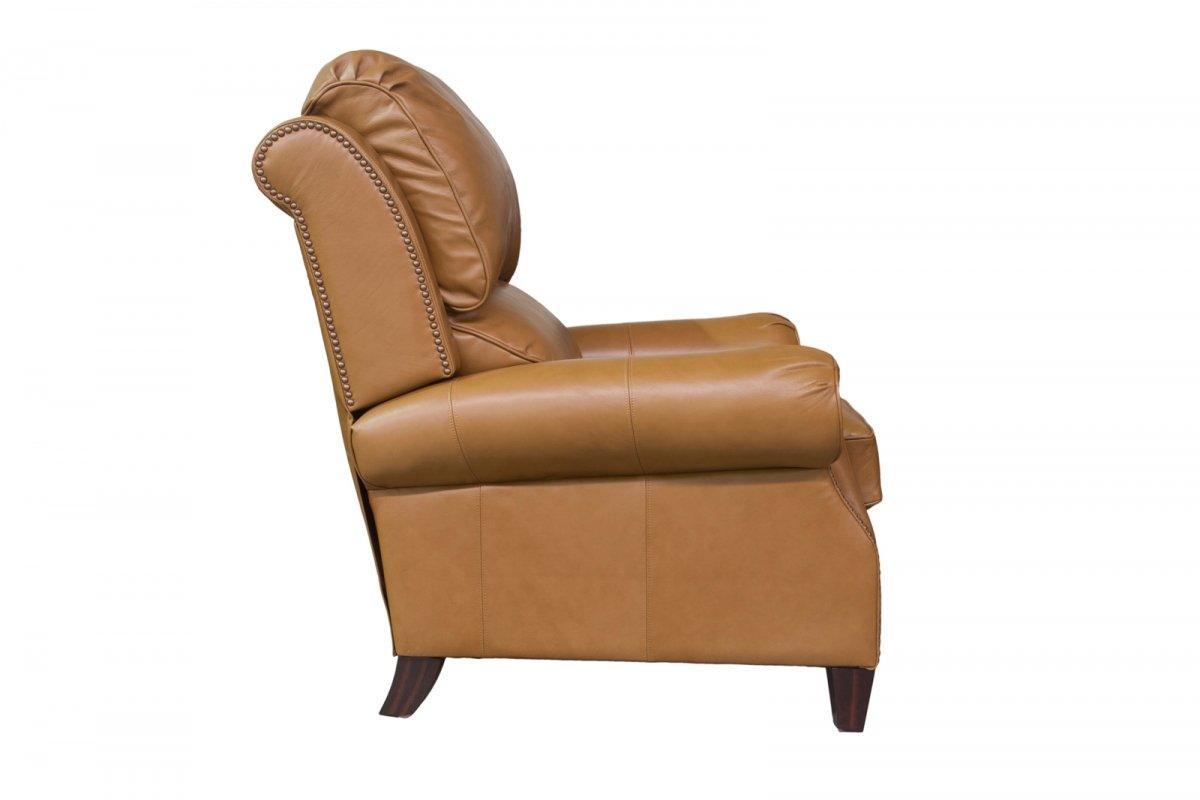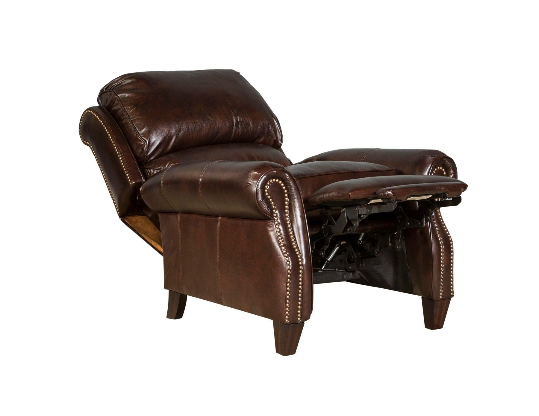 The classic pub back recliner with brass nail head treatment is enriched with luxurious comfort through personalized adjustable upper and lower back pillows.