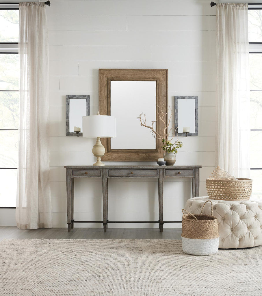 Make room for style in your tightest spaces with the 3-drawer Ciao Bella Narrow Console in a Speckled Gray finish that looks like it has aged through generations. At only 14 inches deep and 68 inches wide, the console packs fashion and function into small spaces. The Aged Bronze Metal Stretcher makes this farmhouse-inspired piece fresh and updated for today's interiors.