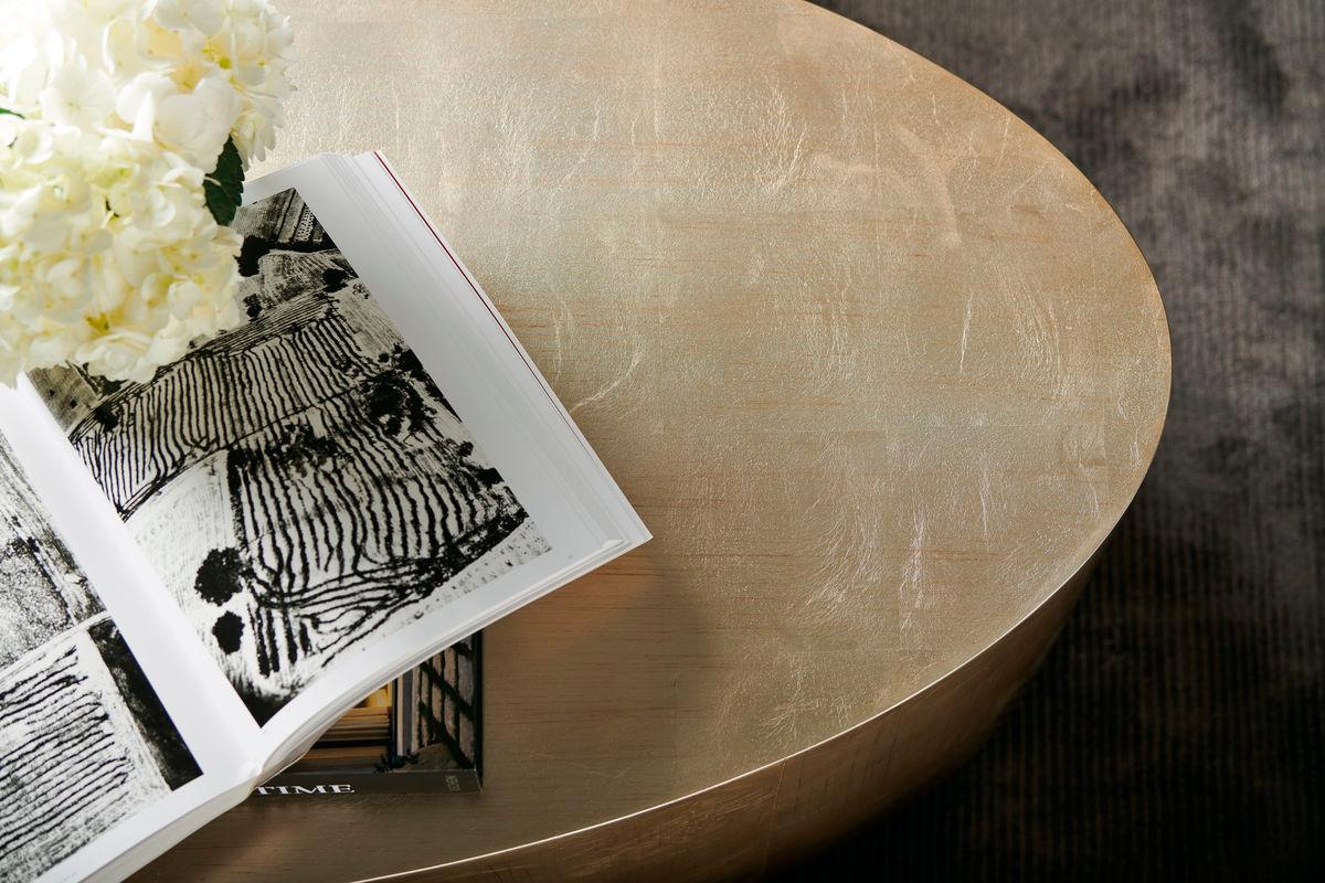 Not only does the oval shape encourage easy movement and flow around a seating area, this clever cocktail table adds such sparkle to a room. Available in our most popular silver and gold leaf finish, Pompeii, and complemented by a rich Charcoal-finished base. A perfect transitional piece – it works in both traditional or contemporary settings. Oval table in Pompeii finish. Charcoal base. Each element of the Come Oval Here! Cocktail Table is engineered to the same exacting standard Caracole applies across its entire collection — from the precisely applied surface treatment to the robust case construction underneath.