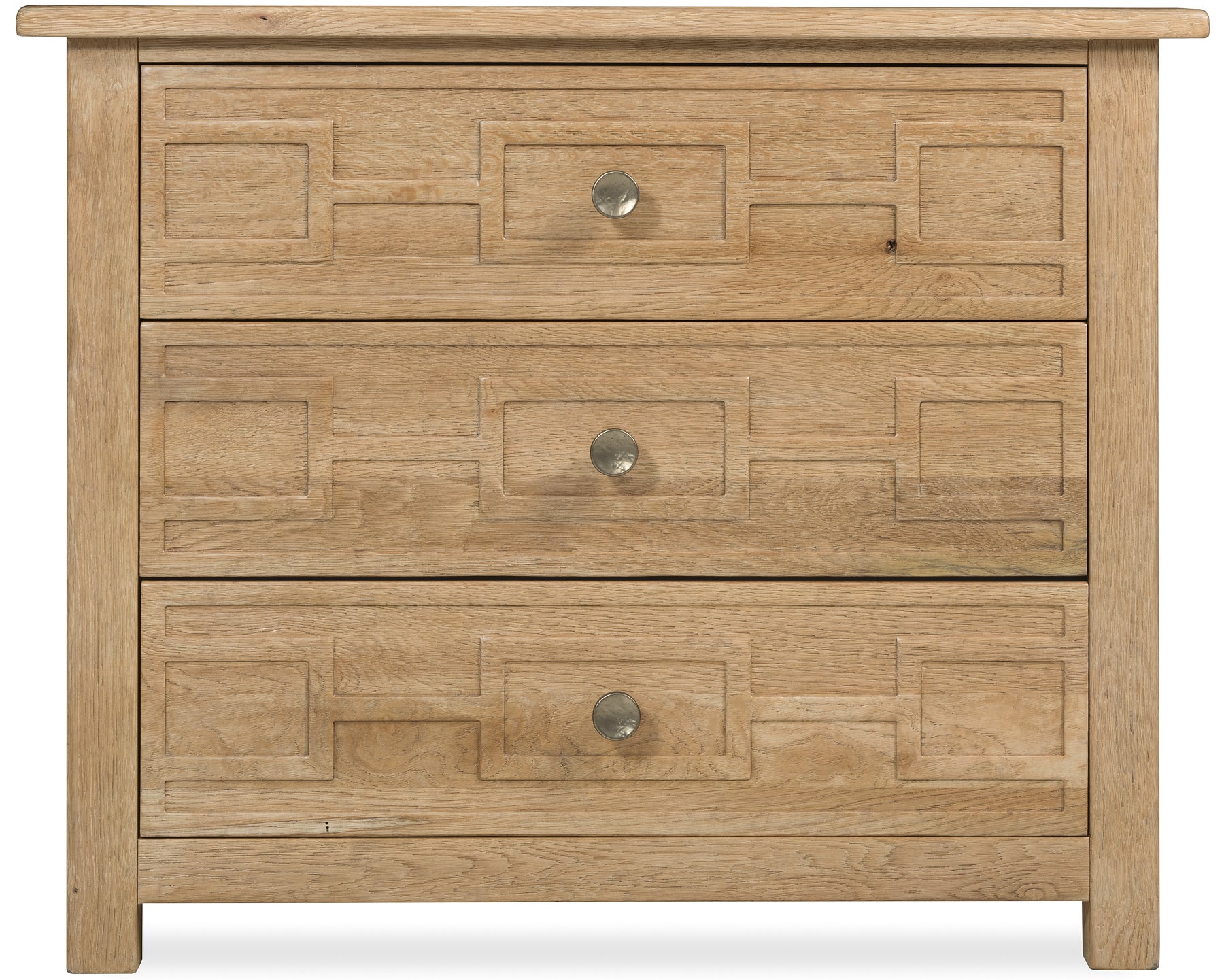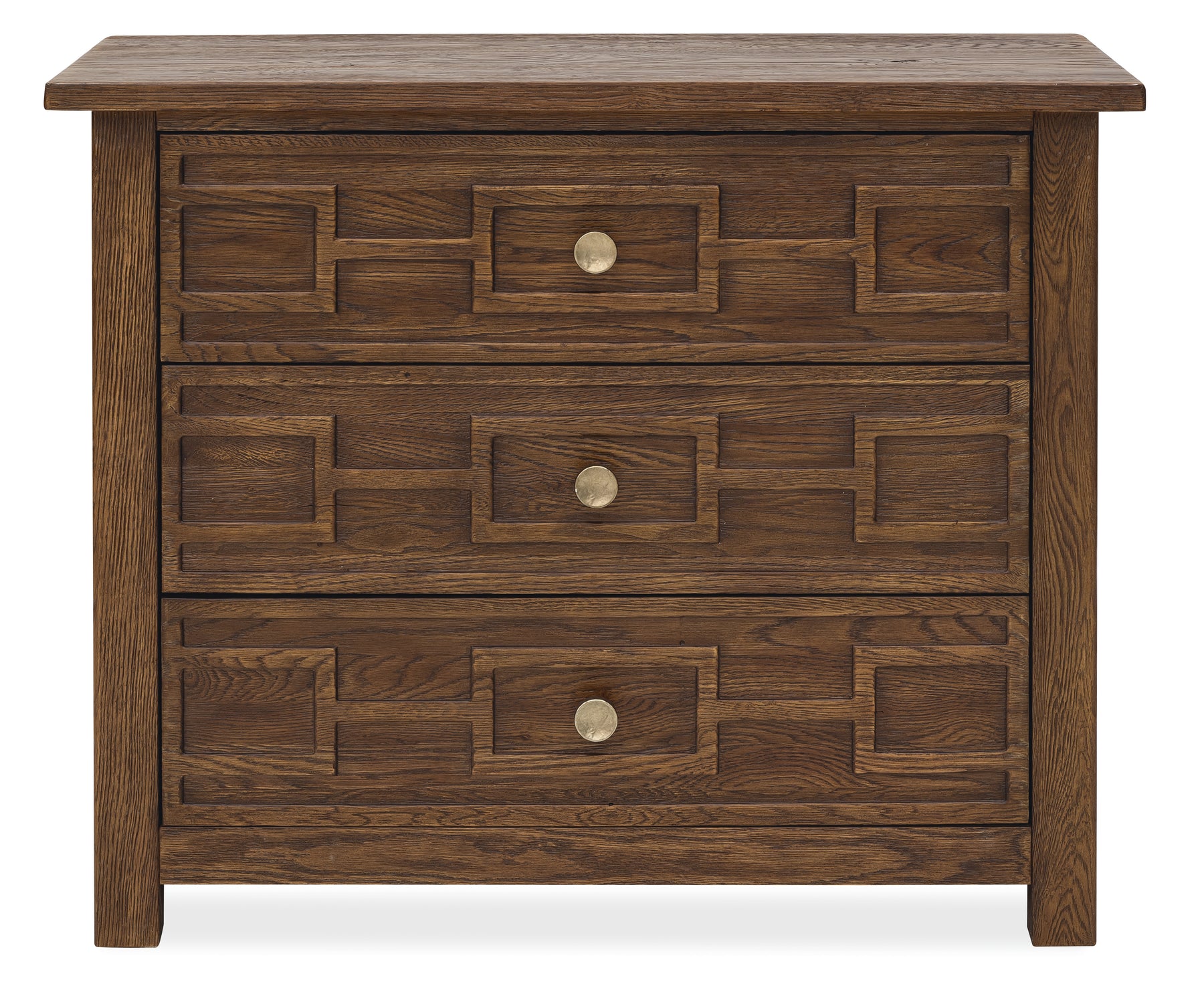 Finished in Buckboard, this bachelor's chest highlights a geometric drawer front design with three self-closing drawers, including a cedar-lined bottom drawer. Compact yet functional, it’s perfect as a nightstand or storage piece with a casual yet refined style.