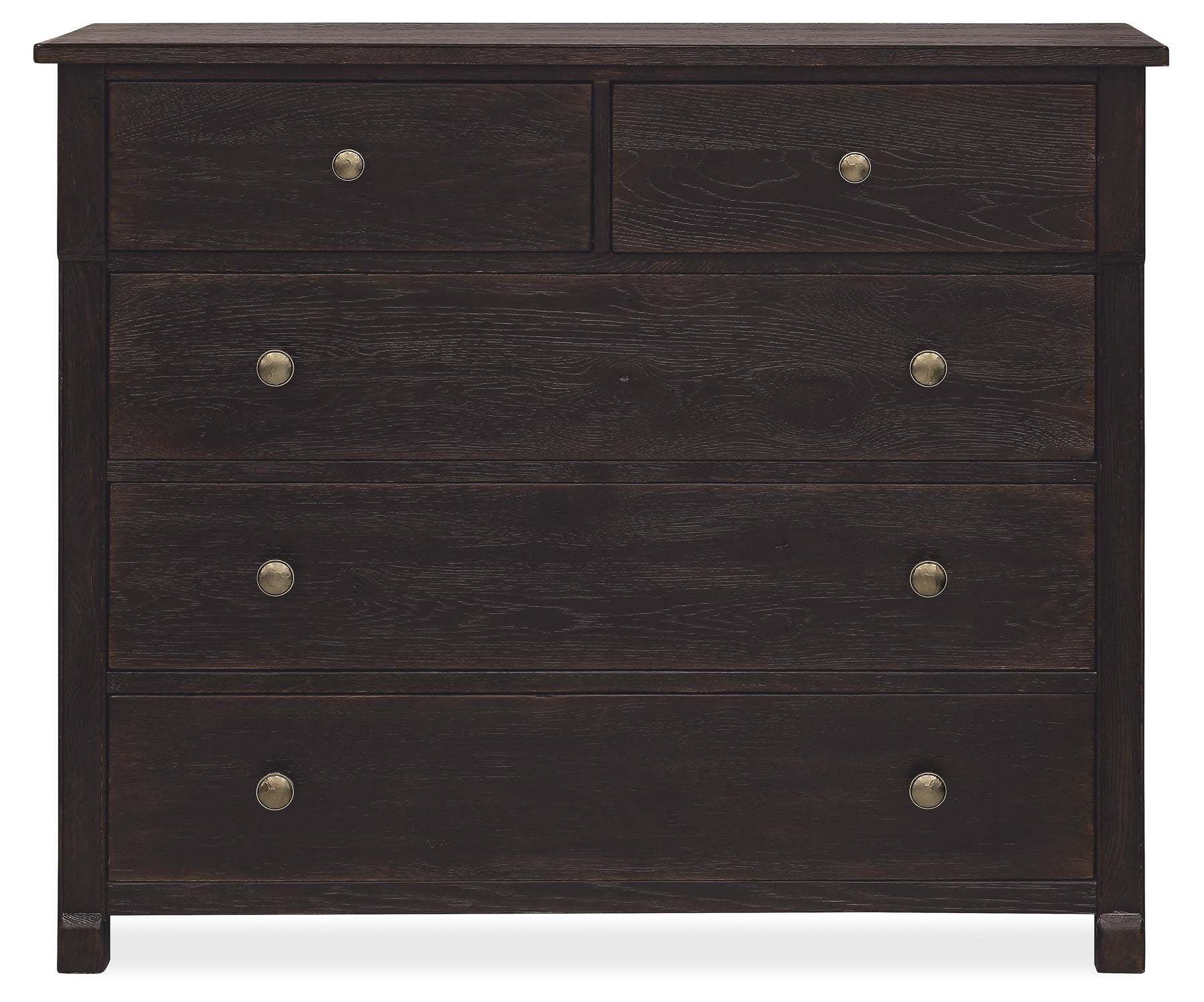 Finished in Buckboard, this five-drawer chest provides ample storage with its self-closing drawers, while the cedar-lined bottom drawer keeps clothes fresh. Its warm tones and detailed craftsmanship make it a stylish yet practical addition to any bedroom.