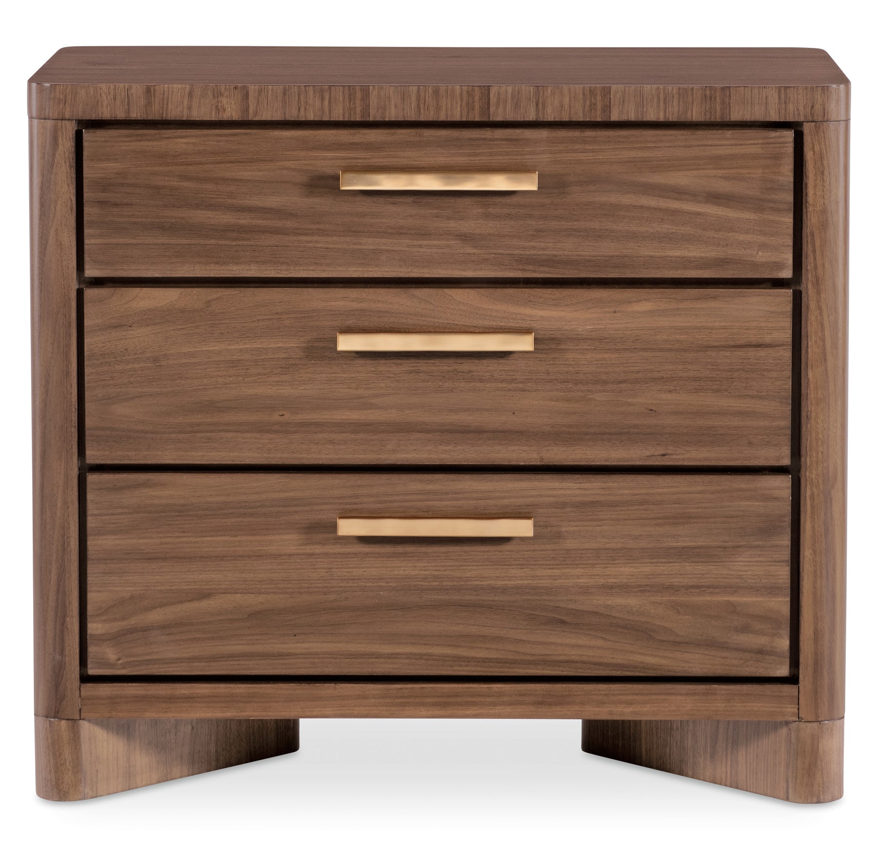 Designed for convenience and style, the Eleana Three Drawer Nightstand features Light Caramel walnut veneers, plated bronze hardware, and rounded corners. Its integrated charging station with dual outlets, along with three self-closing drawers, makes it both functional and luxurious for bedside storage.