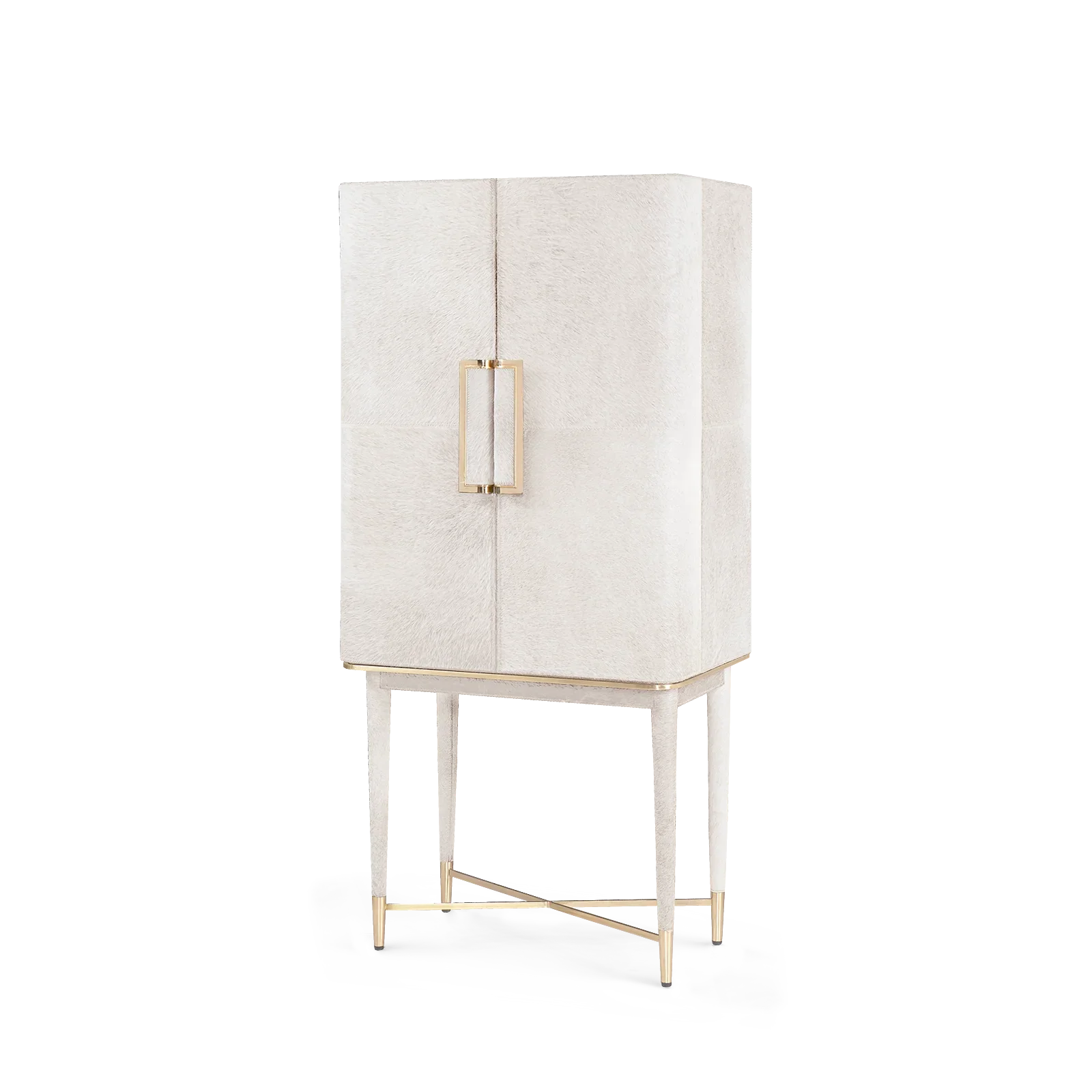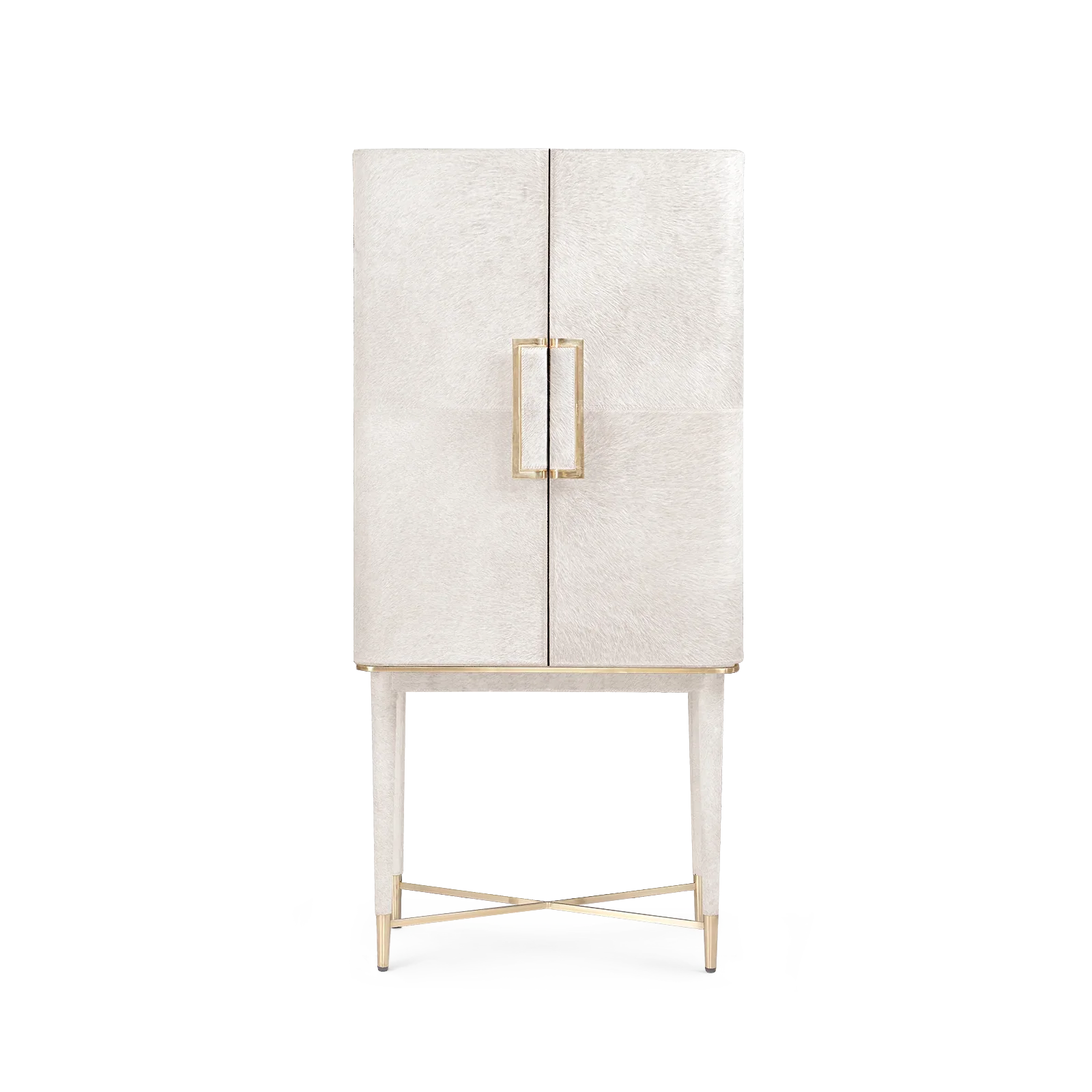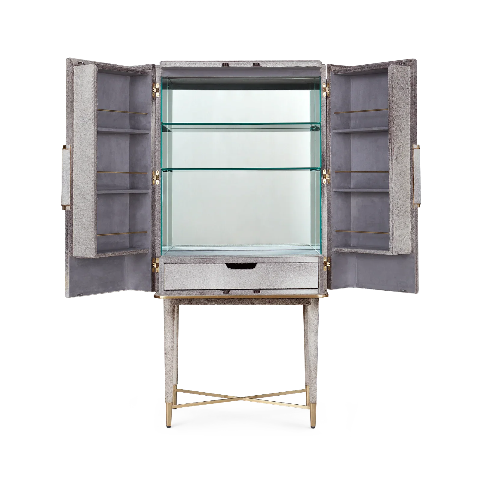 Home entertaining has never looked so fabulous. The Florian Tall Bar Cabinet is an essential piece for every host with the most, boasting a glamorous exterior and stunning reveals. A luxurious upgrade of Art Deco design, the cabinet is draped in plush white hair-on-hide with polished brass accents throughout, from its pulls to its crossbar and sabots. The wow-factor continues upon opening, where a swanky interior space boasts rich micro-suede, glass shelving, and a glittering mirrored back. With two center shelves, six fixed door shelves, and an additional hair-on-hide drawer within, the Florian provides plenty of storage for all your home bar needs. An upscale pick for any home, and especially useful in smaller spaces in need of compact storage.