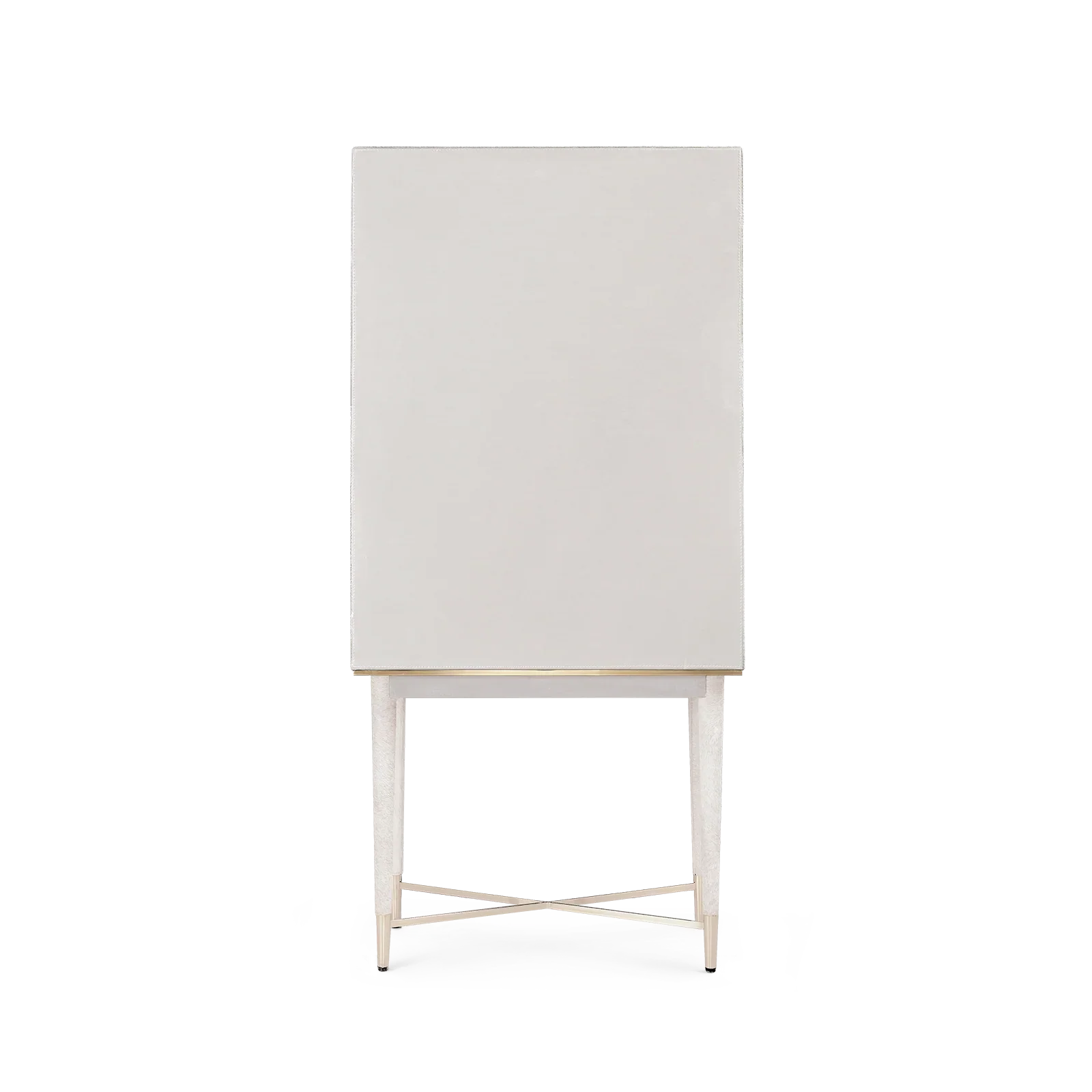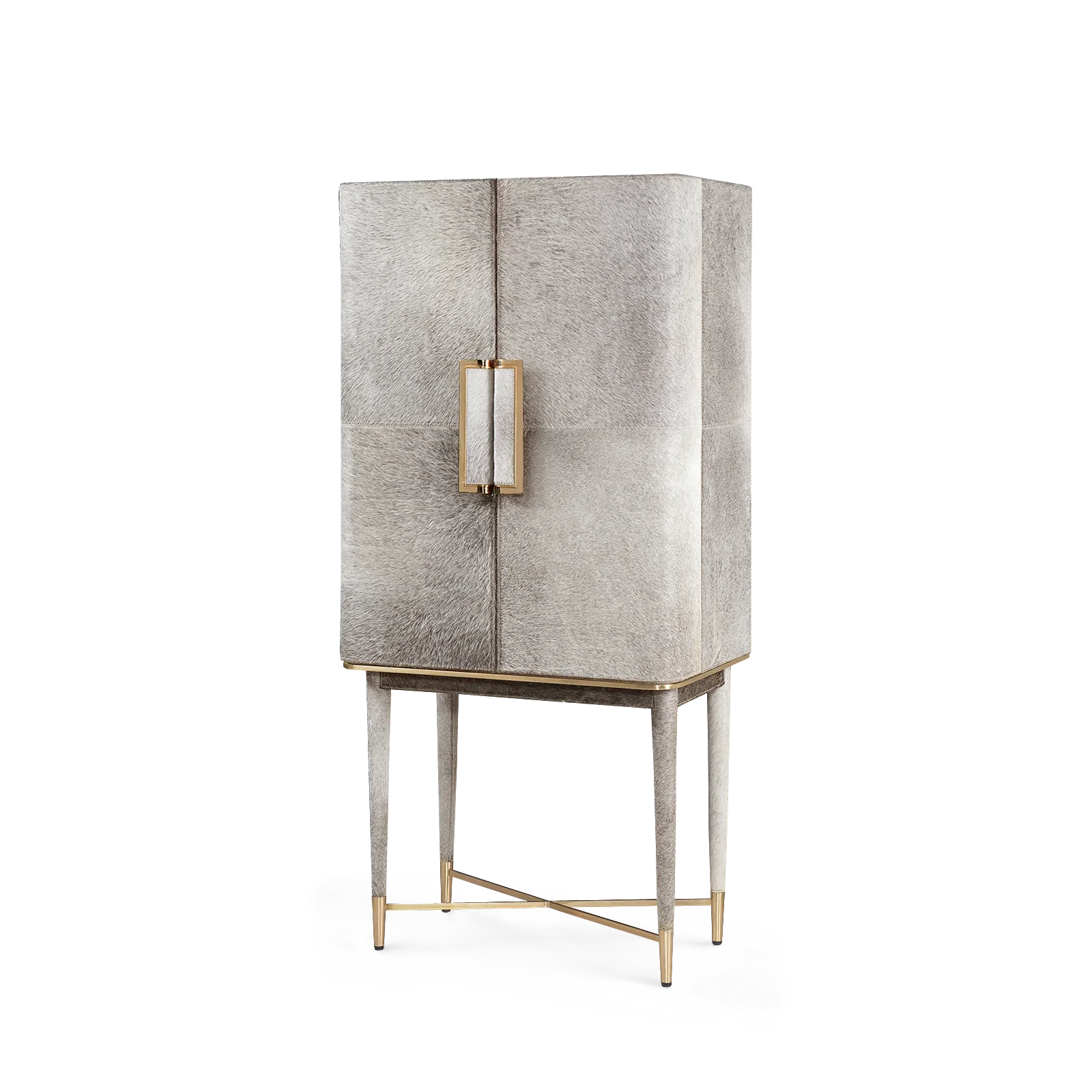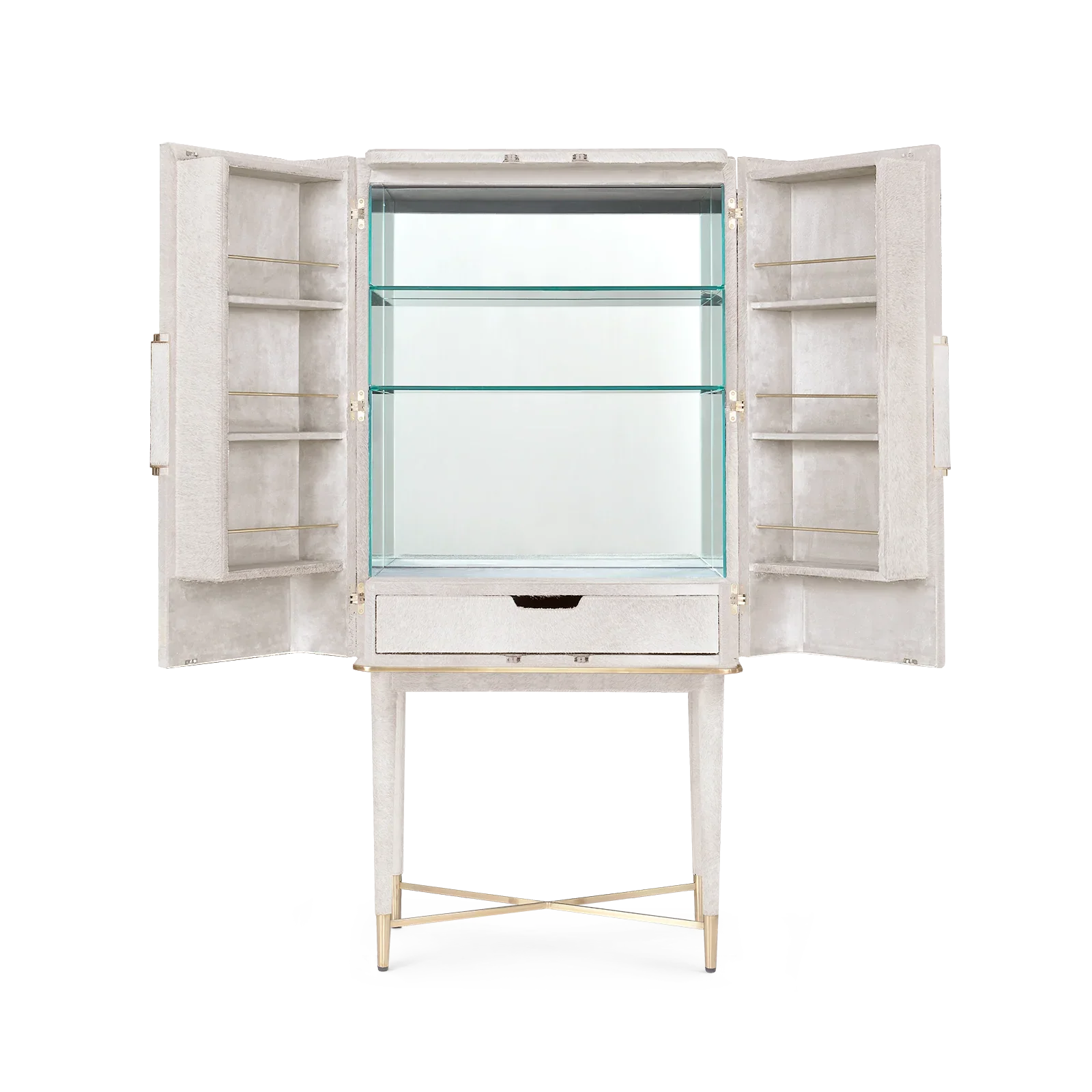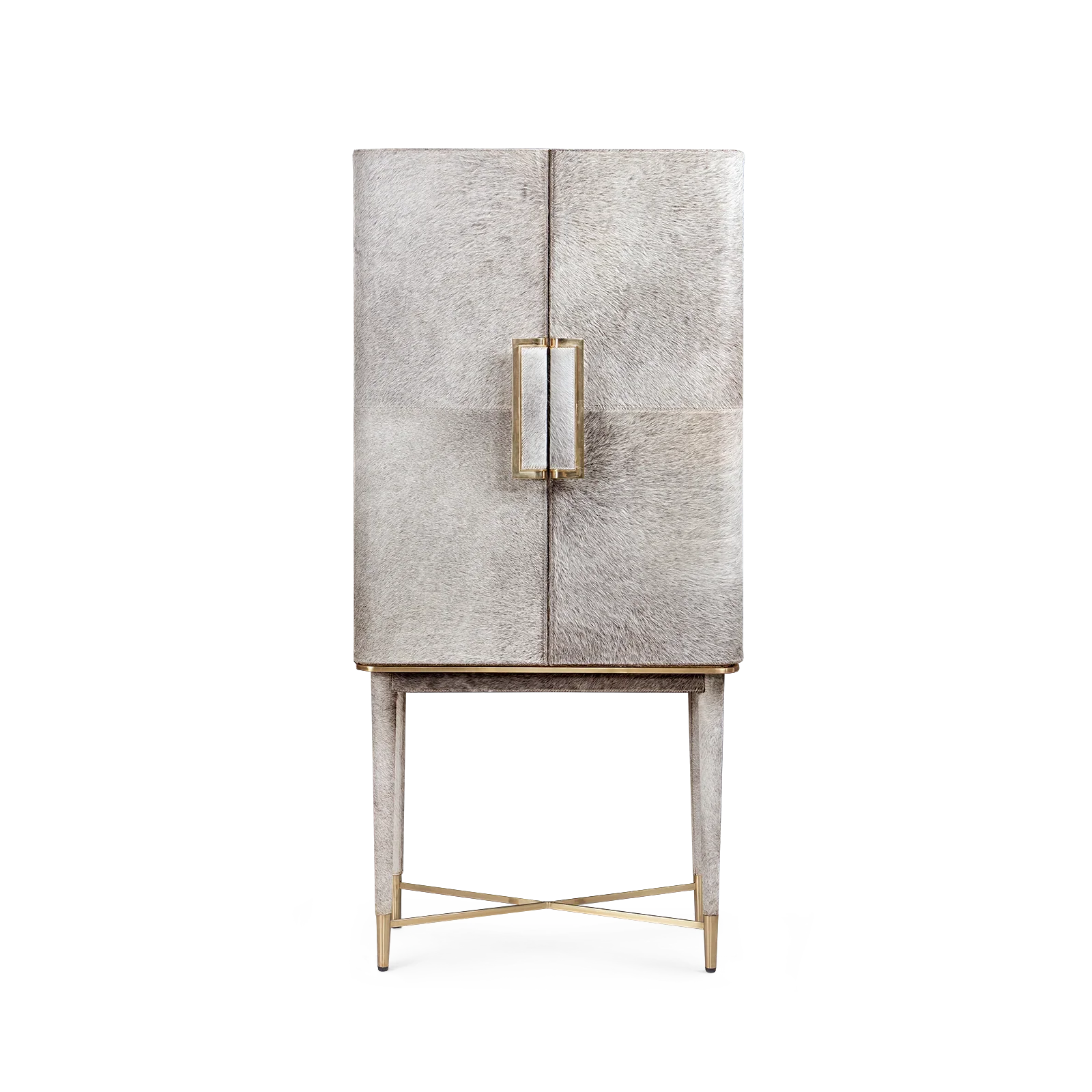 Home entertaining has never looked so fabulous. The Florian Tall Bar Cabinet is an essential piece for every host with the most, boasting a glamorous exterior and stunning reveals. A luxurious upgrade of Art Deco design, the cabinet is draped in plush white hair-on-hide with polished brass accents throughout, from its pulls to its crossbar and sabots. The wow-factor continues upon opening, where a swanky interior space boasts rich micro-suede, glass shelving, and a glittering mirrored back. With two center shelves, six fixed door shelves, and an additional hair-on-hide drawer within, the Florian provides plenty of storage for all your home bar needs. An upscale pick for any home, and especially useful in smaller spaces in need of compact storage.