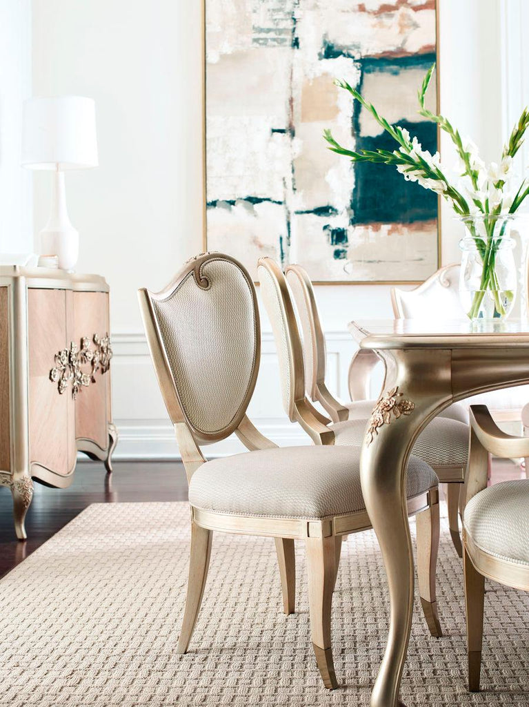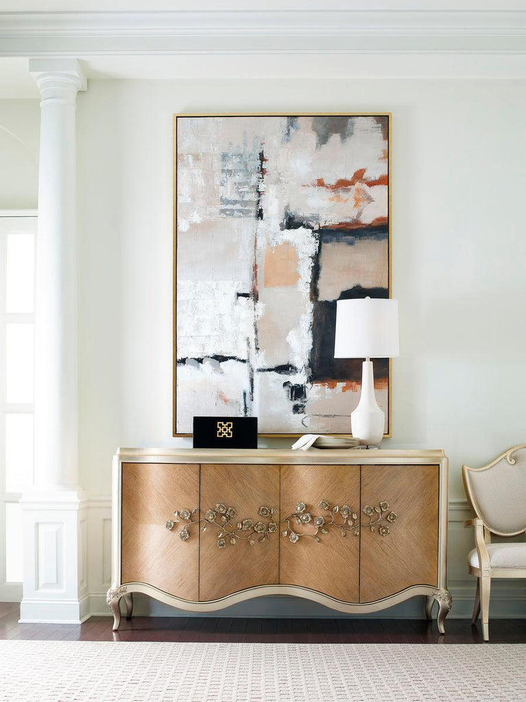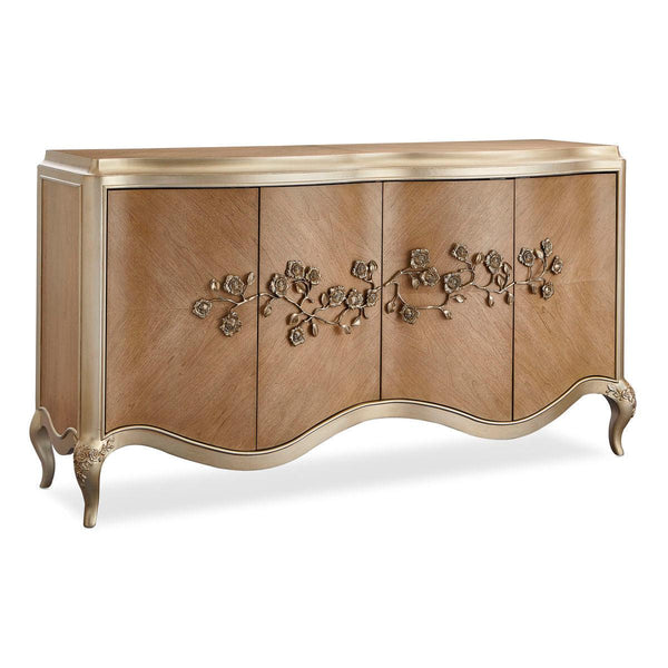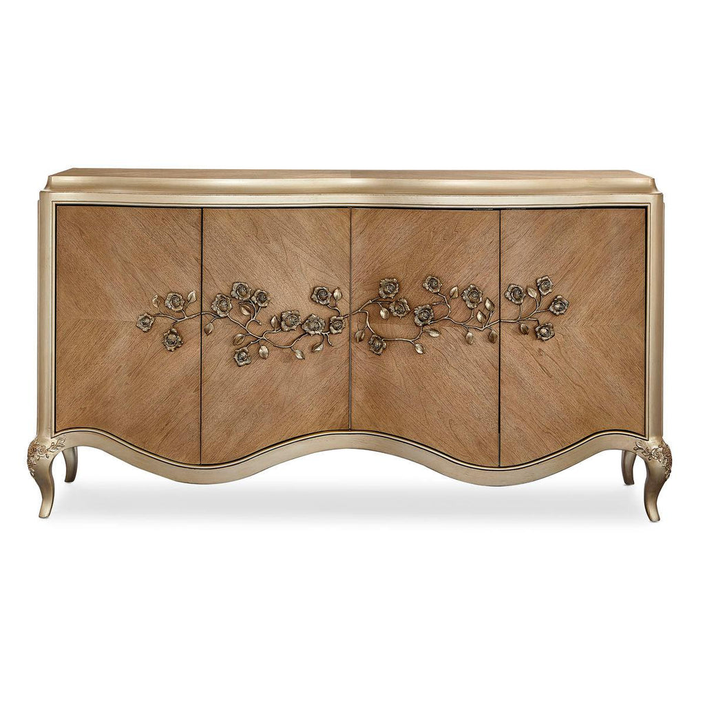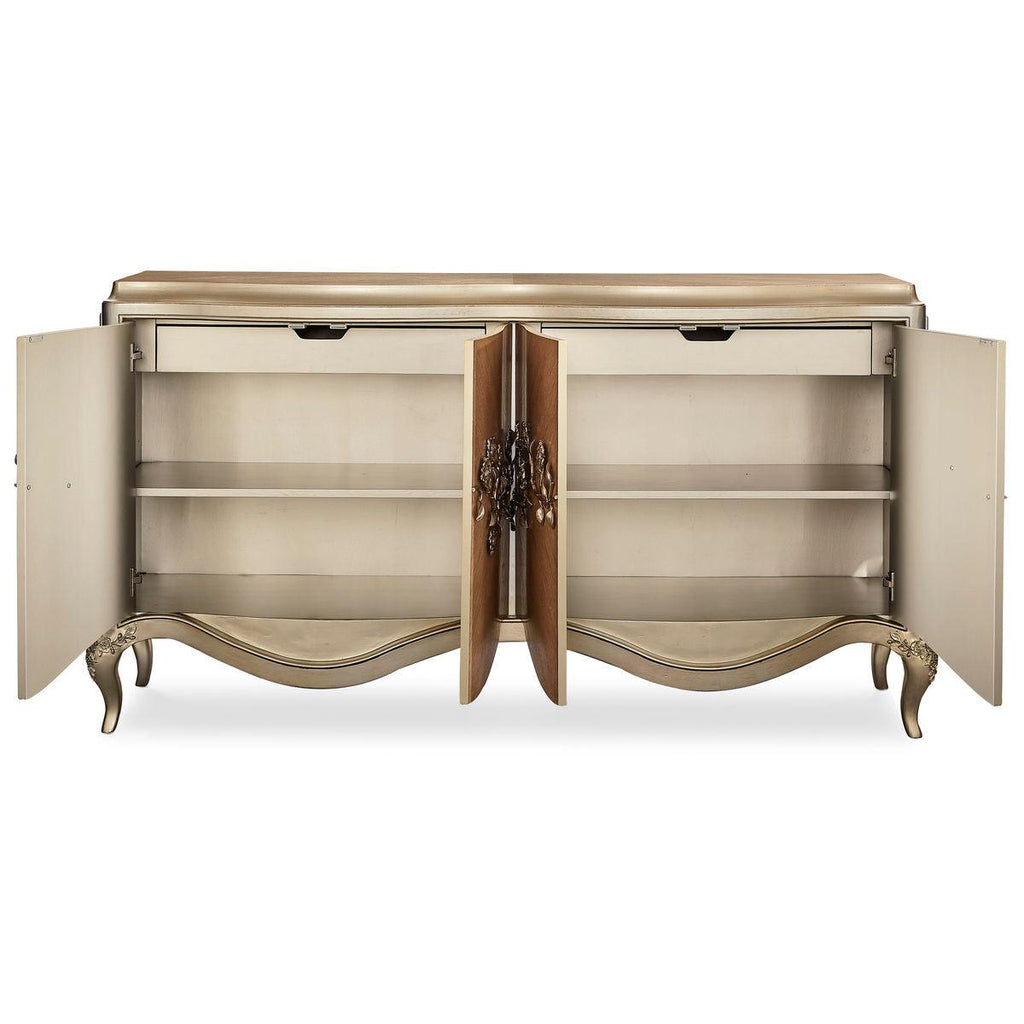 Top, ends and four doors finished in Cendre. Solids finished in Champagne Mist. Decorative vine and flower metal casting on the front of the case had hand-pull locations to open the doors. One drawer and one adjustable shelf behind each pair of doors. Interior in Champagne Mist.