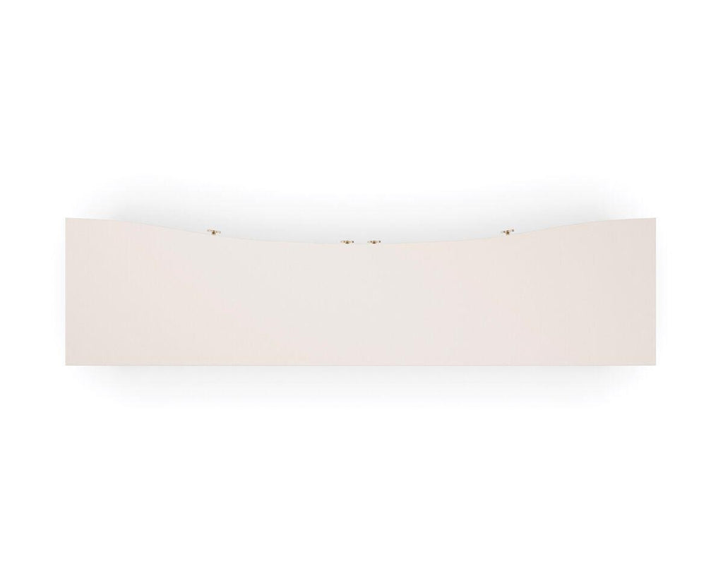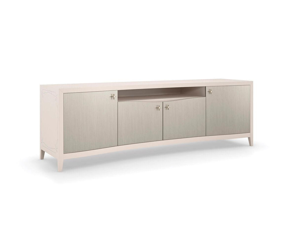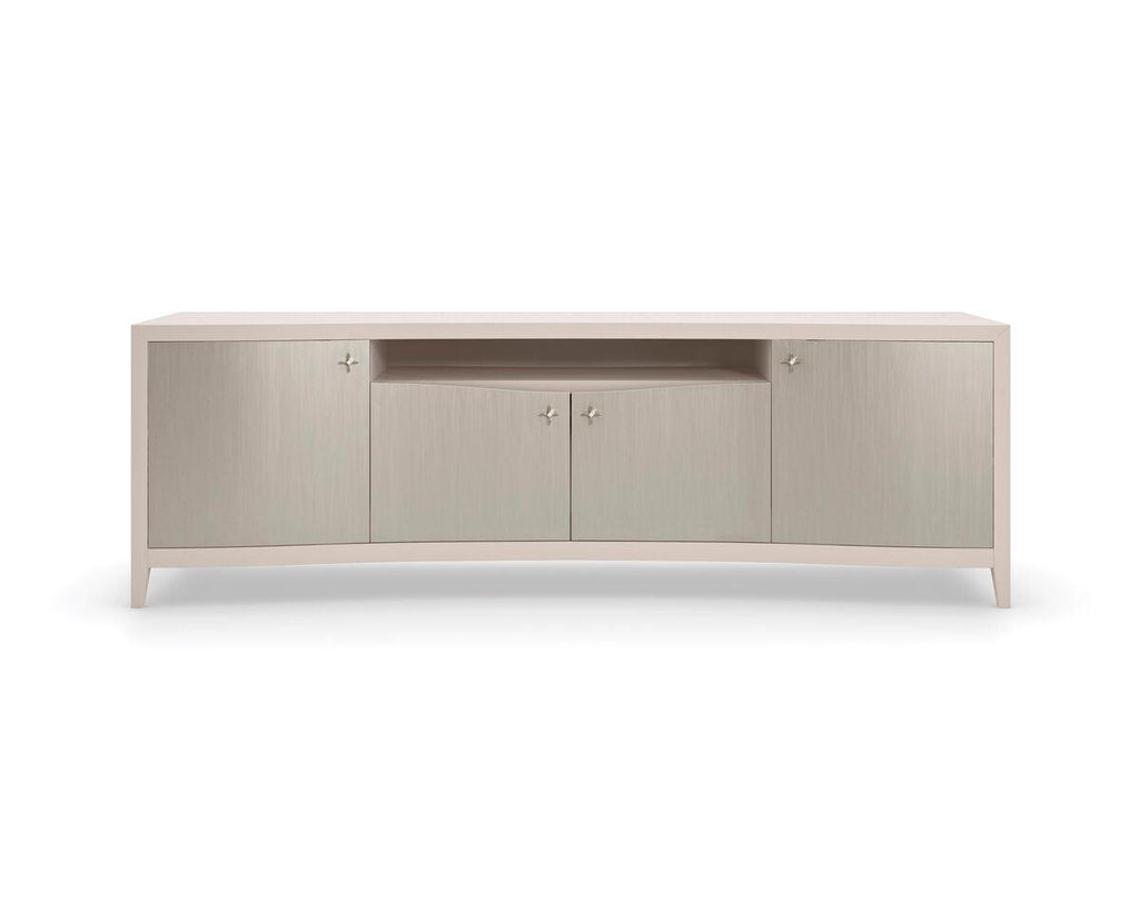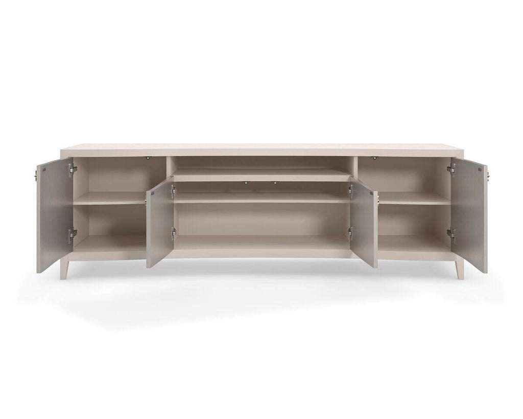 Case finished in Matte Pearl. Glass end panels with screen-printed pinstriping in Soft Silver Paint. Four doors with fronts in Silver Charm. Behind center doors are two adjustable shelves. Behind each outer door is an adjustable shelf. Wire management holes in back panel. Adjustable levelers.