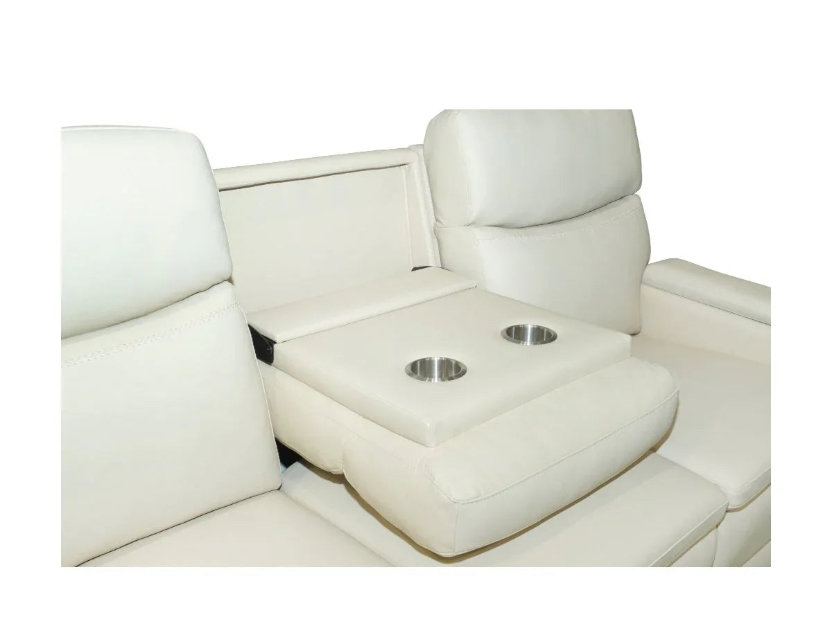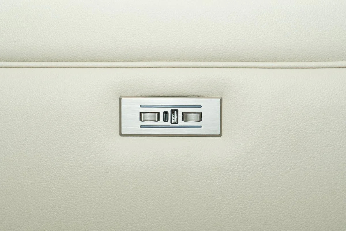 Double power reclining sofa with power recline and power head rests. Features winged split pub back with hidden drop-down table with two cup holders, radius track arms with slimline arm pad and under arm deep storage. Plush pillow top pad over chaise seating with pocketed coil springs. Outside the arms push button controls with USB A & C ports.