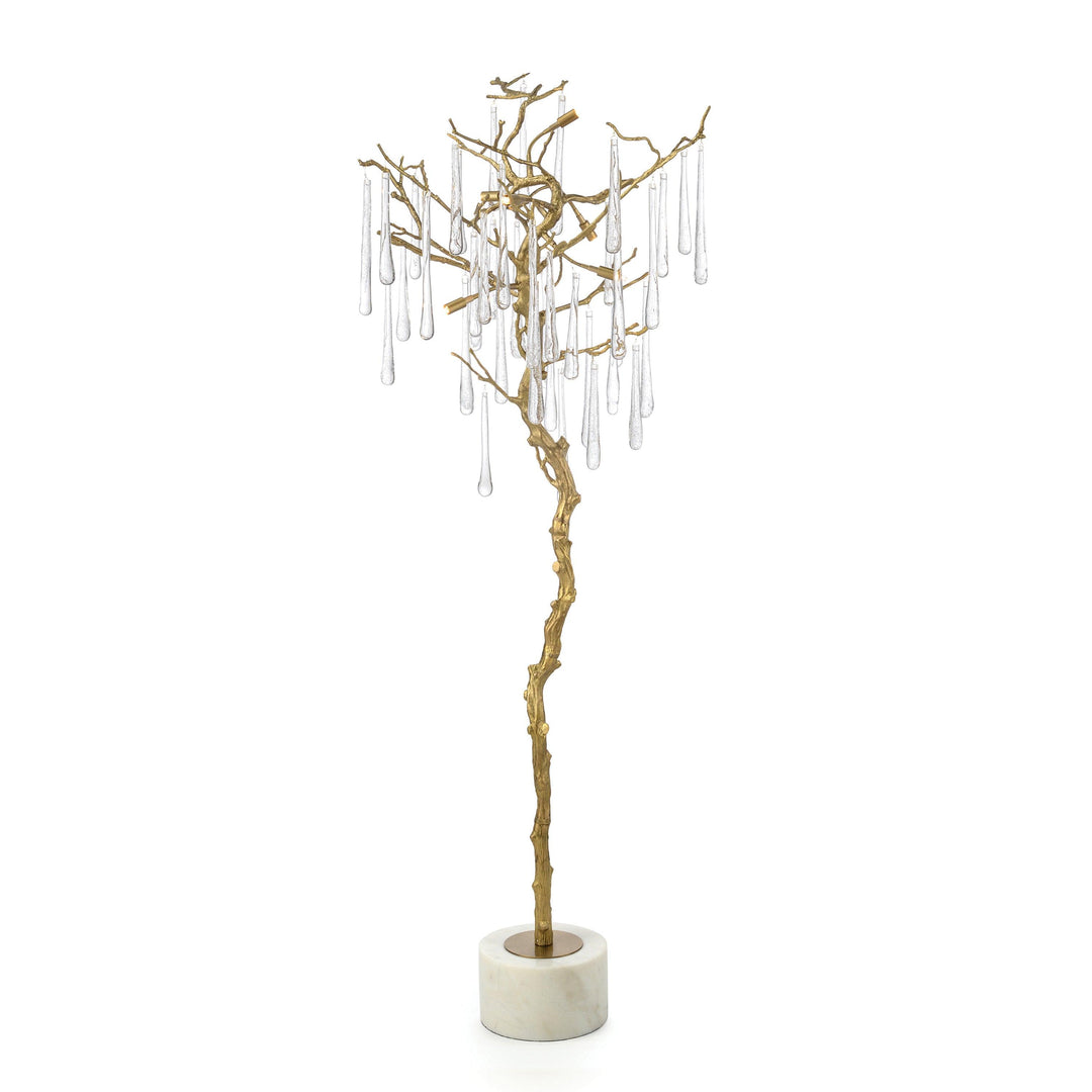 A magnificent floor light of organically formed branches dripping with handblown glass teardrops stands atop a marble base.