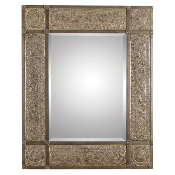 This Ornate Frame Features Heavily Distressed, Golden Champagne Leaf With Black Undertones, Deep Red Dry Brushing And A Heavy, Rusty Tan Wash. Mirror Has A Generous 1 1/4" Bevel And May Be Hung Horizontal Or Vertical.